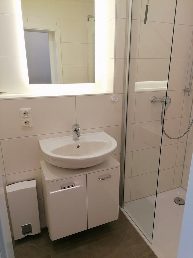 - Badezimmer mit Dusche, WC, Waschbecken, Spiegelschrank