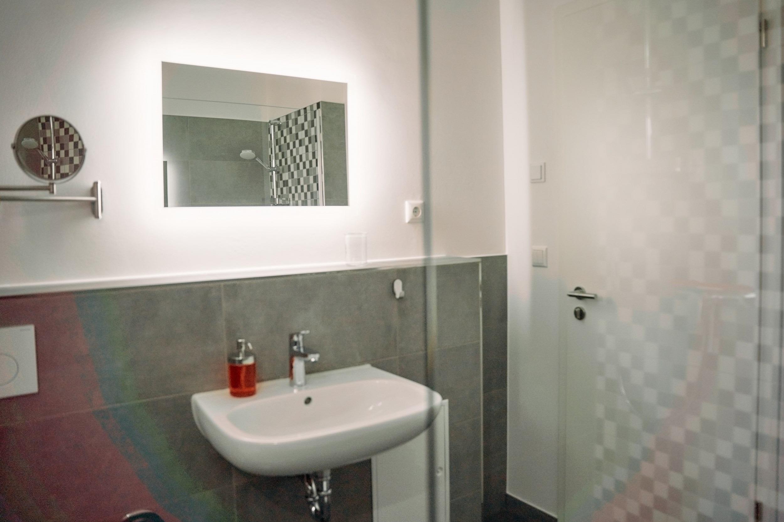 - bodenebene Dusche (90 x 1,20m), WC, Spiegel, Kosmetikspiegel und Ablage