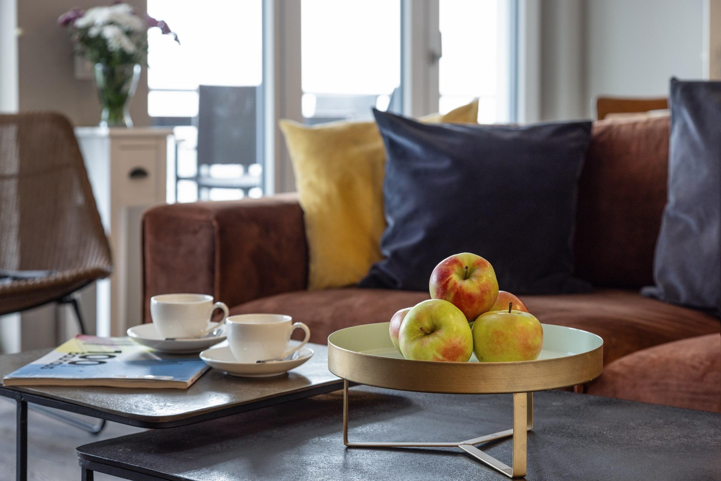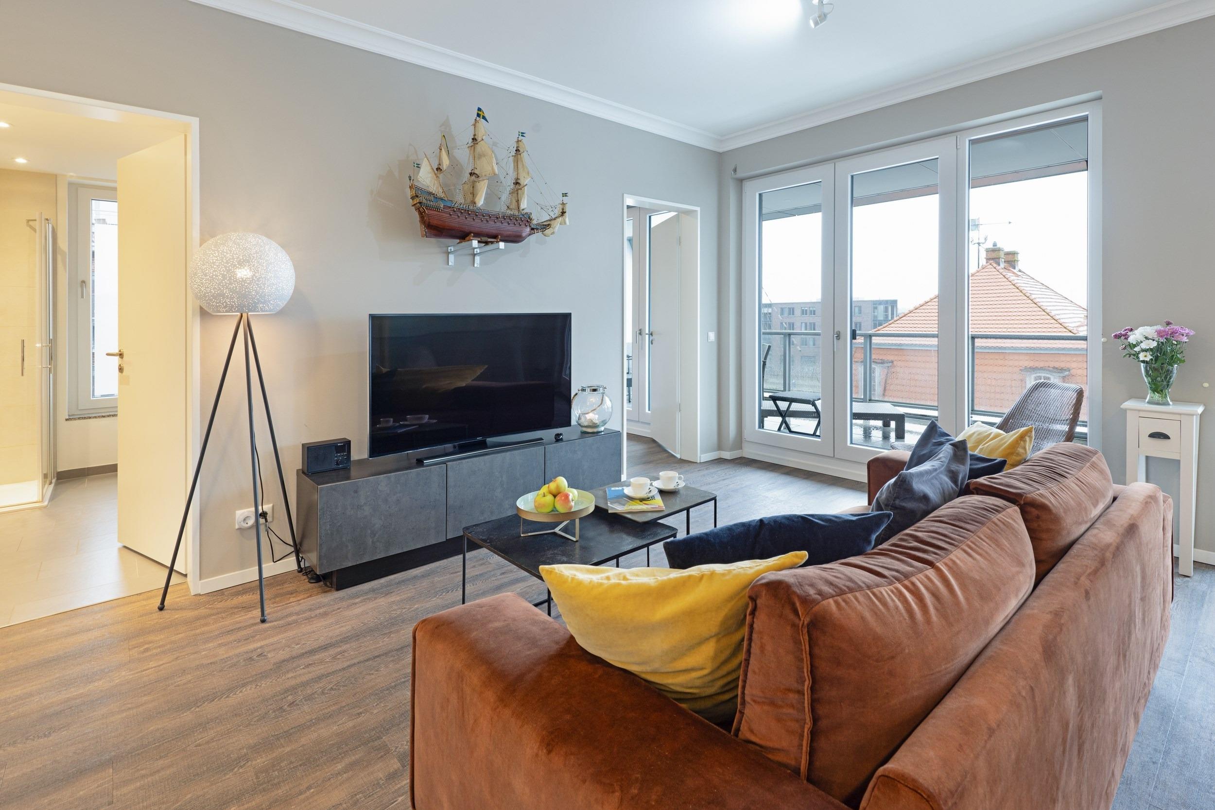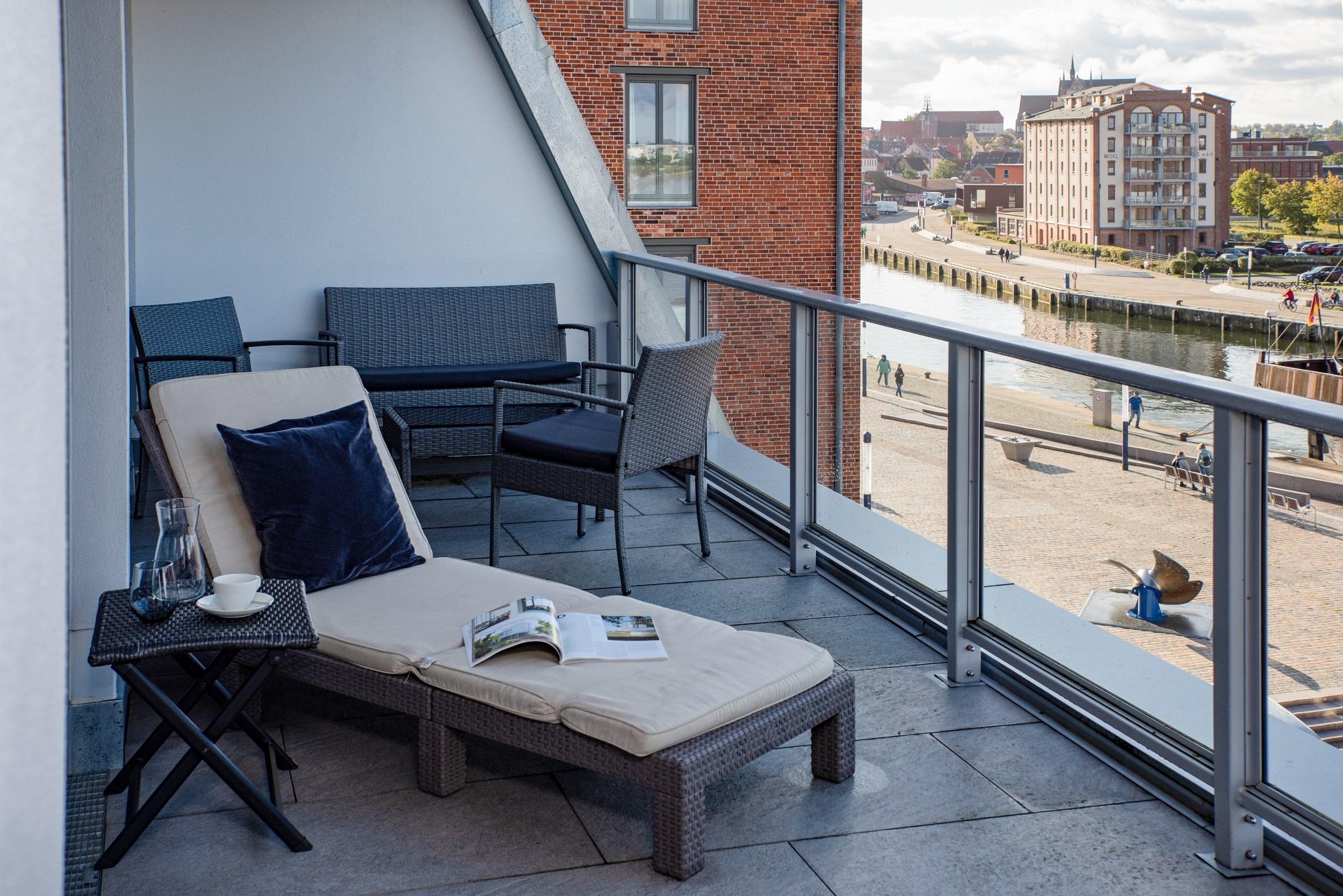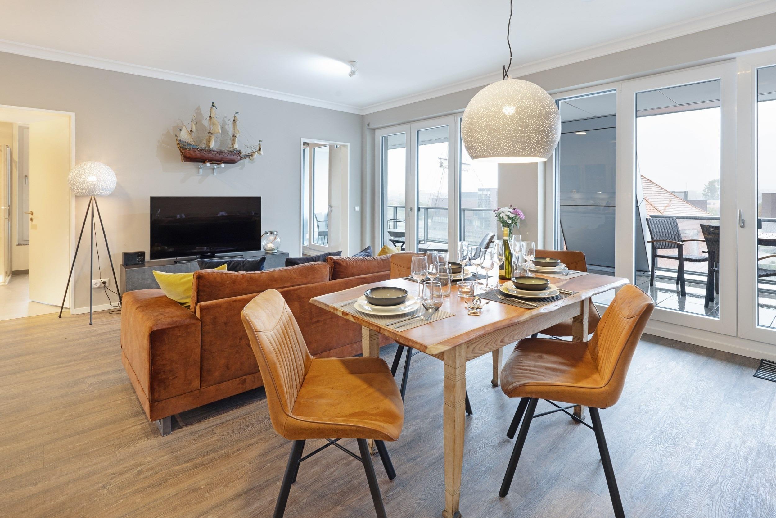 Es empfa¨ngt Sie der mit viel Liebe zum Detail ausgestattete lichtdurchflutete und luftige Wohnbereich mit zwei bodentiefen Doppelflu¨gel- Fenstertu¨ren zur Dachterrasse (Ausfu¨hrung „Stulp“, d. h. vollfla¨chig zu o¨ffnen ohne Mittelpfosten). Auch aus den Schlafzimmern gelangen Sie u¨ber die Doppelflu¨geltu¨ren direkt auf Ihre sichtgeschu¨tzte Sonnenterrasse in Su¨d-West-Lage. Die saisonal mit Lounge-Mo¨beln, bequemen Liegen und einem Esstisch mit vier Stu¨hlen mo¨blierte Loggia la¨dt Sie zum chilligen Ausspannen ein. Freuen Sie sich auf kulinarische Genu¨sse unter freiem Himmel, genießen Sie den lauen Sommerabend mit spektakula¨rer Aussicht bei einer sanften Brise und einem ku¨hlen Getra¨nk. Da Sie direkt im Alten Hafen logieren, ko¨nnen Sie auf der Terrasse je nach Windrichtung dem Rauschen des Meeres lauschen. Riechen und schmecken Sie unsere wohltuende Meeresbrise. Das Terrassenmobiliar inklusive passender Auflagen steht Ihnen ganzja¨hrig zur Verfu¨gung.