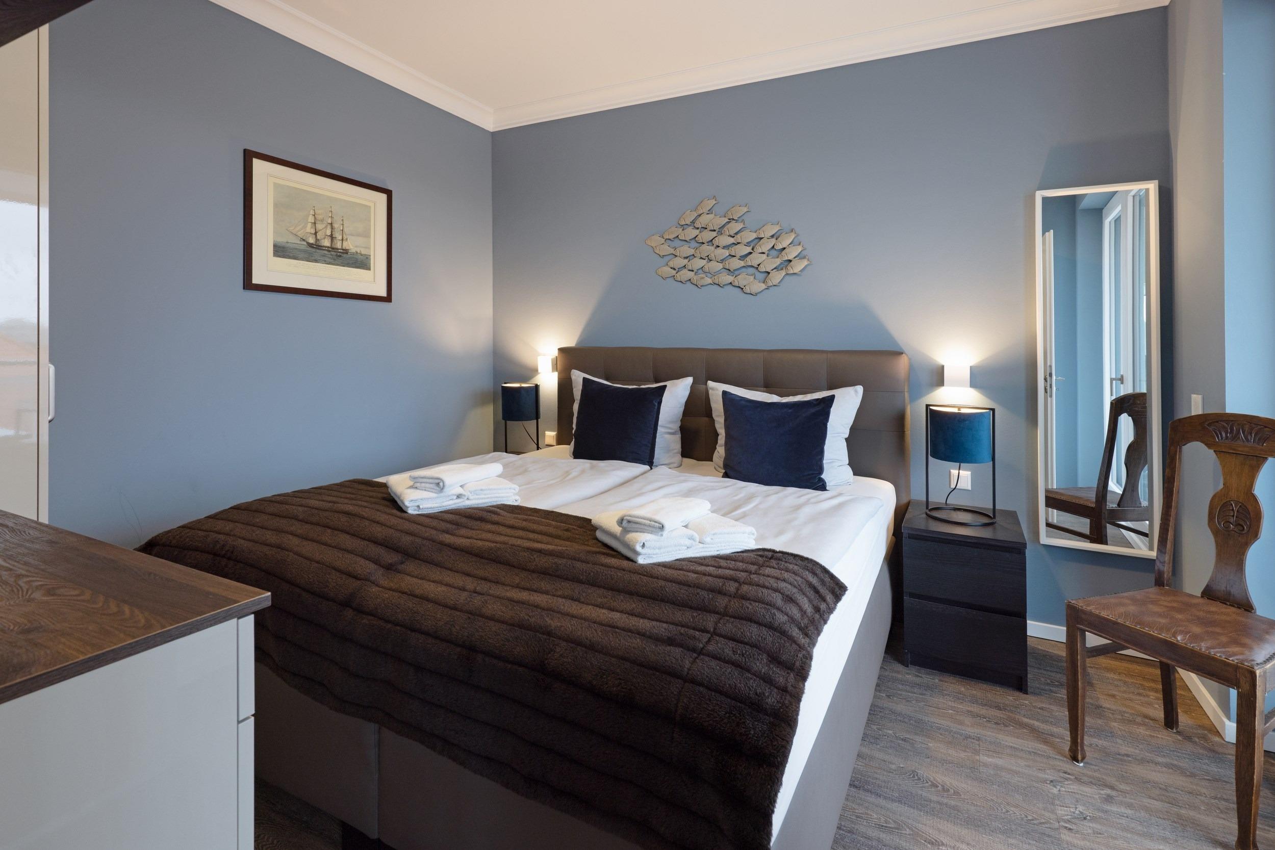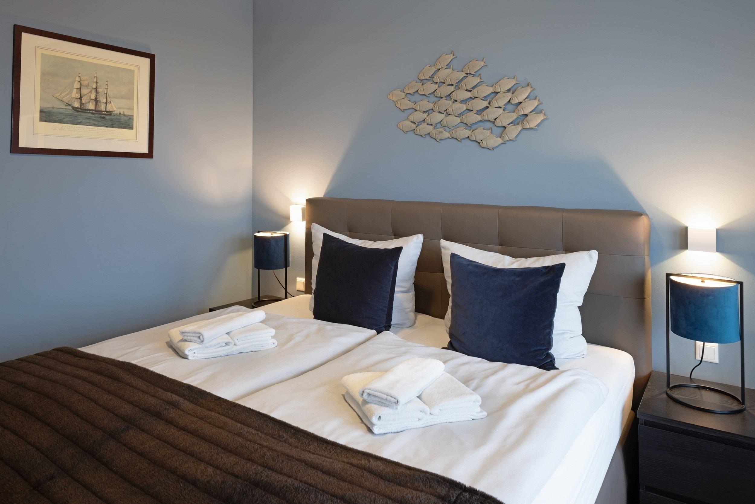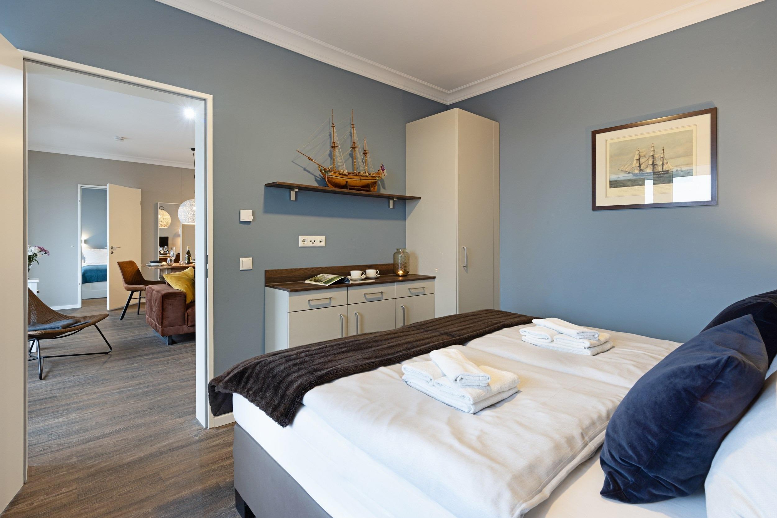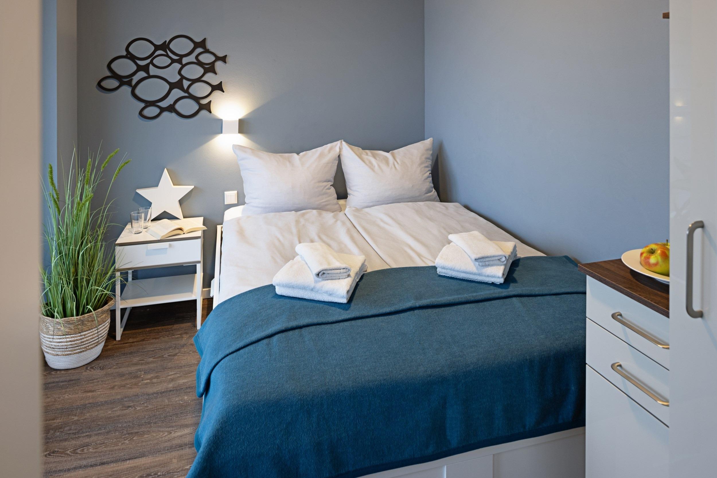 Bei uns wohnen Sie in der ersten Reihe in einmaliger Bestlage. Hier fa¨ngt Ihr Urlaub schon beim Aufschließen der Wohnungstu¨r an - eine Ferienwohnung fu¨r anspruchsvolle Genießer. Die optimal geschnittene, stylisch-behagliche Wohneinheit liegt im obersten Deck und wurde fu¨r Sie im nordisch-maritimen Stil eingerichtet. Hochwertige Materialien und Ausstattungselemente schaffen ein ausgleichendes und harmonisches Ambiente. Mit zwei separaten vollausgestatteten Schlafra¨umen bieten wir Ihnen auf gera¨umigen 66 m2 Wohnfla¨che viel Platz fu¨r bis zu 4 Ga¨ste. Den unbezahlbaren Blick auf den Hafen und das Meer ko¨nnen Sie in allen Aufenthaltsra¨umen genießen, in den Schlafzimmern sogar im Liegen. Die großartige teilu¨berdachte Loggia mit 24 m2 Aussichts- und Erholungsfla¨che im ho¨chsten Geschoss verwo¨hnt Sie mit einem atemberaubenden 180°Panorama-Ausblick aus luftiger Ho¨he u¨ber den gesamten Alten Hafen. An Backbord verfolgen Sie das Geschehen an der lebhaften Hafenpromenade vom gotischen „Wassertor“, dem alten Hafentor im Nordwesten des historischen Stadtkerns der Stadt, u¨ber den Liegeplatz der „Wissemara“, unserer beru¨hmten originalgetreuen Replik einer mittelalterlichen Hansekogge, bis hin zum bekannten Museum „Baumhaus“, von wo aus fru¨her die Hafeneinfahrt mit einer Sperrkette aus Baumstämmen vor Gefahren geschu¨tzt wurde. Steuerbords schweift Ihr Blick u¨ber den Alten Hafen hinaus bis weit hinein in die Wismarer Bucht. Erfreuen Sie sich bei Meereskla¨ngen und leichter Salzbrise an den ein- und ausfahrenden Schiffen und genießen Sie wohltuenden Sonnenschein bis weit in die Abendstunden. Erleben Sie grandiose Ausblicke u¨ber den Da¨chern von Wismar. Was ko¨nnte es Scho¨neres geben, als Ihren Morgen an der Ostsee unter freiem Himmel mit duftendem Kaffee und frischen Bro¨tchen zu beginnen und Ihren entspannten Urlaubstag spa¨ter bei einem erlesenen Wein gelassen in der Abendsonne ausklingen zu lassen?