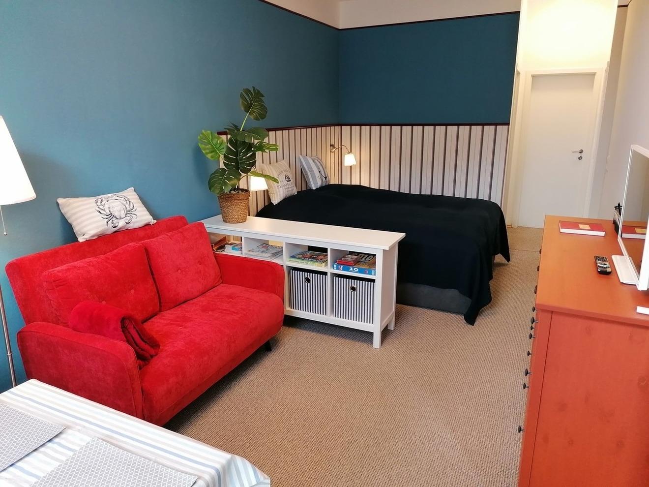 Die Größe der Wohnung beträgt 33 m² und besteht aus einem Wohn-Schlafzimmer, einem geräumigen Duschbad und einer voll ausgestatteten separaten Küche. Aufbettung mit einer Klappcouch ist möglich.