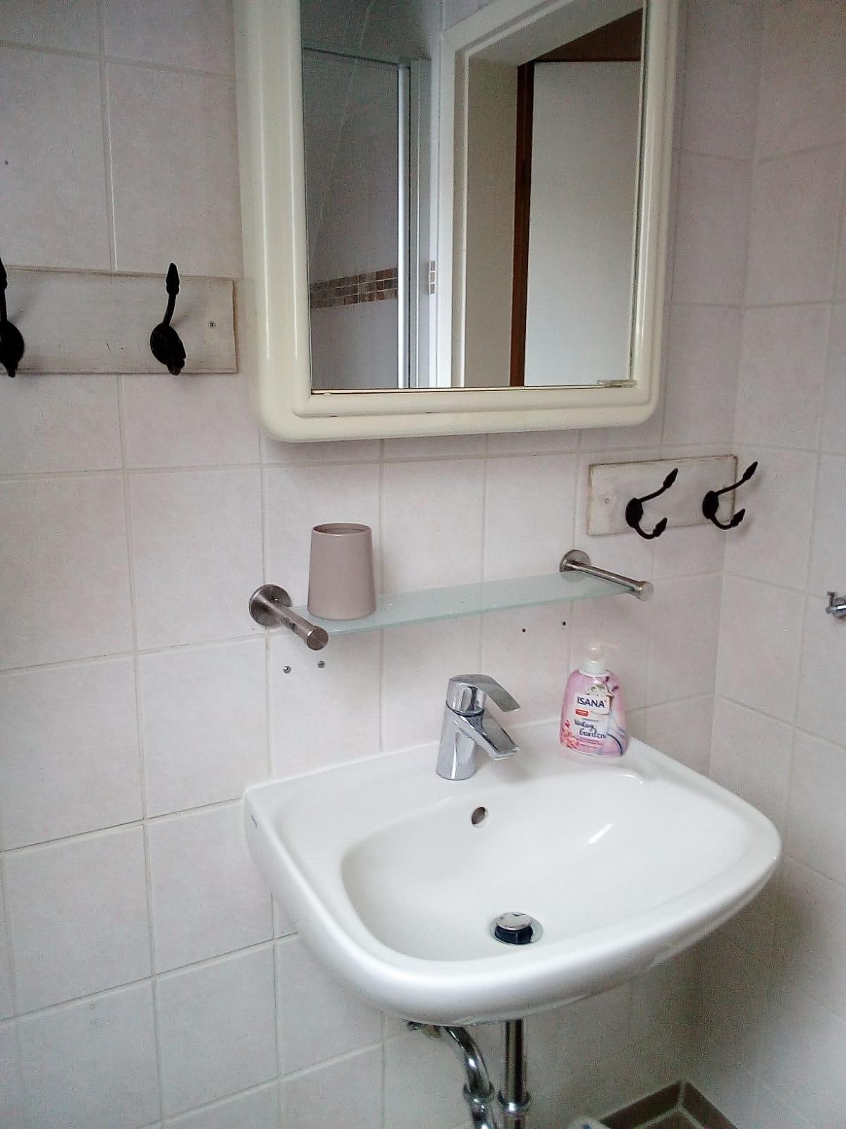 Separater Eingang und steile Holztreppe ins 1. Obergeschoss. Ein Treppenschutzgitter bietet Sicherheit für kleine Besucher. 2 Schlafräume und 1 Wohn/Schlafraum mit Küchenzeile, Badezimmer mit Dusche/WC und Fön.