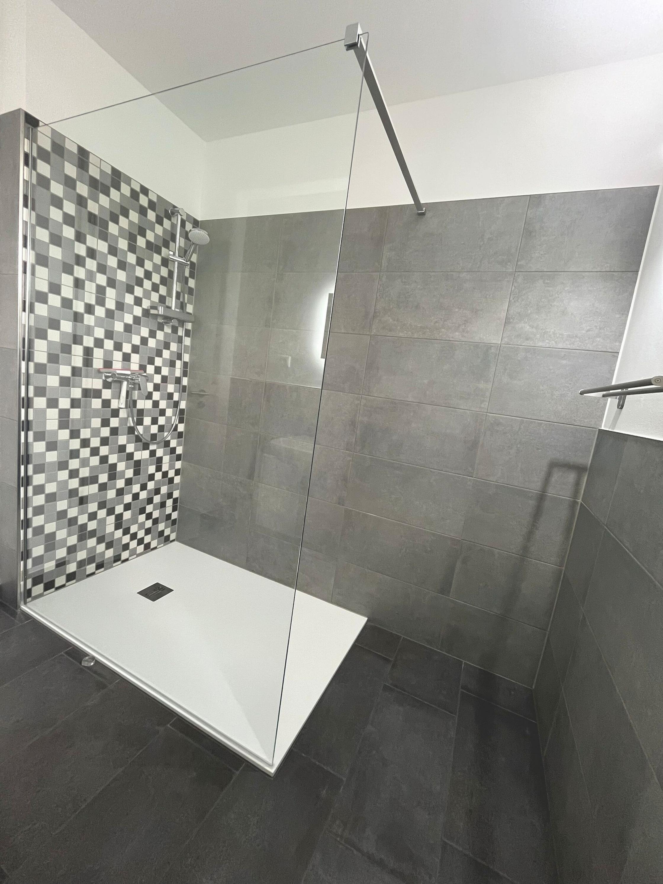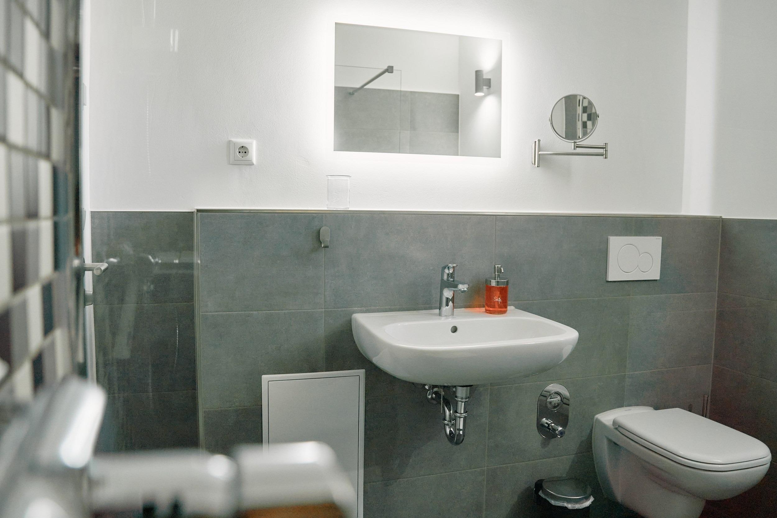 - bodenebene Dusche (90 x 1,20m), WC, Spiegel, Kosmetikspiegel und Ablage