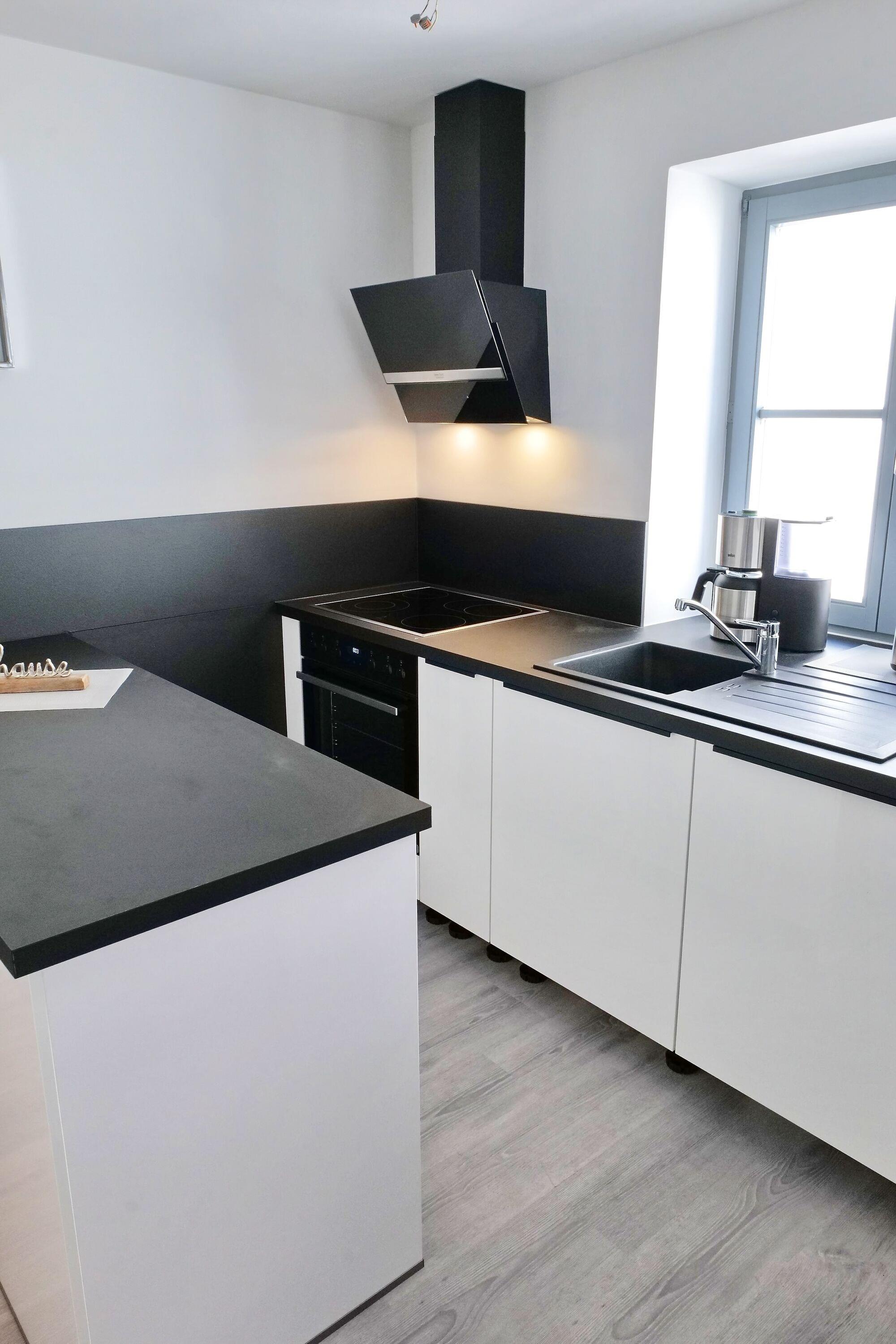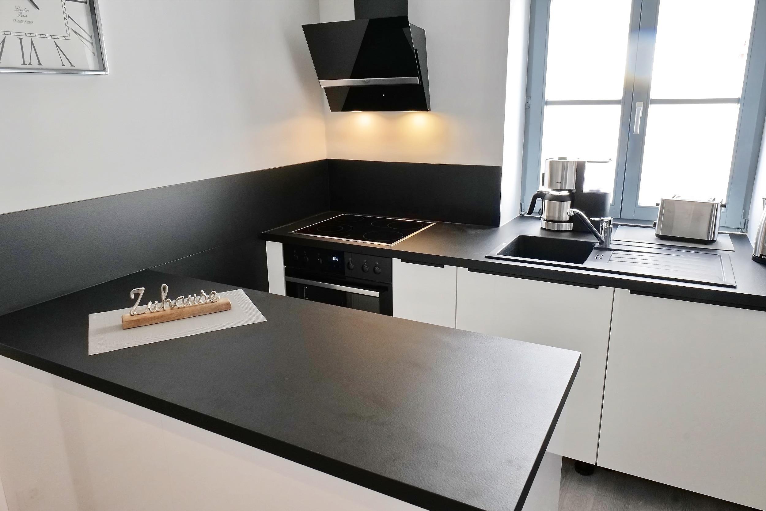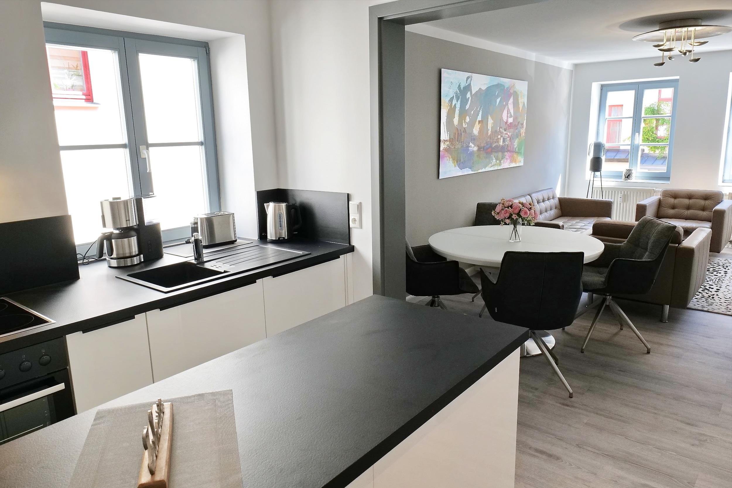 Moderne Küche mit Backofen, Ceranherd, Wasserkocher, Kaffeemaschine, Geschirrspüler, Kühlschrank, Toaster, Geschirr, Gläser, Besteck uvm..