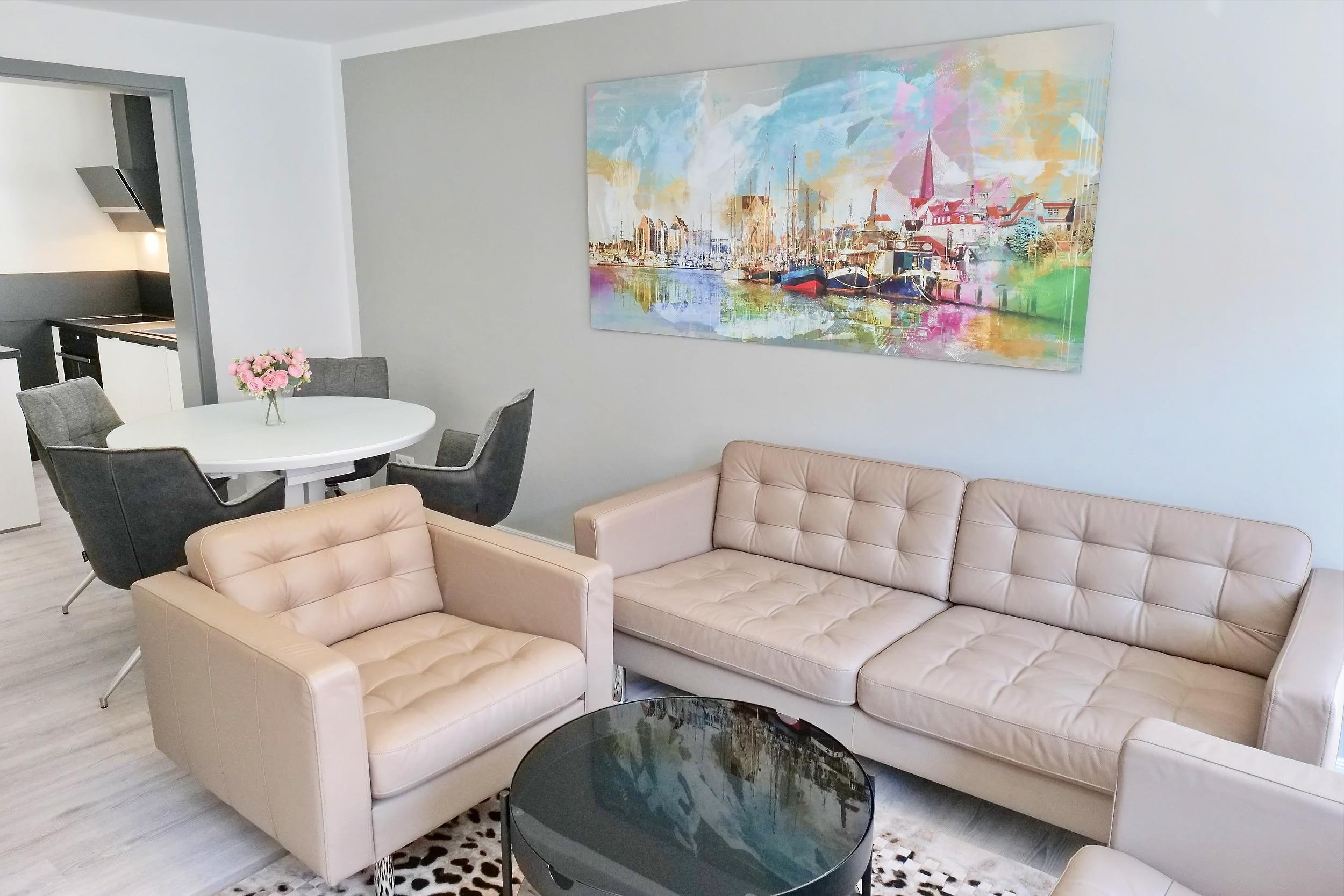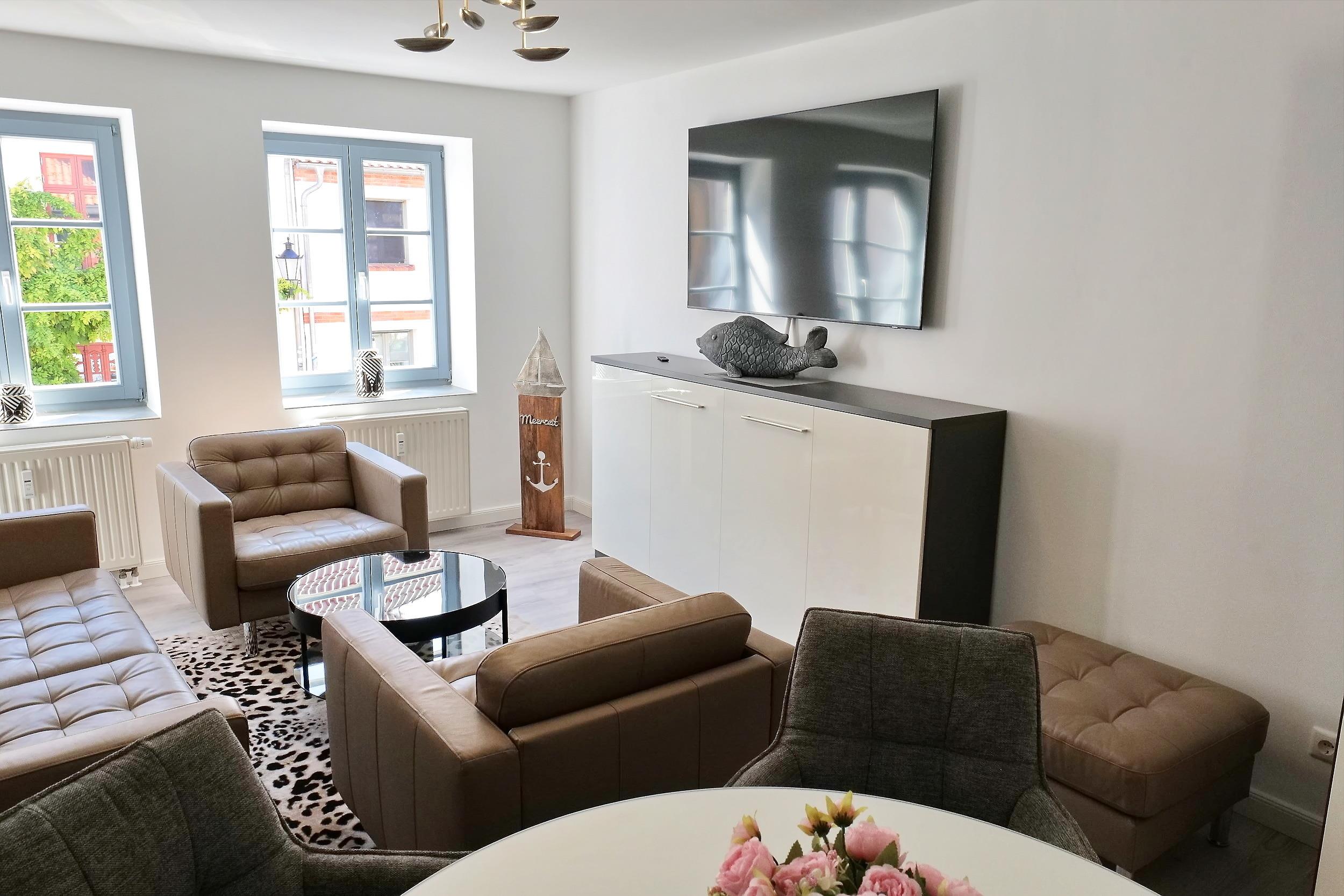 Stilvolles Wohnzimmer mit Couch, (nutzbar als Schlafcouch für 1 Person), 2 Sessel, Low-board umklappbar zum Schlafbett für 1 Person,[nbsp] großer Flat-TV, Sonos-Lautsprecher.