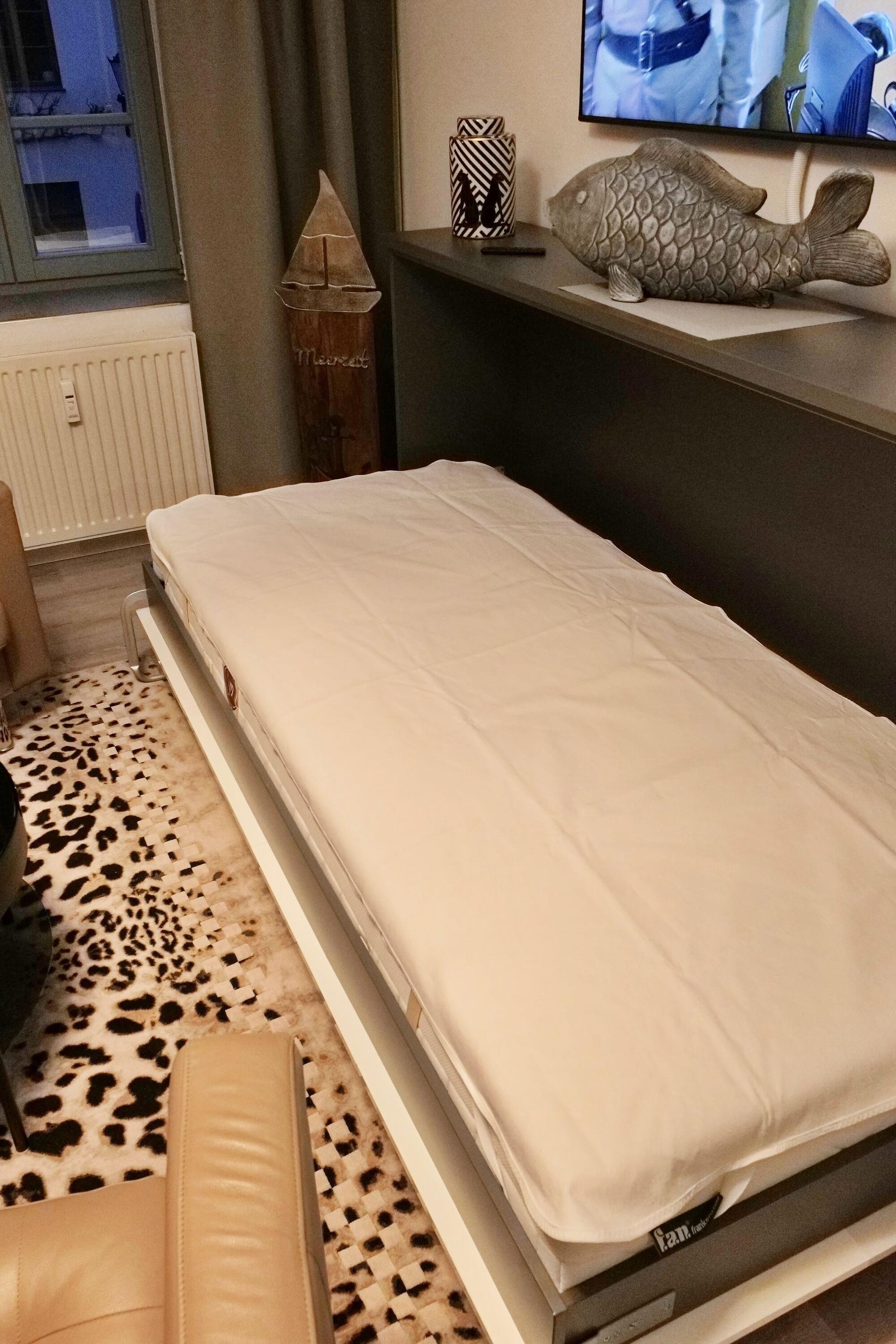 1 Schlafzimmer getrennt durch große Tür vom Wohnzimmer mit großem Boxspringbett (1,80 x 2,00 m), sowie ausreichend Stauraum für Ihre Kleidung. Hochwertige Biobettdecken und Kopfkissen allergikergeeignet.