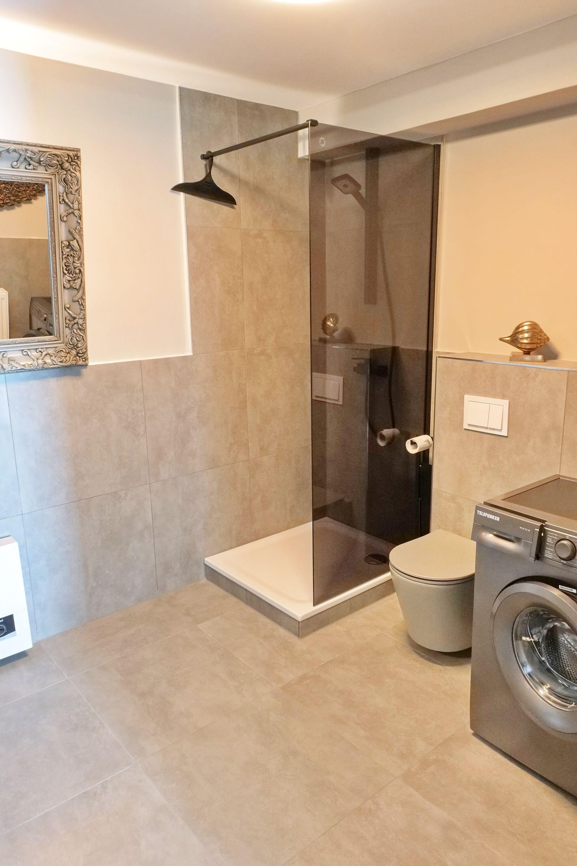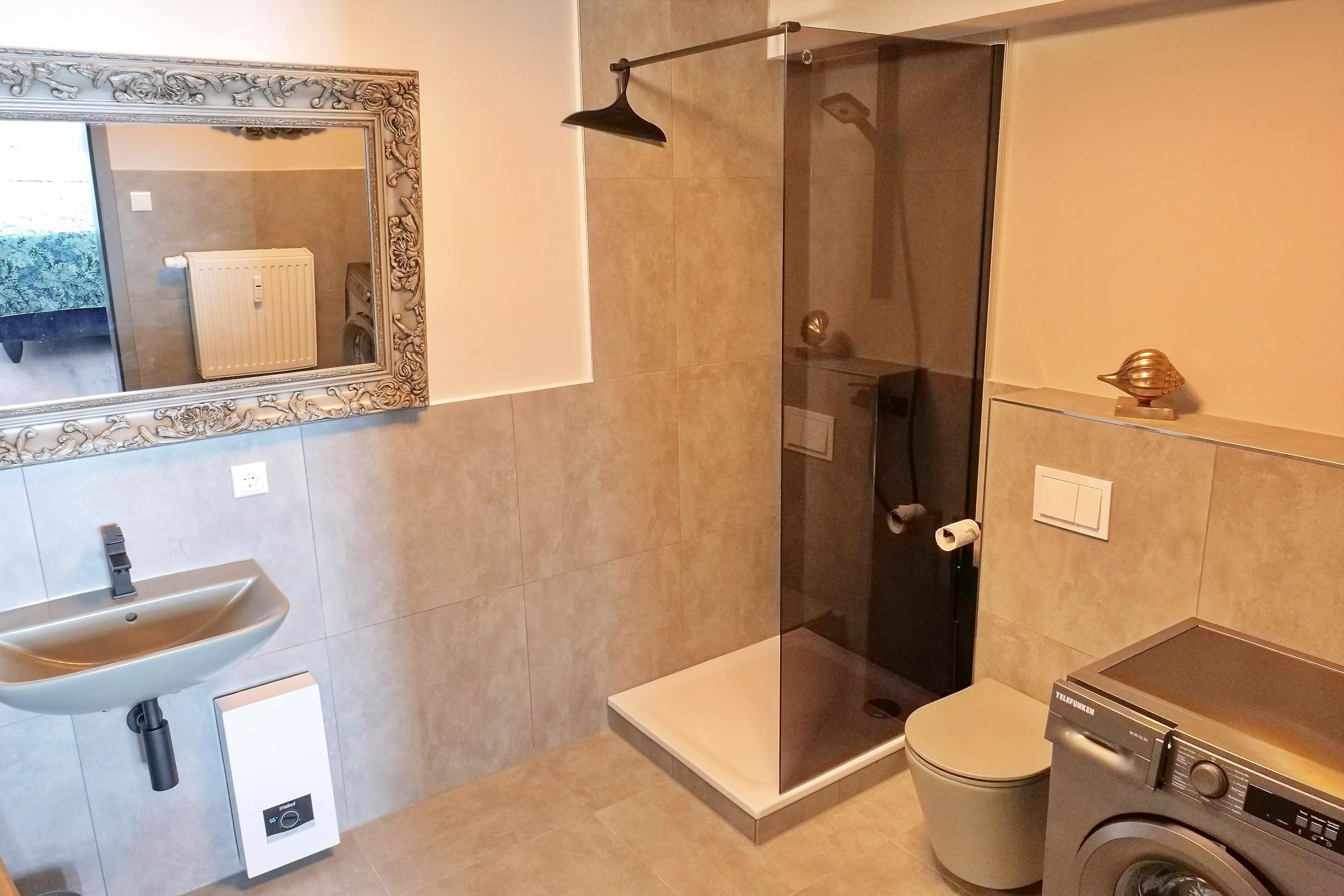 Schickes Badezimmer mit Dusche, WC, Spiegel und ausreichend Ablagefläche für Ihre Beautyutensilien. Eine Waschmaschine und ein Wäscheständer sind vorhanden.