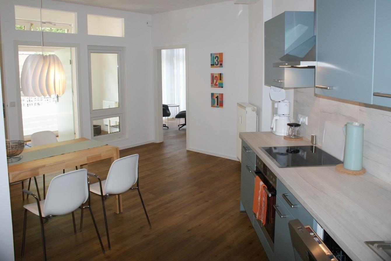 - Küche mit Essbereich ausgestattet mit Geschirrspüler, Backofen, Ceranfeld, Kühlschrank, Kaffeemaschine, Wasserkocher, Toaster, Geschirr, Besteck, Gläser uvm.
