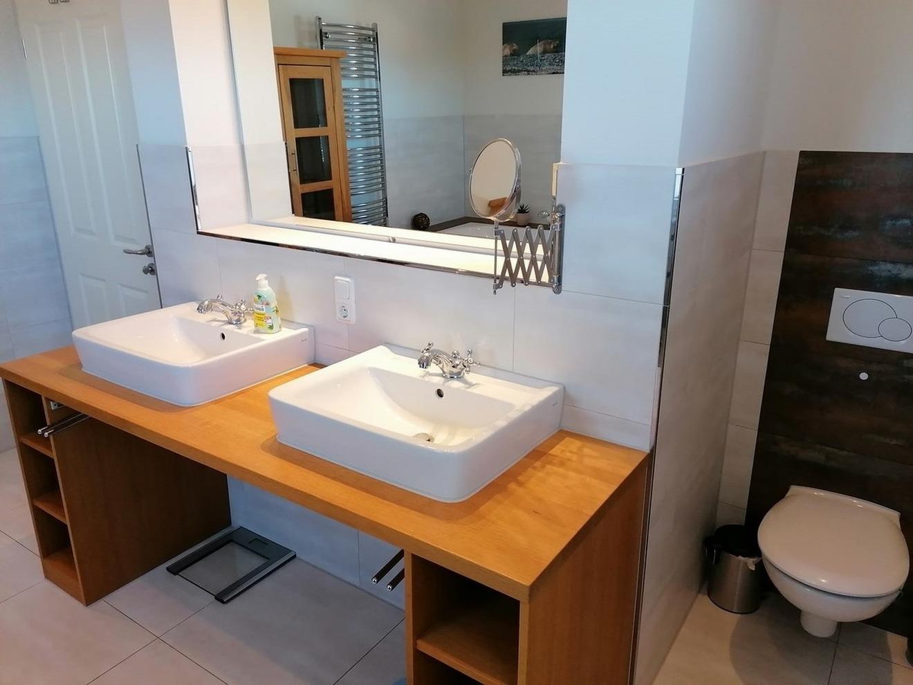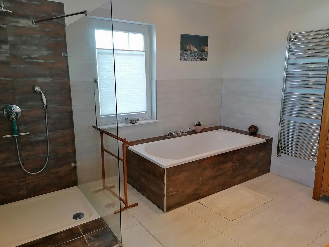 - Vollbadezimmer mit Badewanne, Dusche, WC, großen Spiegelschrank, Radio