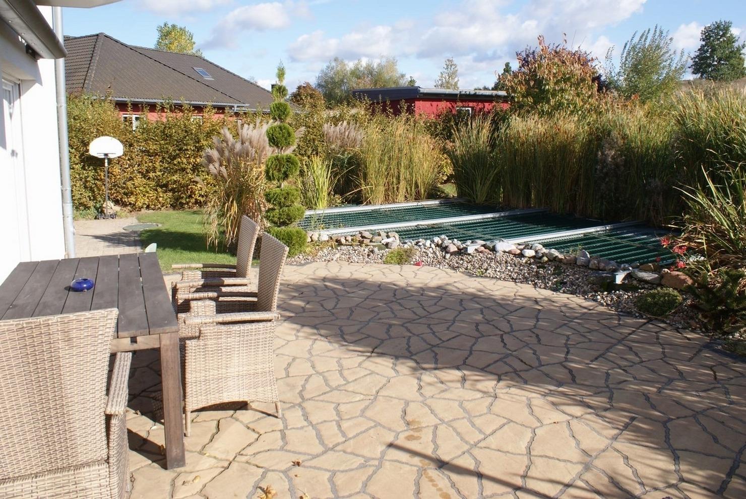 - große Terrasse mit Essbereich, Sonnenliege, Gartenteich (kindergesichert)
