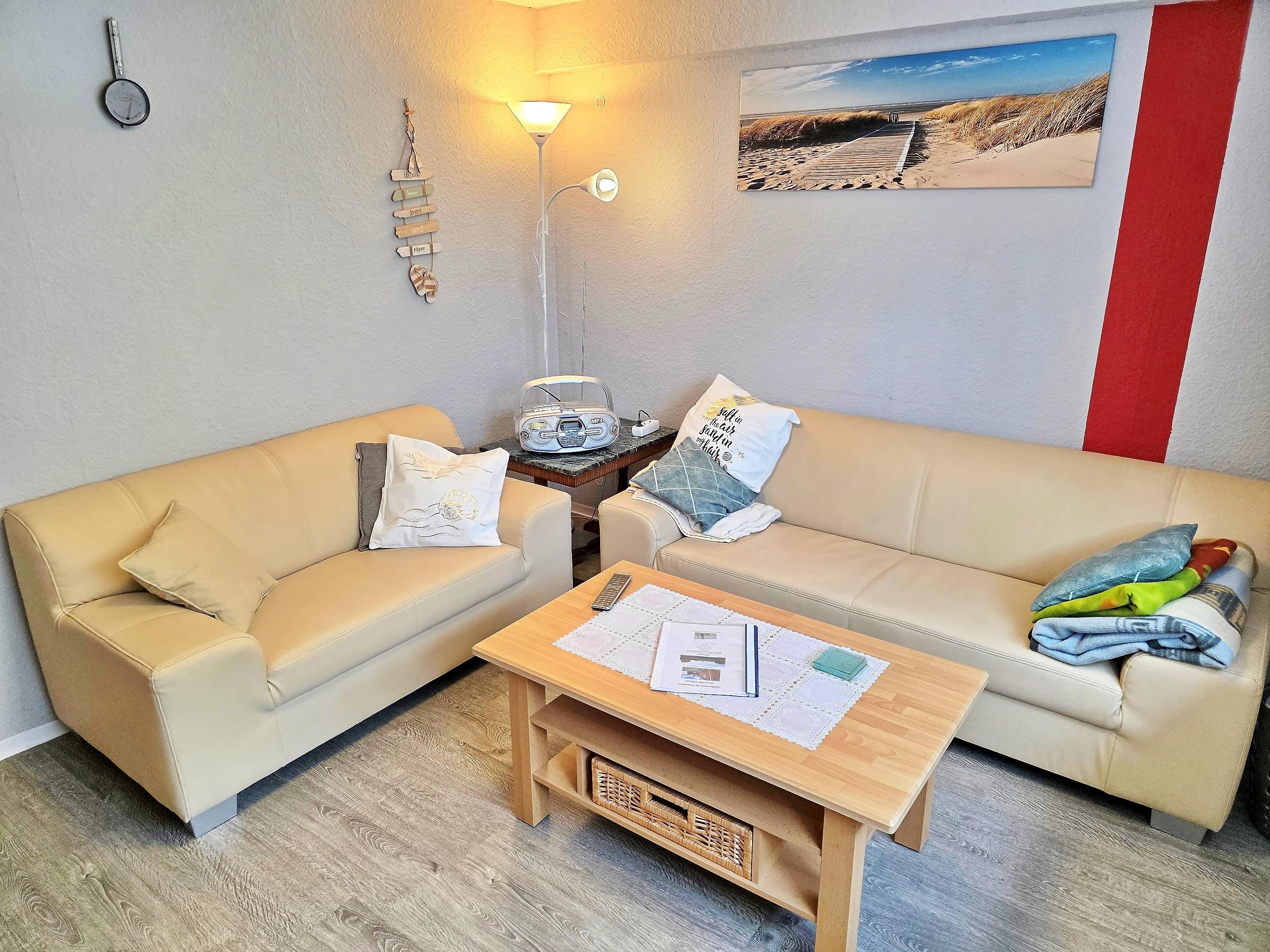 Wohnwand, TV, CD-Radio, Sitzgruppe Leder für 6 Personen, Couchtisch, Gesellschaftsspiele.