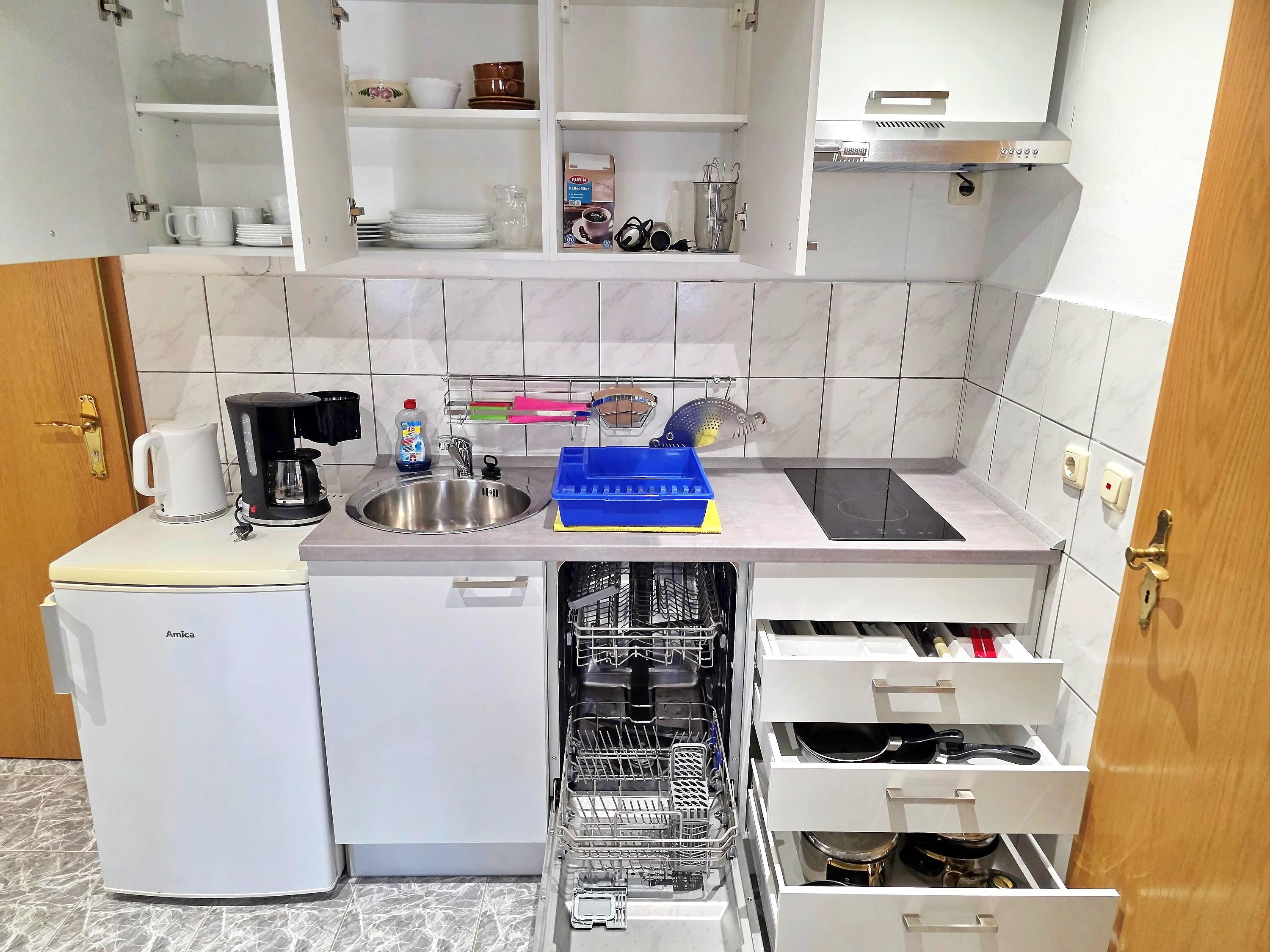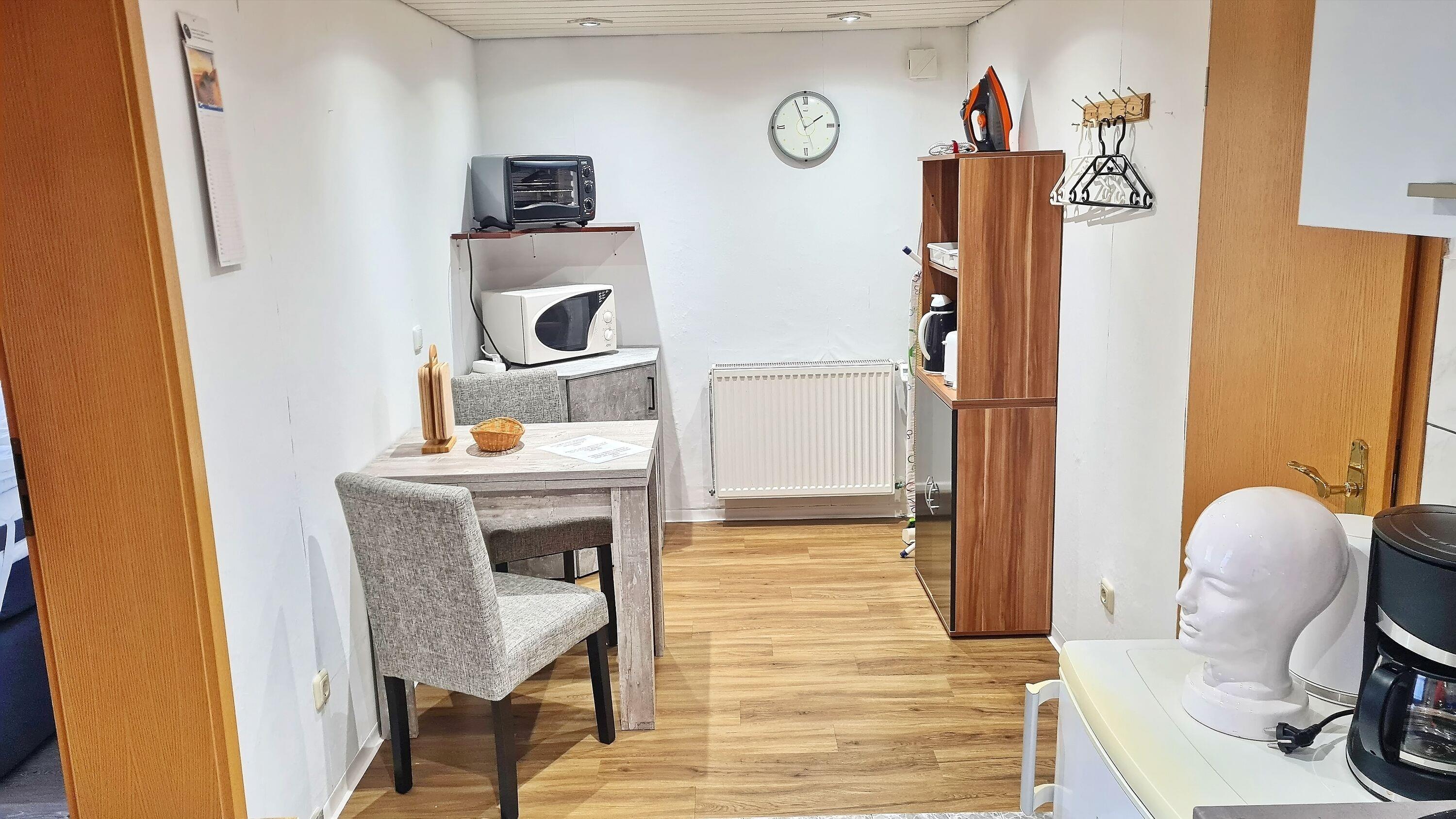 Küchenzeile mit Geschirrspüler, Kühlschrank mit Gefrierfach, Doppelkochfeld, Dunstabzug, Minibackofen, Mikrowelle, Toaster, Kaffeemaschine (Filtergröße 2), Wasserkocher, Stabmixer, Handrührgerät, Waffeleisen, diverse Kochtöpfe und Pfannen, ausreichend Geschirr, Gläser und Besteck, Kochutensilien wie Schneebesen, Pfannenwender, Salatbesteck, Schüsseln, etc. Mülleimer, Handfeger und Kehrblech, sowie Geschirrtücher sind ebenfalls vorhanden. Kleiner Esstisch mit 2 Stühlen, Garderobenhaken, Bügeleisen und Bügelbrett, Staubsauger, Putzeimer, Schrubber, usw.