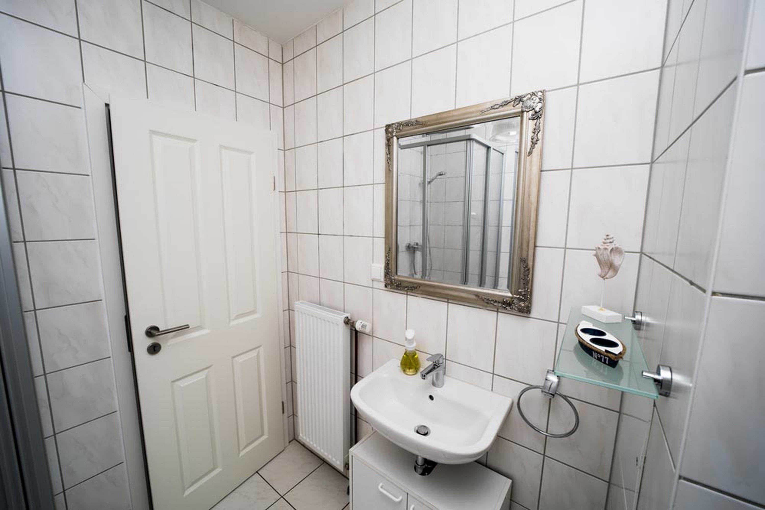 - Badezimmer mit Dusche, Waschtisch und Toilette