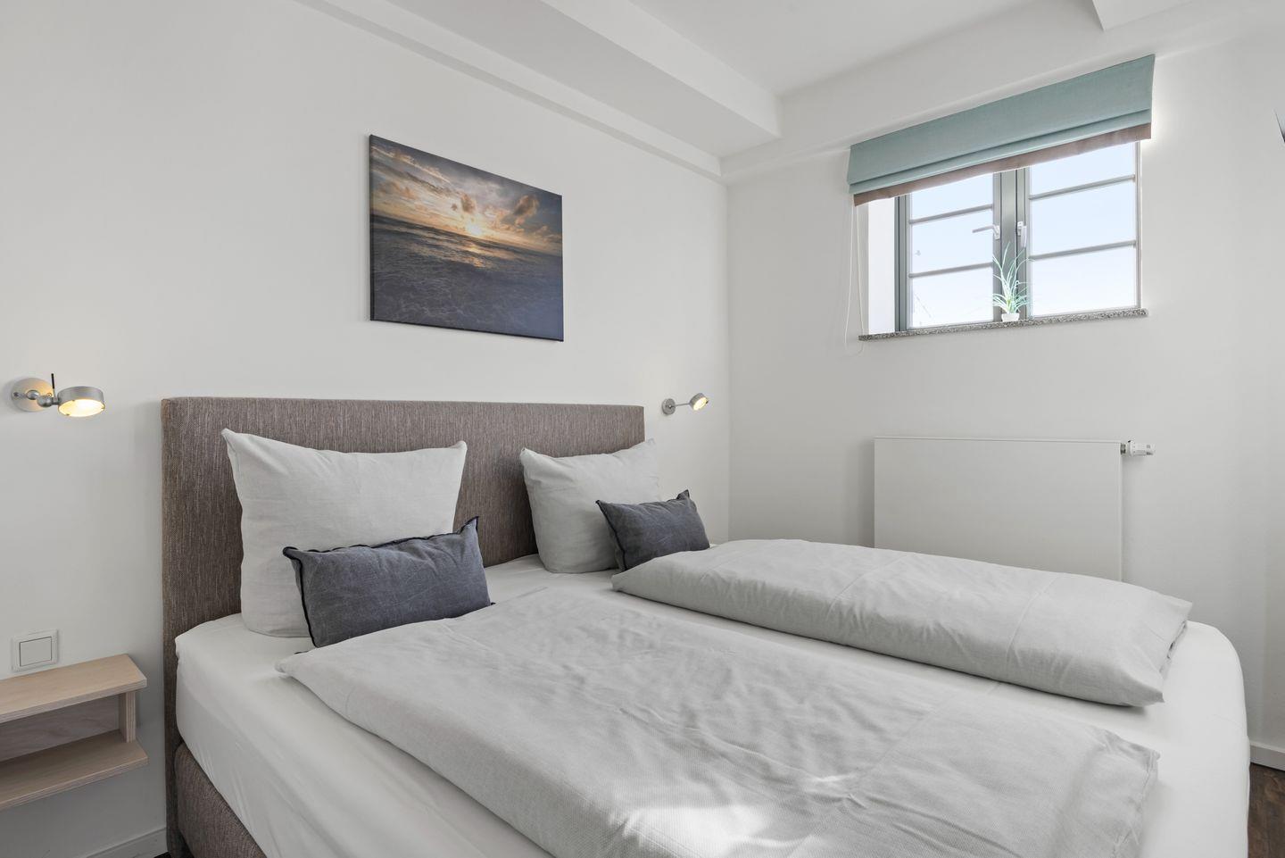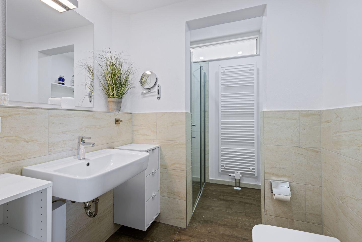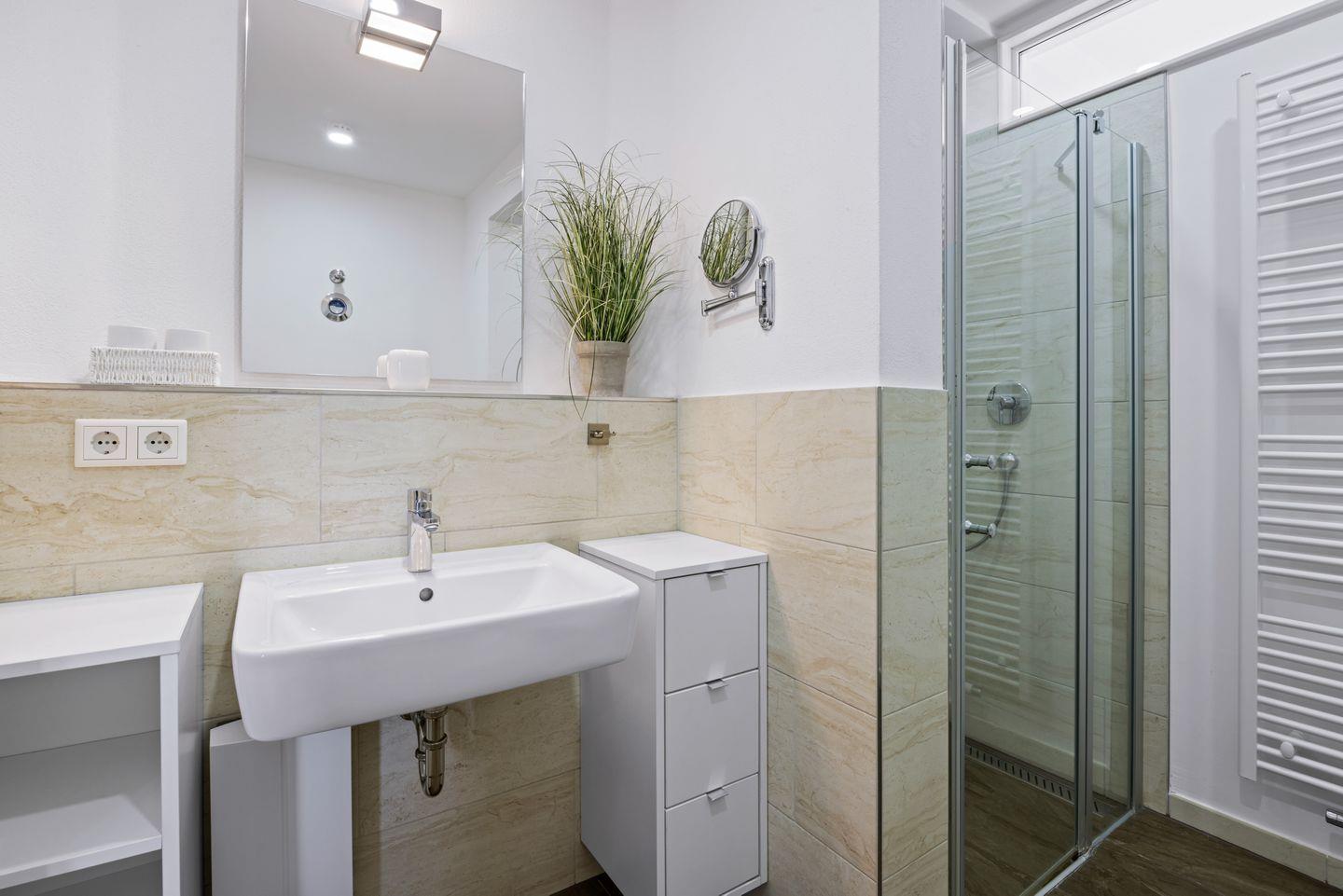 Das geschmackvolle Badezimmer mit Fußbodenheizung und Oberlicht verfügt über eine ebenerdige Dusche, Waschbecken, WC, Handtuchwärmer, Kosmetikspiegel und Föhn. Zwei separate Schlafzimmer bieten euch jeweils ein komfortables Boxspring-Doppelbett (1,80 x 2,00 m) und Flatscreen-TV (43 Zoll). Vom Balkon in Nord-West-Lage aus habt ihr einen einzigartigen Ausblick auf den Hafen und die Wismarer Bucht!.