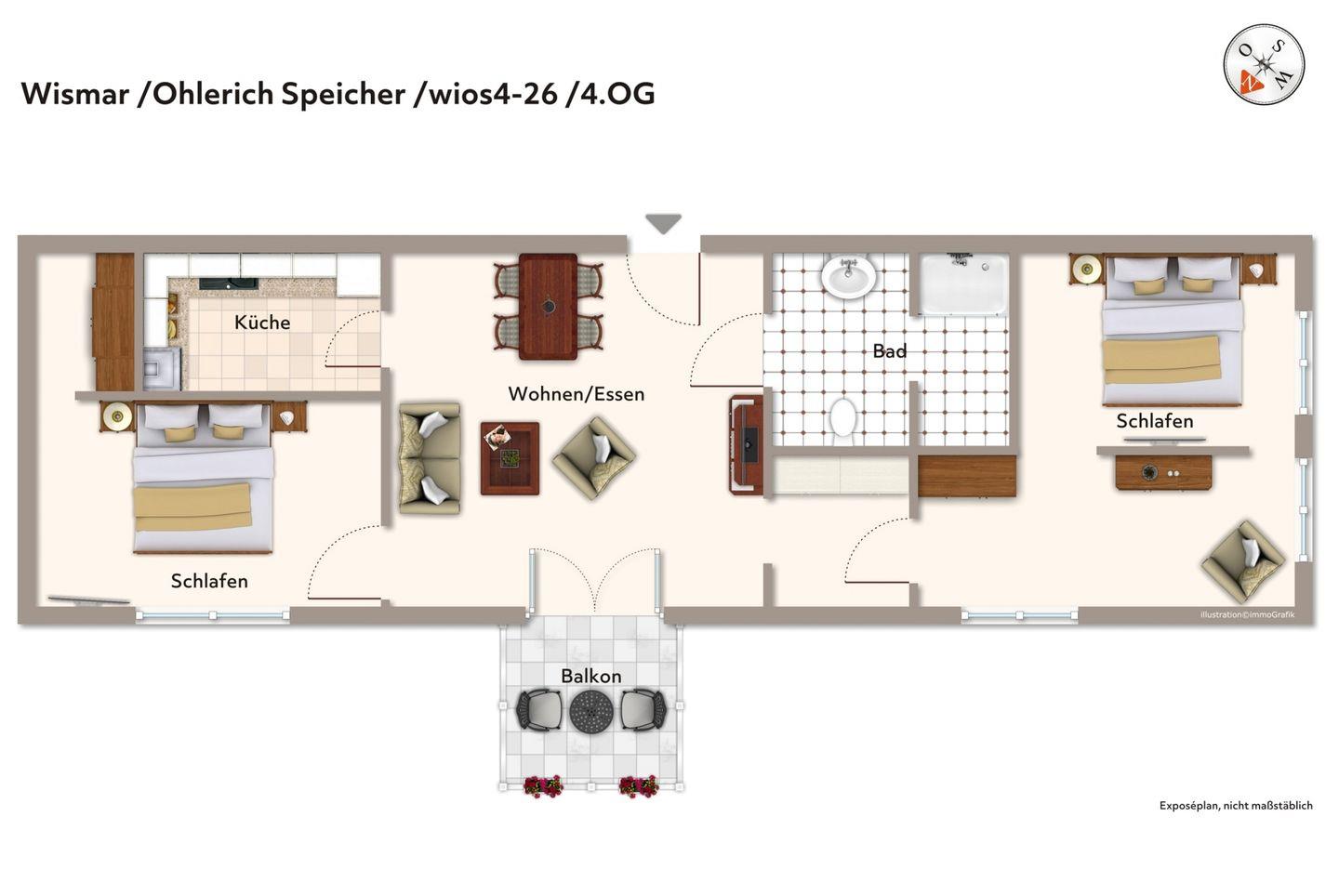 Das 63 m² große 3-Zimmer Apartment ist für bis zu 4 Personen geeignet. Das geschmackvoller Apartment verfügt über einen Balkon und einen großartigen Blick über den Hafen von Wismar.
