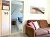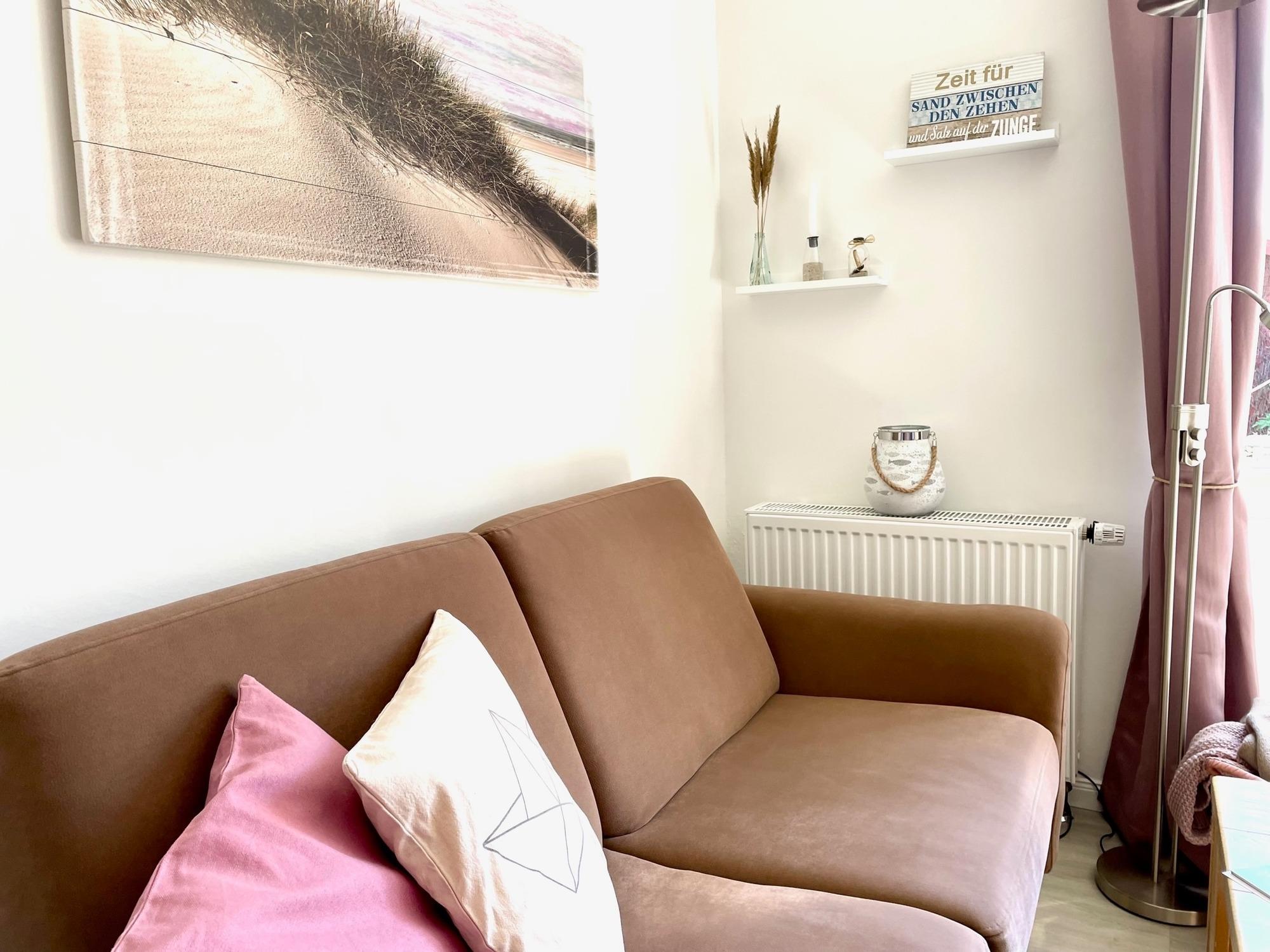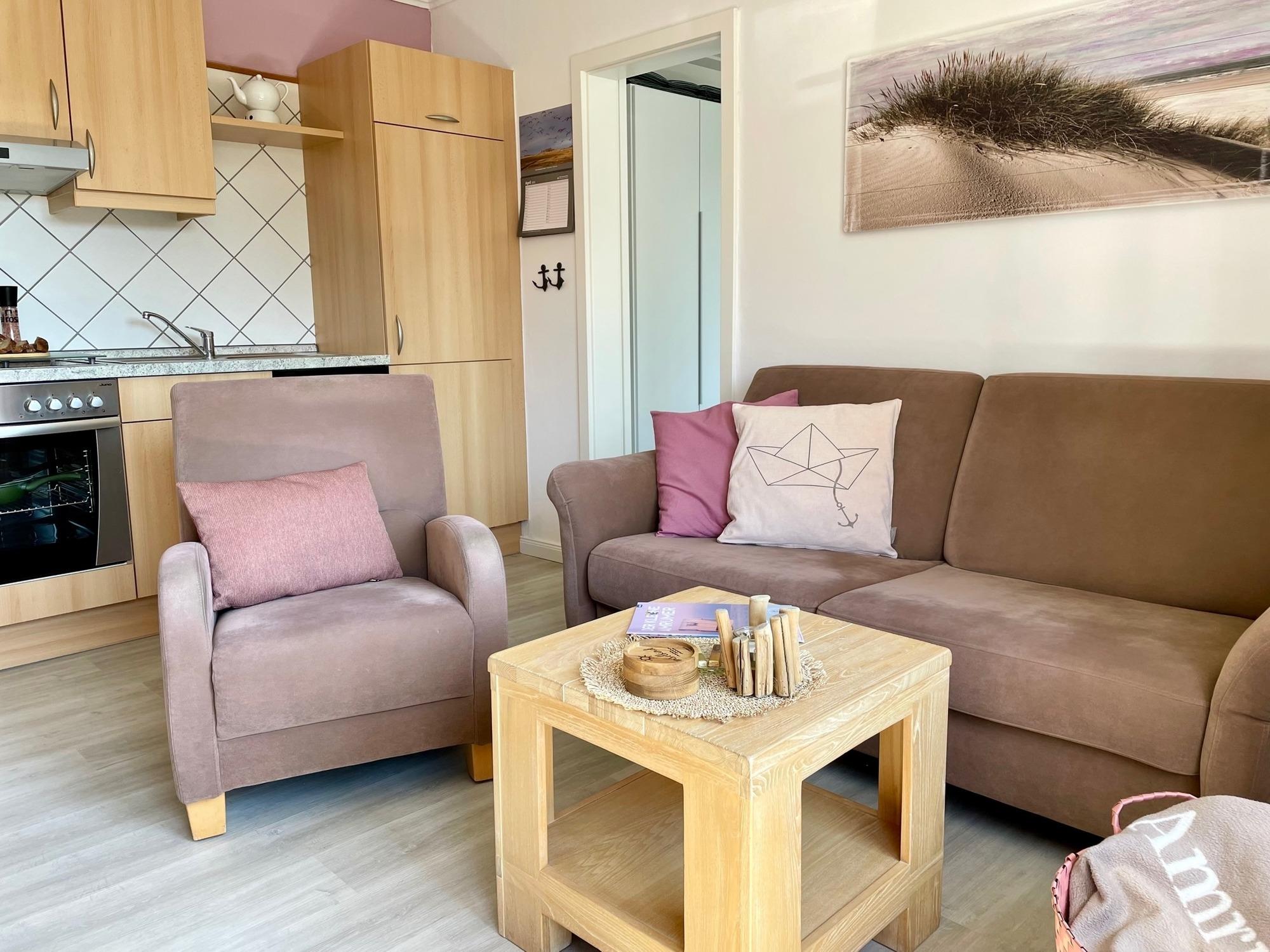 In der Wohnküche, mit nettem Essbereich und gemütlicher Sofaecke, befindet sich ein Flachbild-TV und ein CD-Player mit Radio. Im Duschbad sind Handtücher und Fön vorhanden, der Duschbereich ist ebenerdig und mit Fußbodenheizung ausgestattet.
