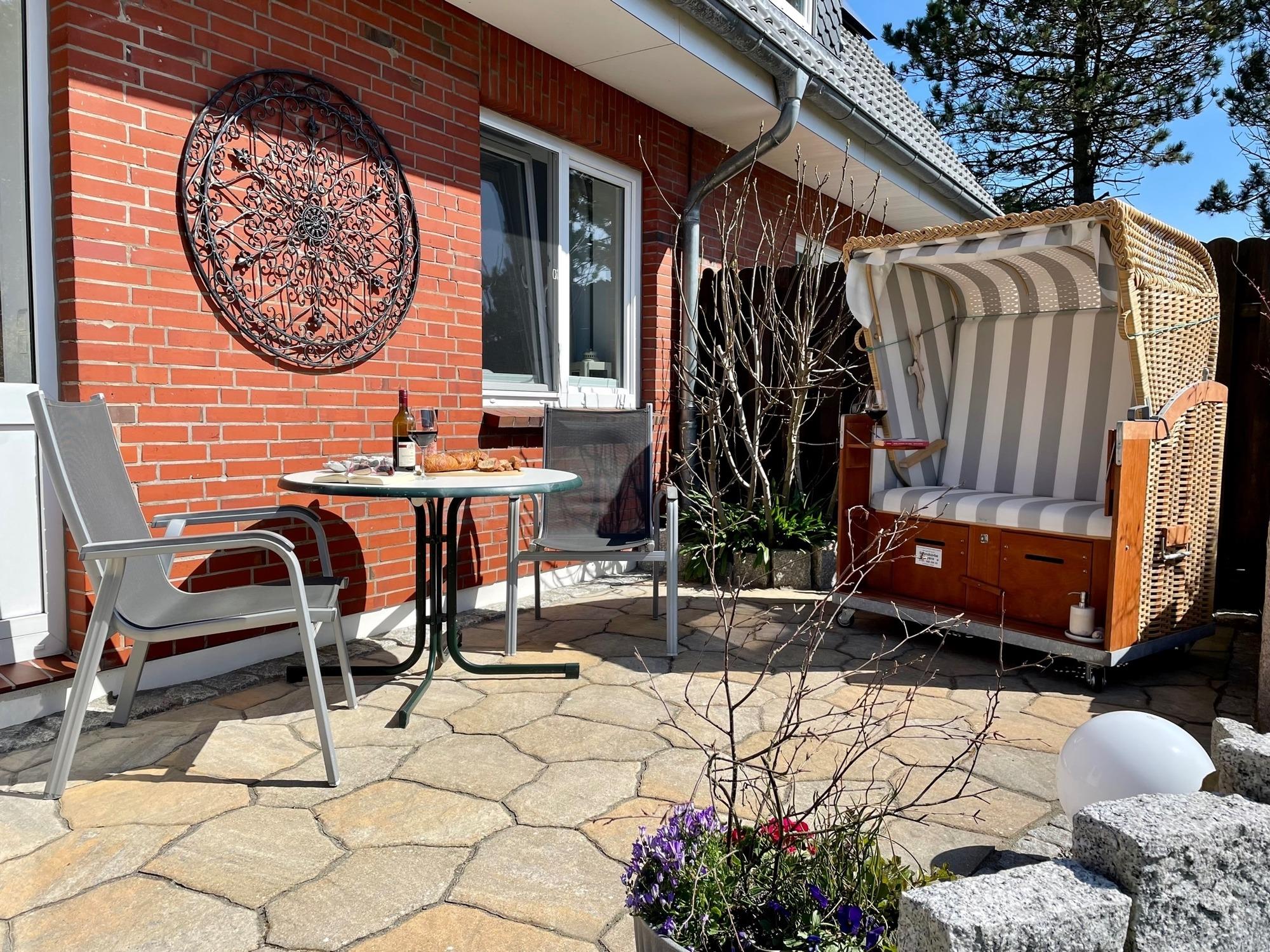 Eine kleine "Auszeit" gefällig? Die Ferienwohnung "Dünennest" hat einen separaten Eingang mit eigener Terrasse, Strandkorb und Gartenblick. Sie liegt extrem ruhig und nah an den schönen Dünen Amrums.