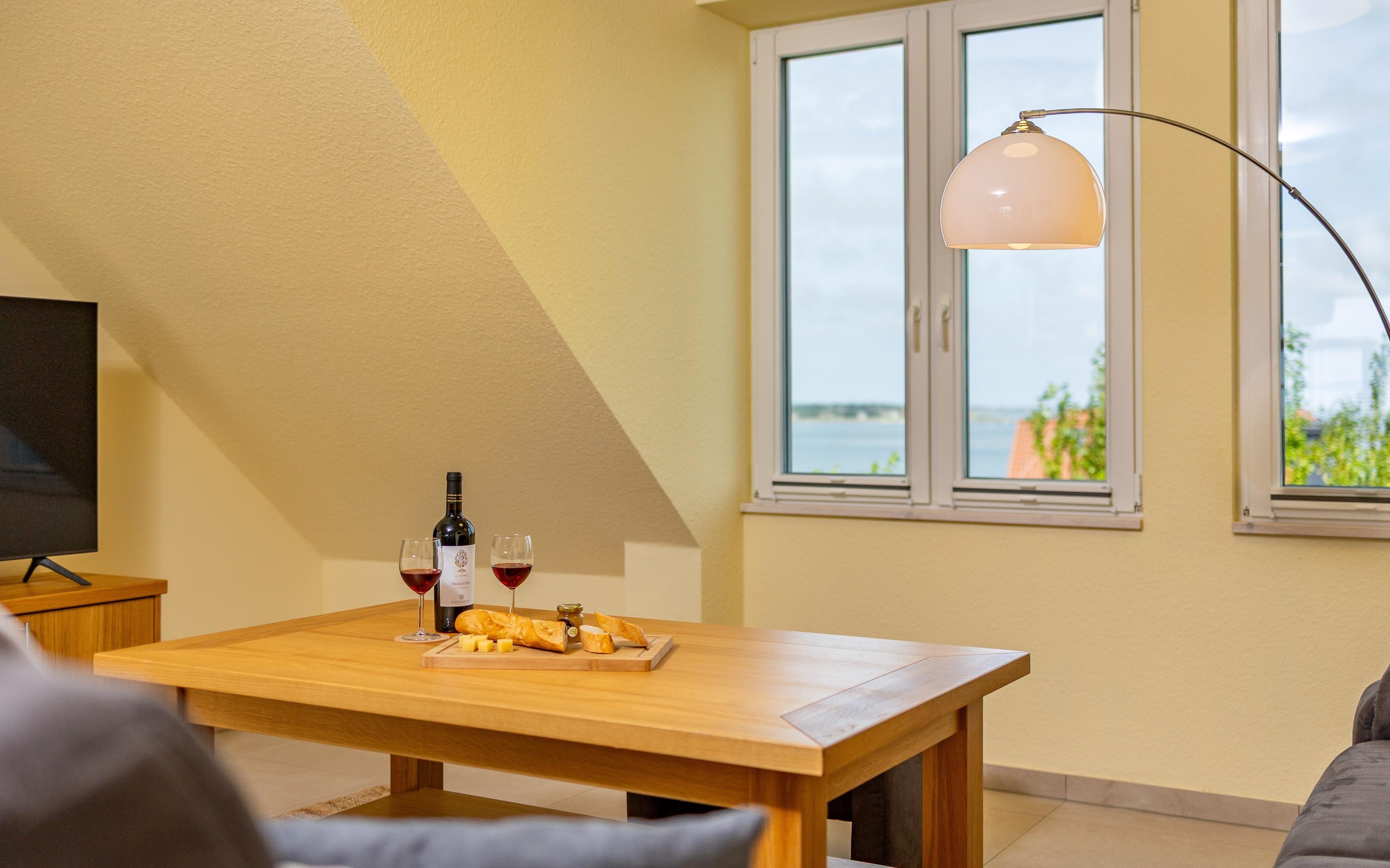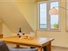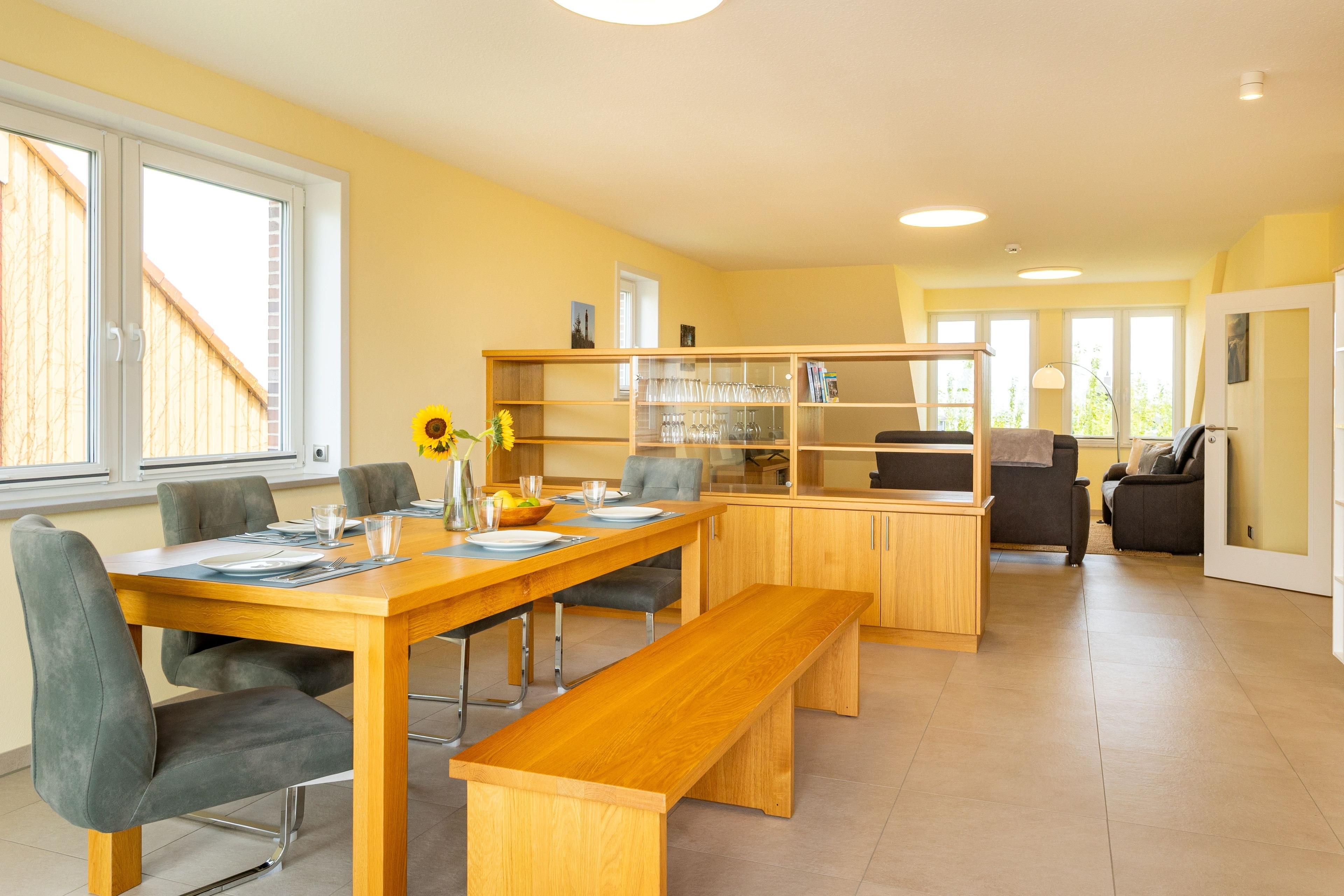 Vom Essbereich aus können Sie die Schiebetüren zum Balkon für einen herrlichen Blick auf Amrums Kniephaken öffnen.