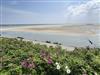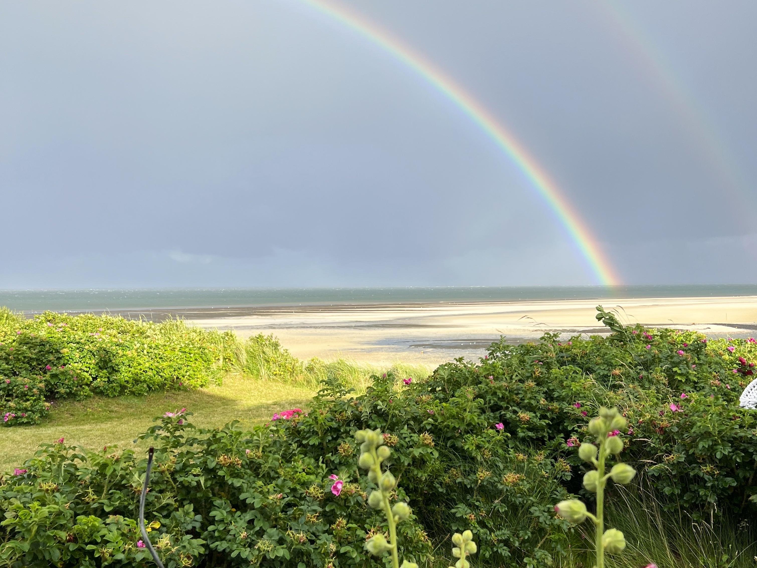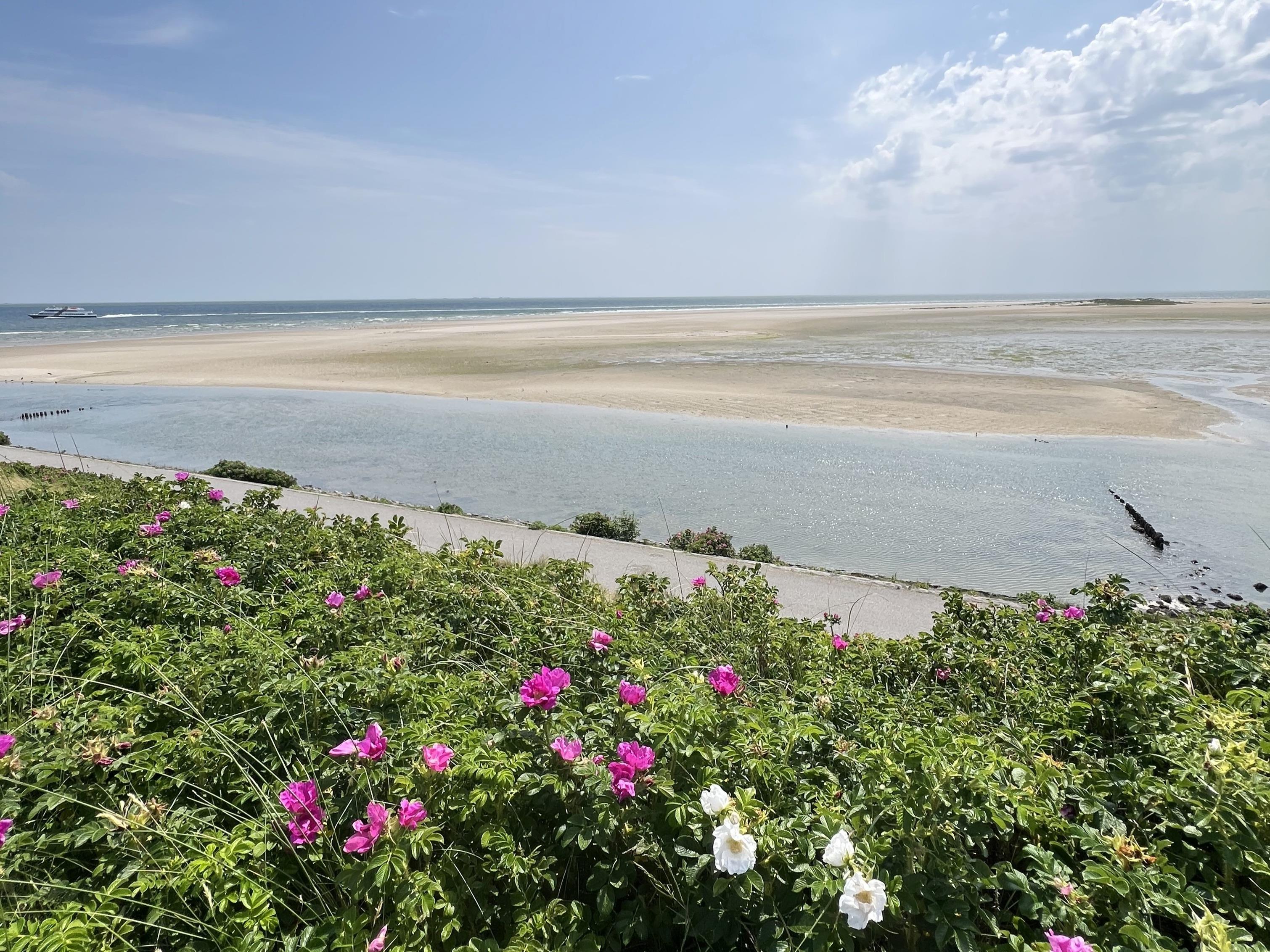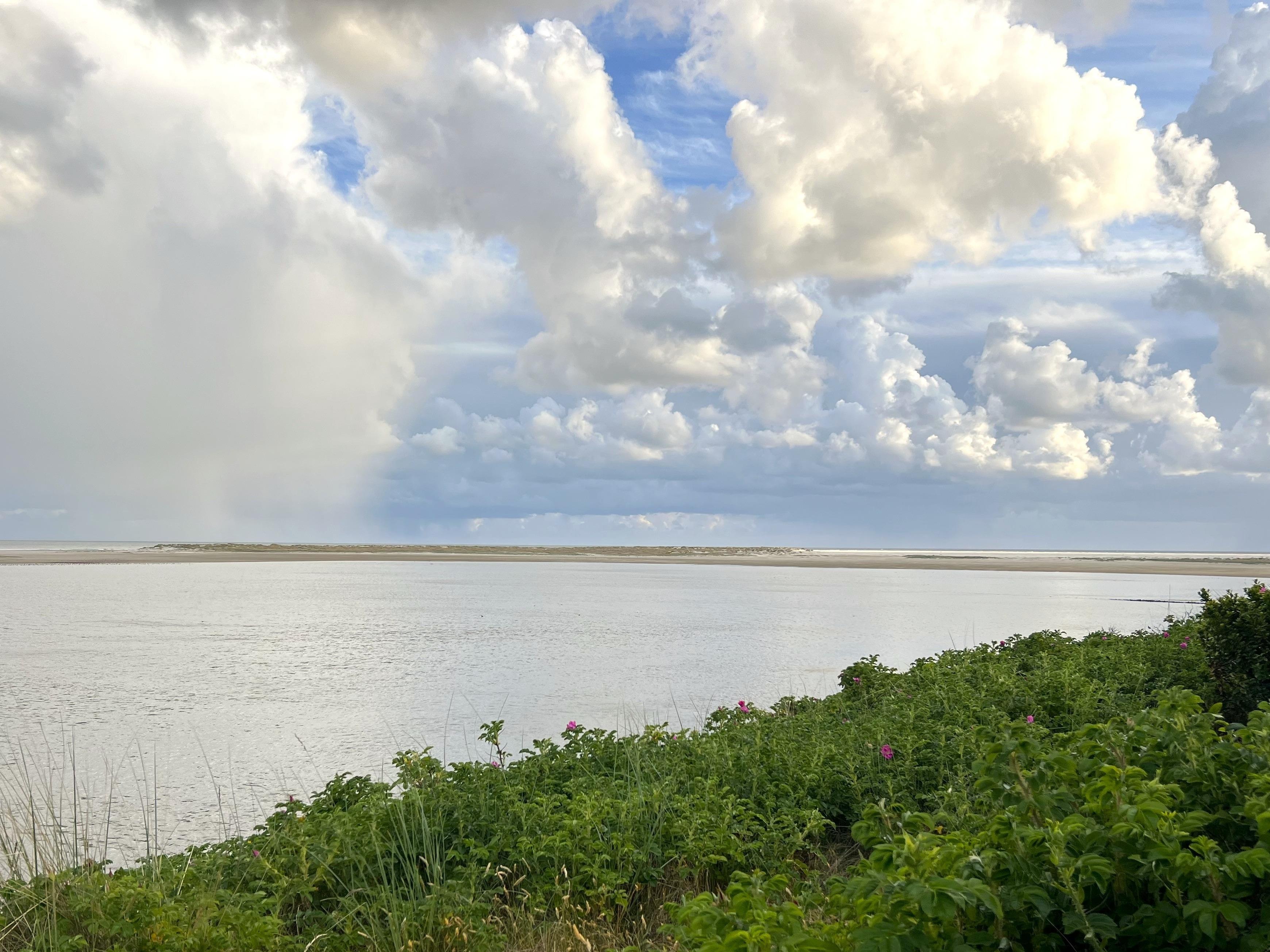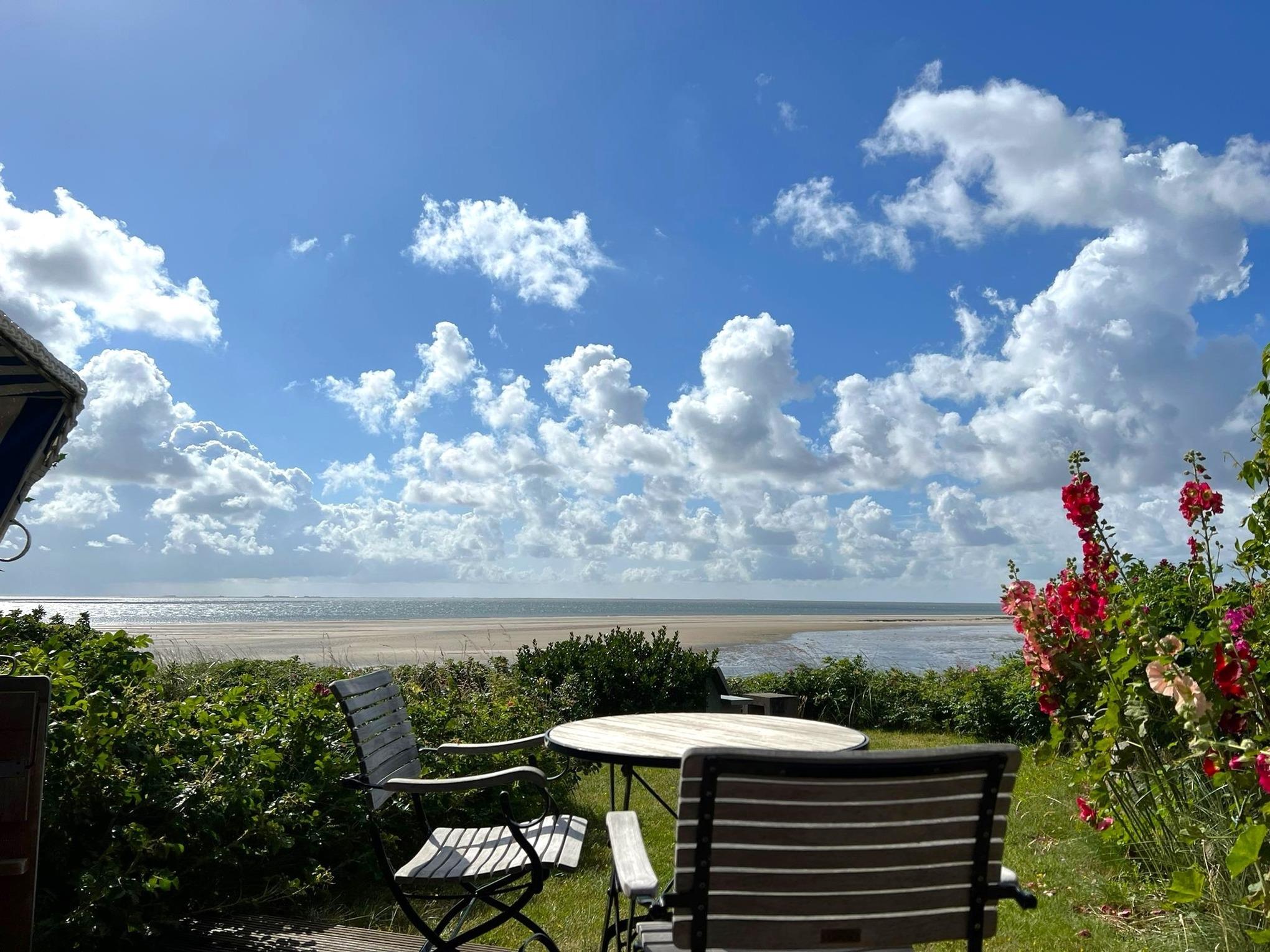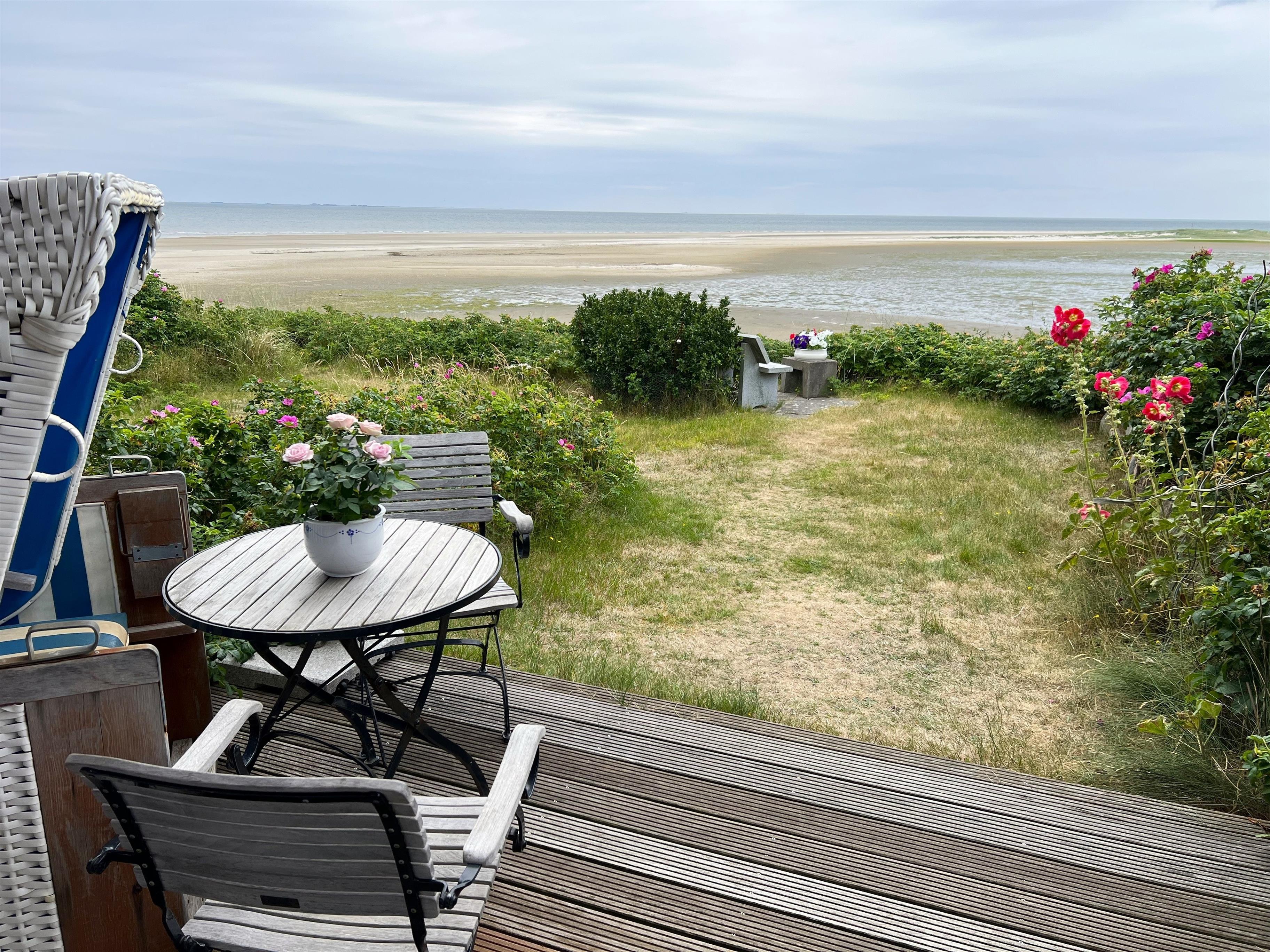 Unverbaut und herrlich ruhig breitet sich von Ihrer eigenen Terrasse mit Strandkorb der Amrumer Kniephaken mit seinem wundervollen Gezeitenspiel aus.