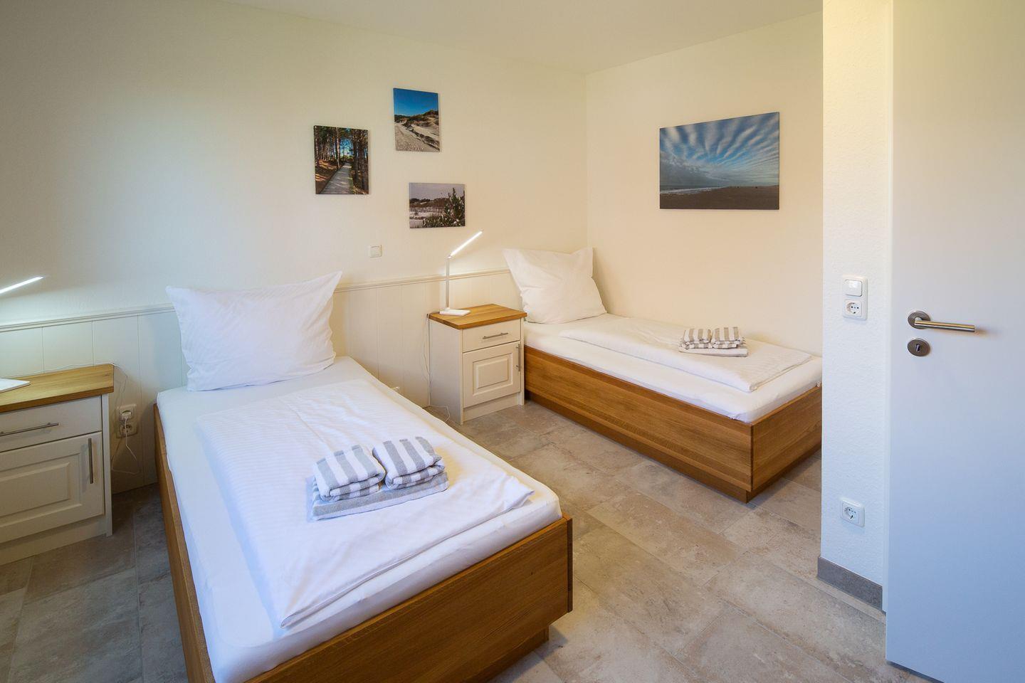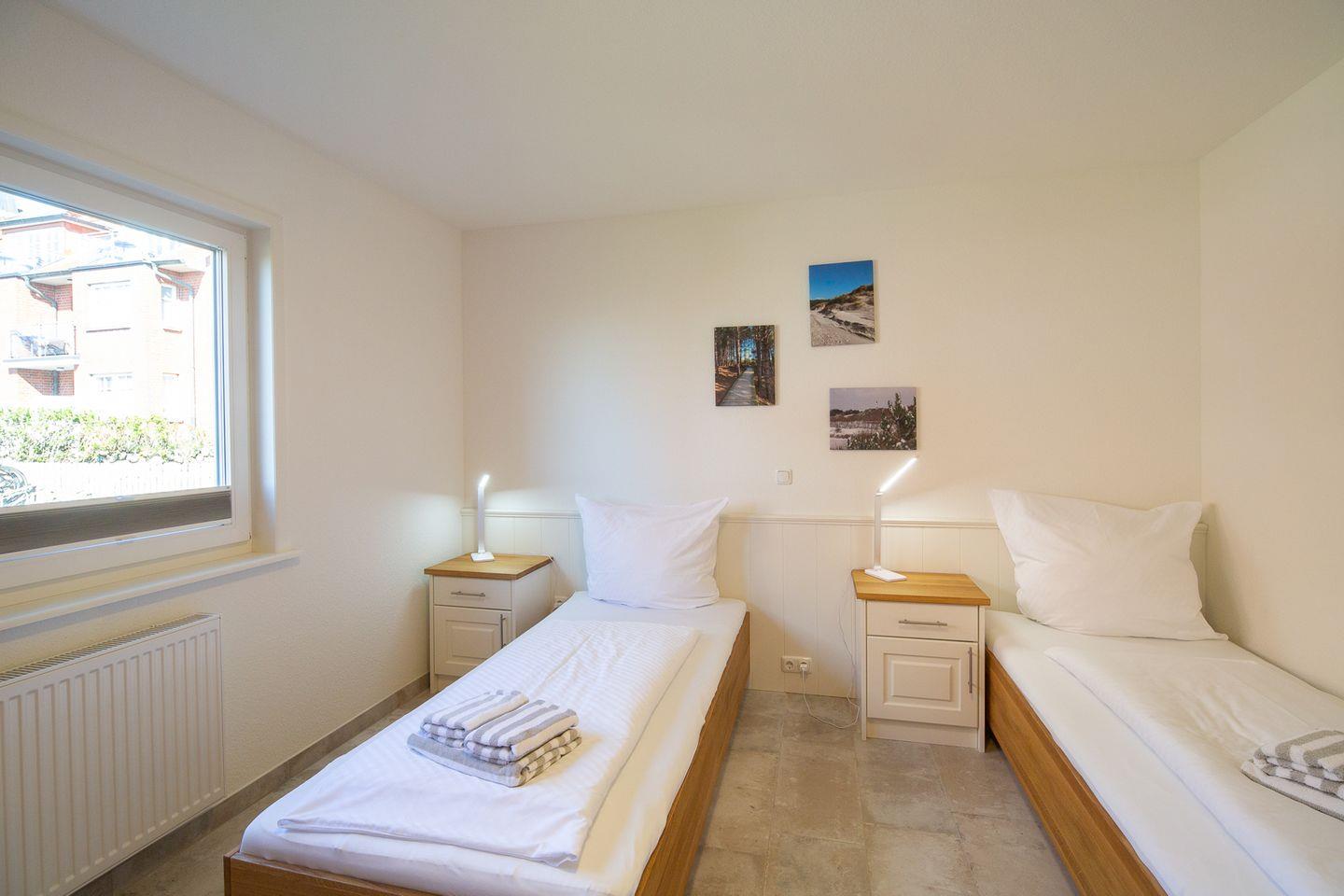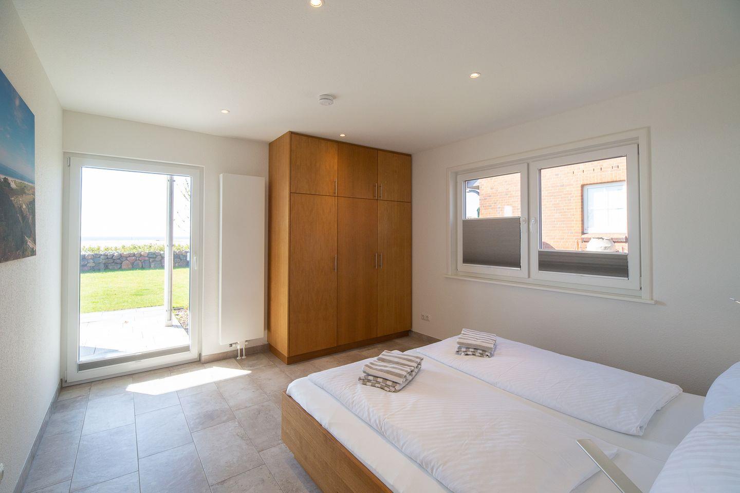 Die Wohnung verfügt über 1 Wohnraum mit Meerblick, WLAN, Sat-TV und offener Küche, 2 Schlafzimmer, 1 Badezimmer mit Dusche und WC, 1 Gäste-WC, Waschmaschine und Trockner zur Gemeinschaftsnutzung, Südterrasse, Garten mit Gartenmöbeln und Strandkorb (April - Oktober), PKW-Stellplatz.