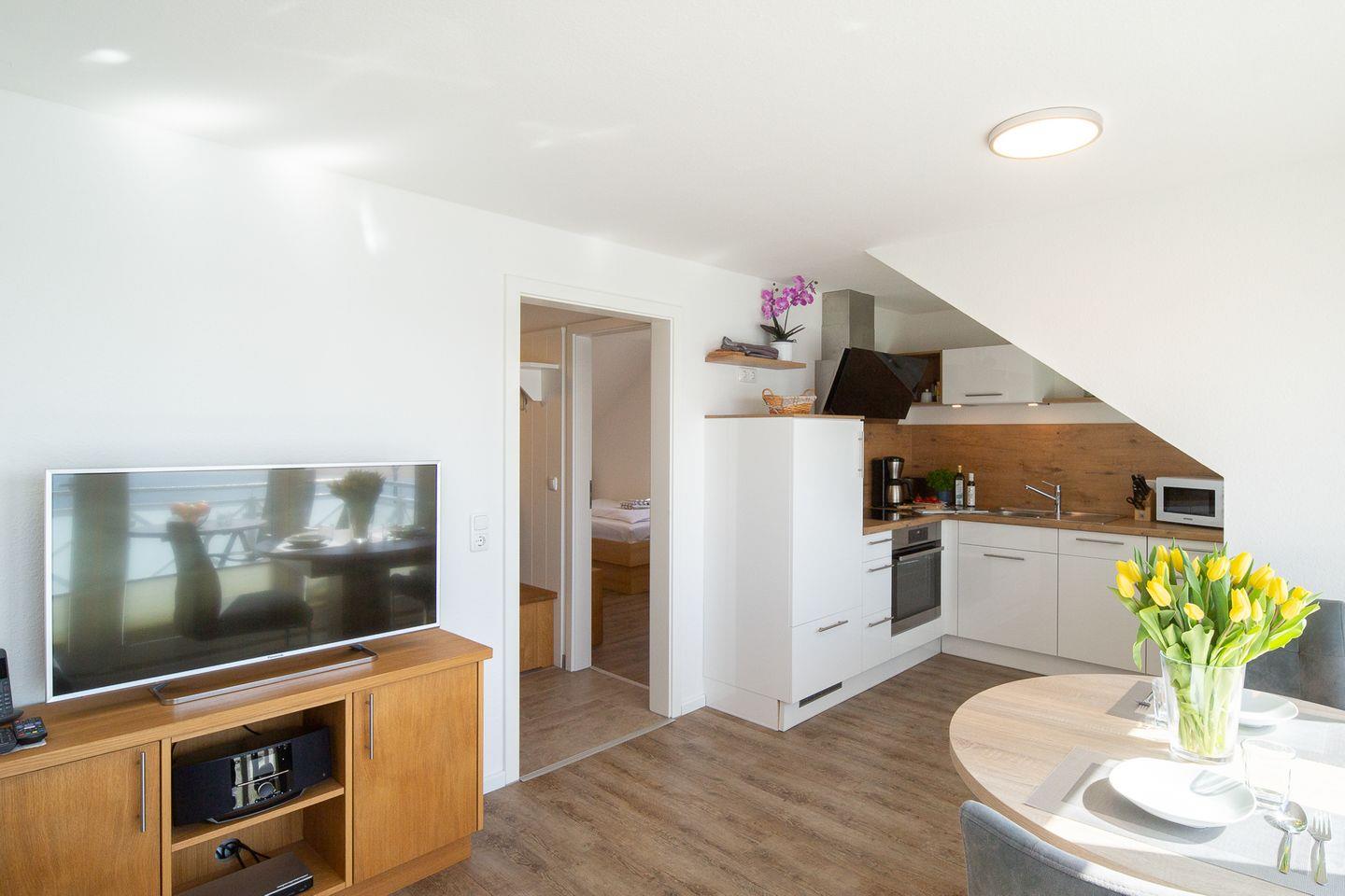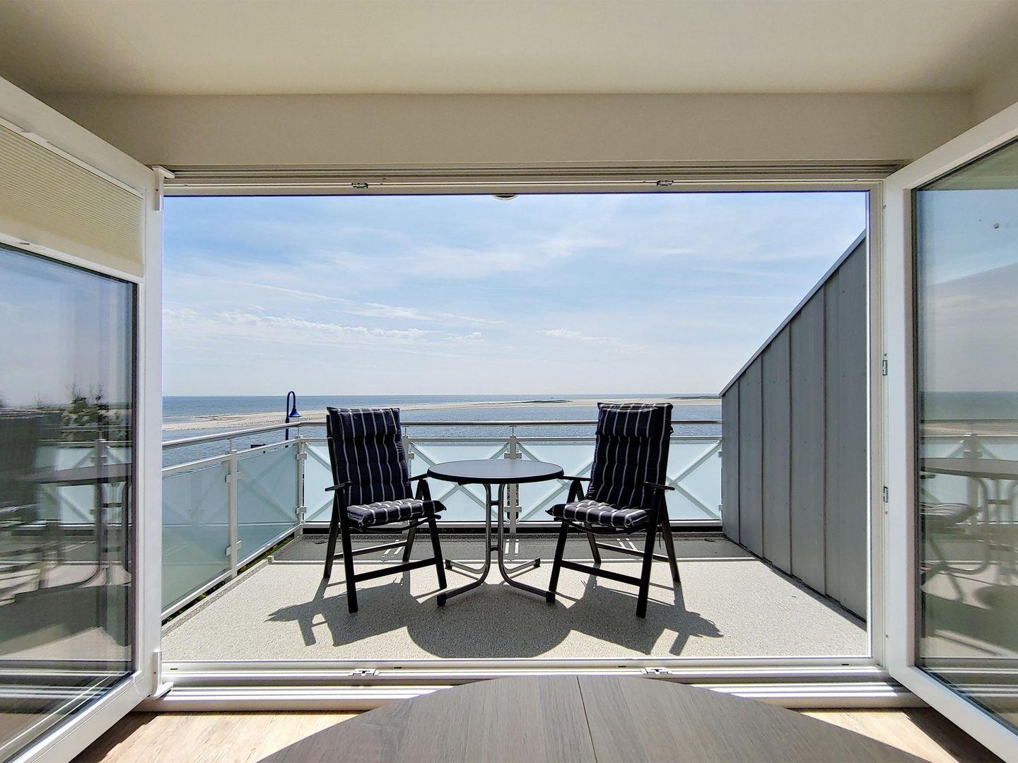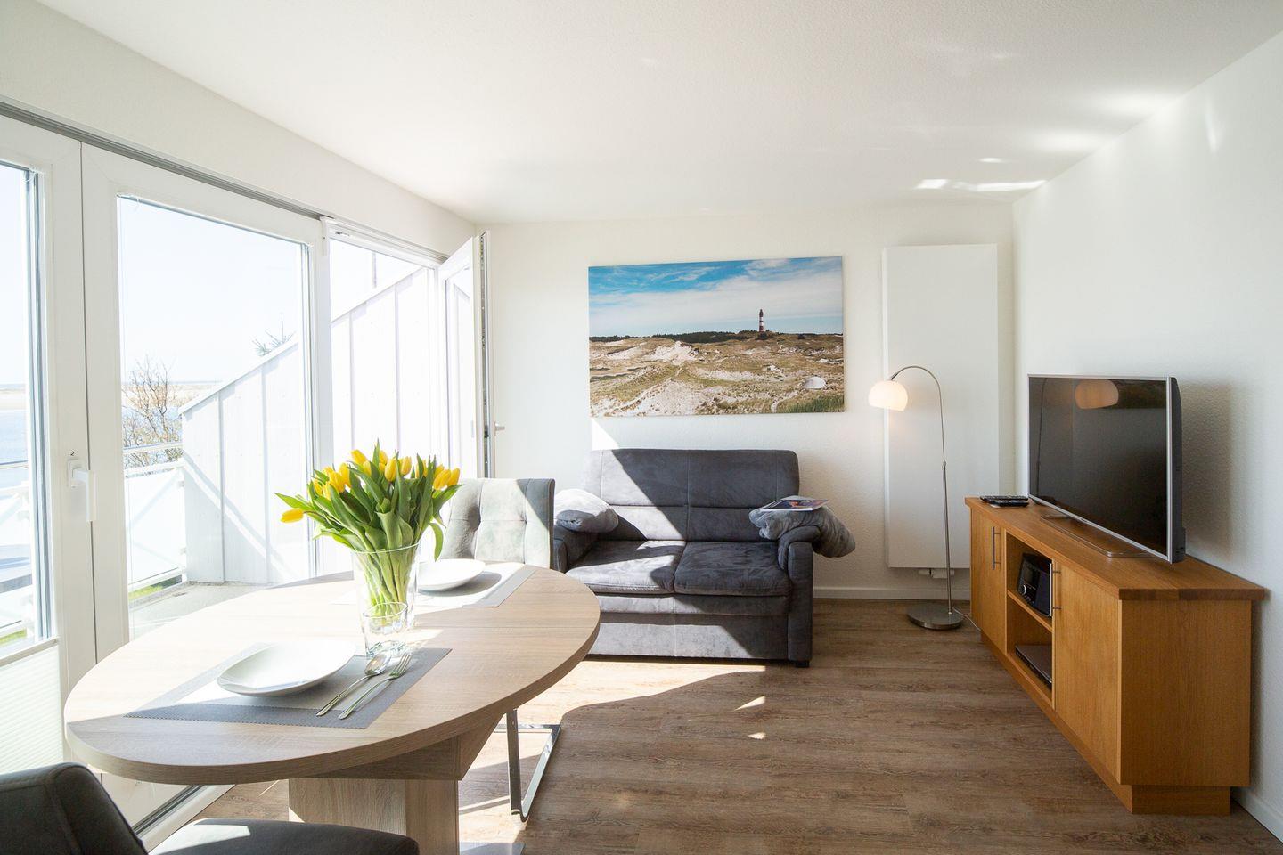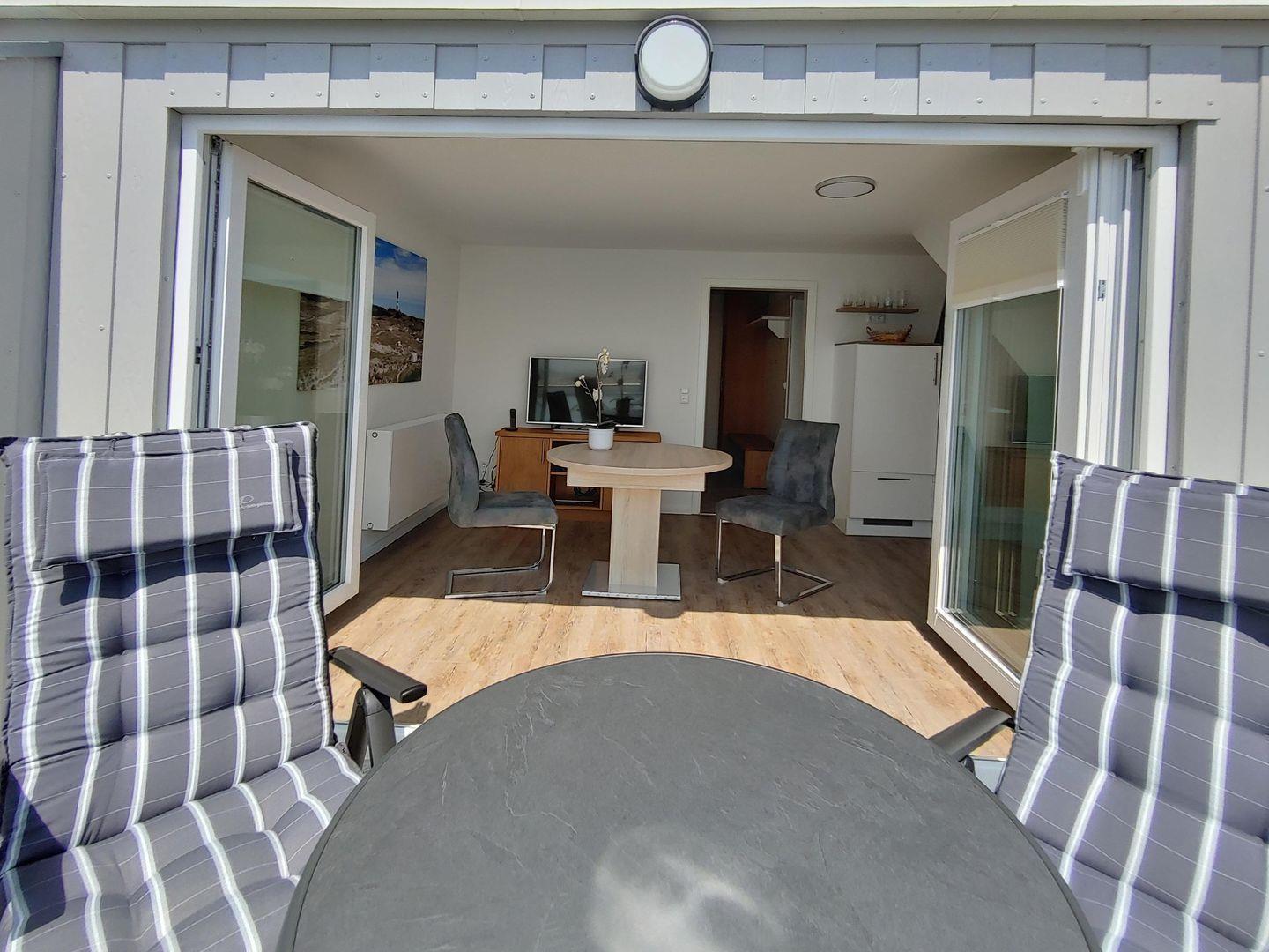 Die Wohnung verfügt über 1 Wohnraum mit Meerblick, 1 Zweisitzer-Couch, WLAN, Sat-TV und offener Küche, 1 Schlafzimmer, 1 Badezimmer mit Dusche und WC, Waschmaschine und Trockner zur Gemeinschaftsnutzung, Südbalkon mit Balkonmöbeln (April - Oktober), PKW-Stellplatz.