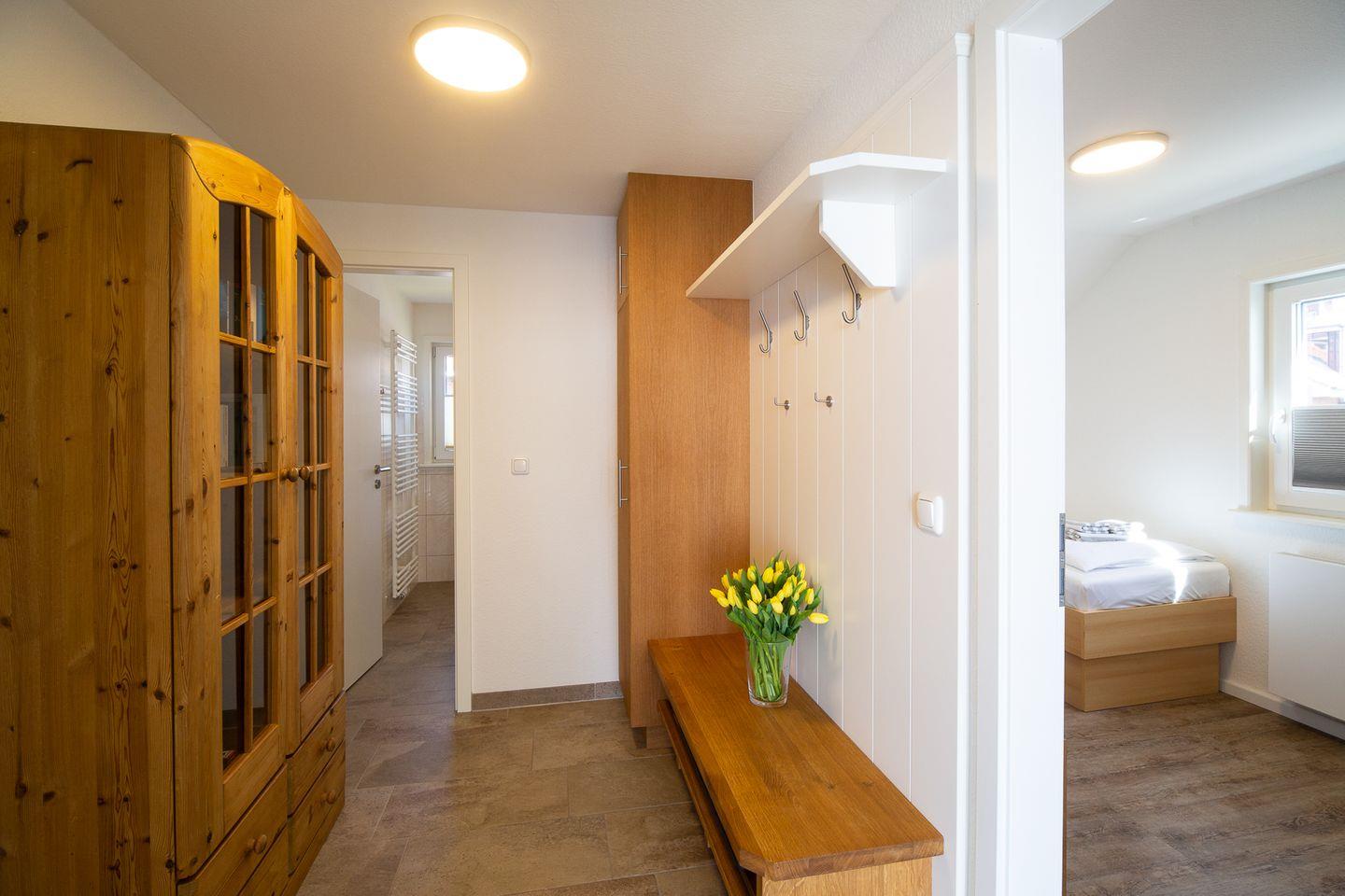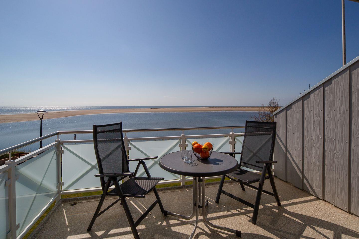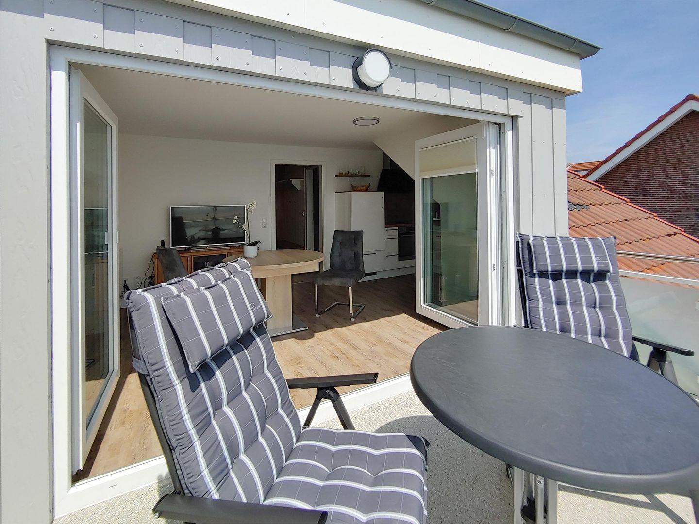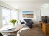 Die Wohnung verfügt über 1 Wohnraum mit Meerblick, 1 Zweisitzer-Couch, WLAN, Sat-TV und offener Küche, 1 Schlafzimmer, 1 Badezimmer mit Dusche und WC, Waschmaschine und Trockner zur Gemeinschaftsnutzung, Südbalkon mit Balkonmöbeln (April - Oktober), PKW-Stellplatz.