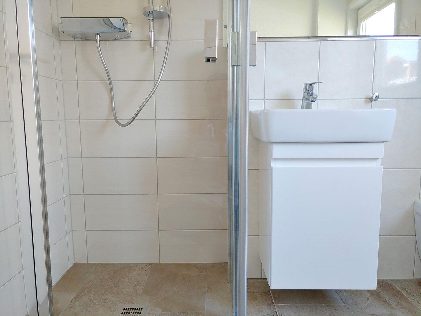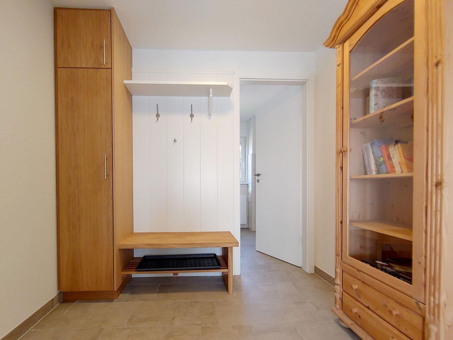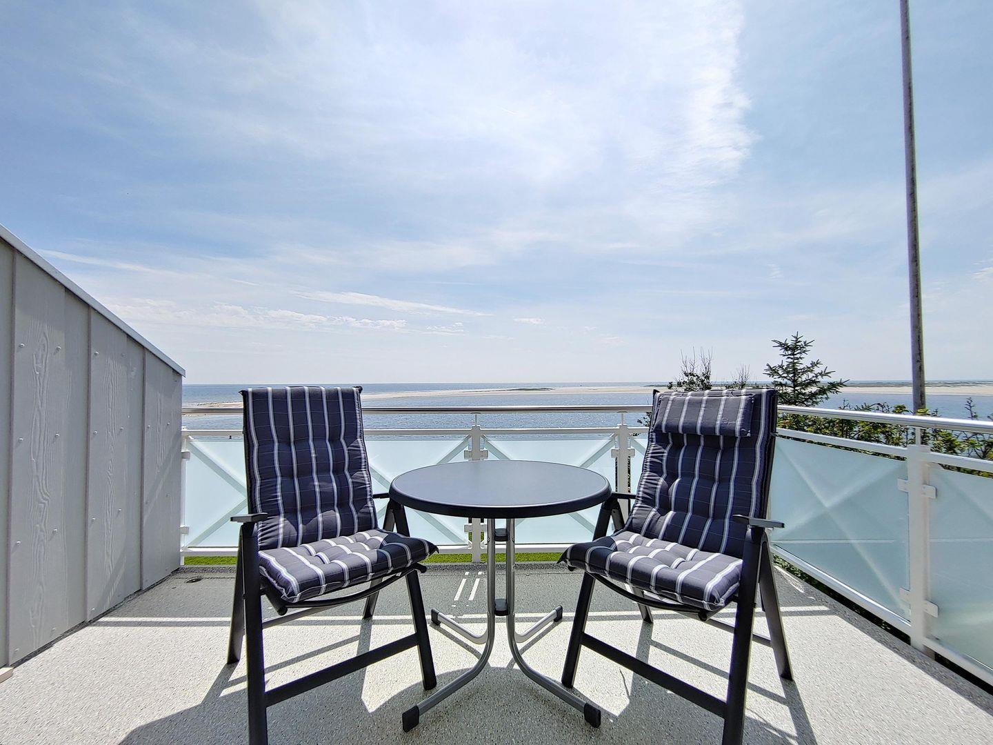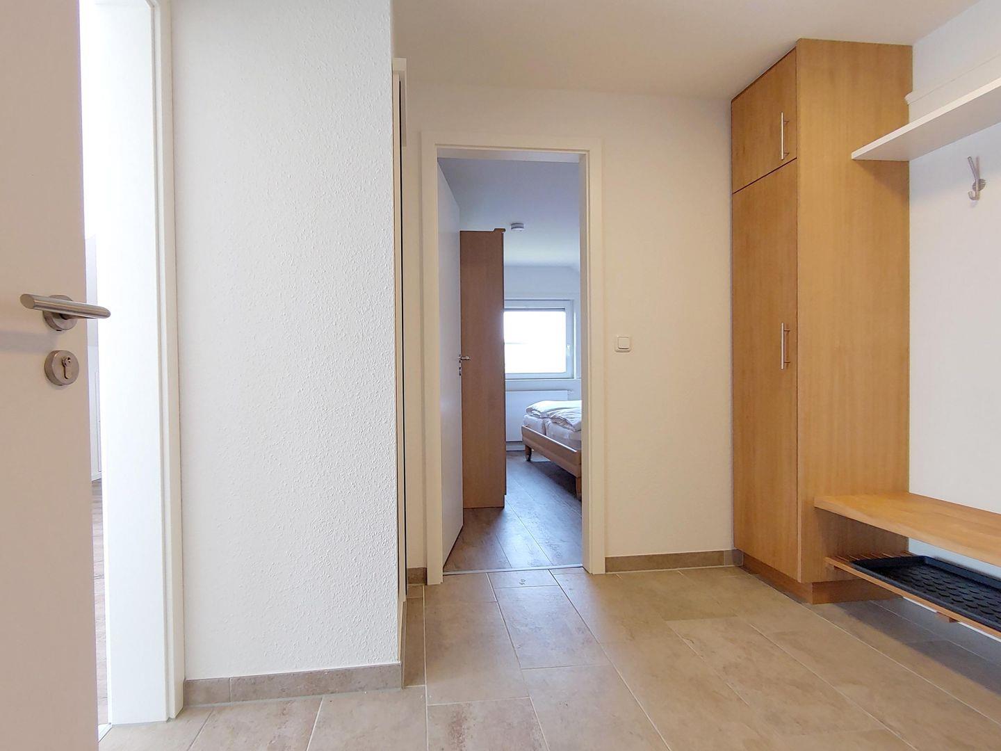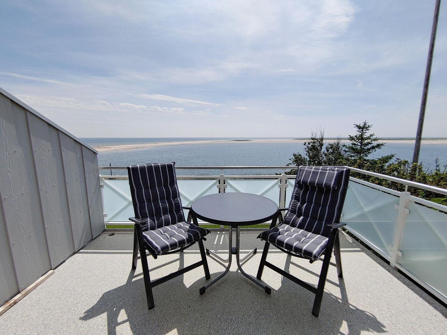 Die Wohnung verfügt über 1 Wohnraum mit Meerblick, 1 Zweisitzer-Couch, 1 Sessel, WLAN, Sat-TV und offener Küche, 1 Schlafzimmer, 1 Badezimmer mit Dusche und WC, Waschmaschine und Trockner zur Gemeinschaftsnutzung, Südbalkon mit Balkonmöbeln (April - Oktober), PKW-Stellplatz.