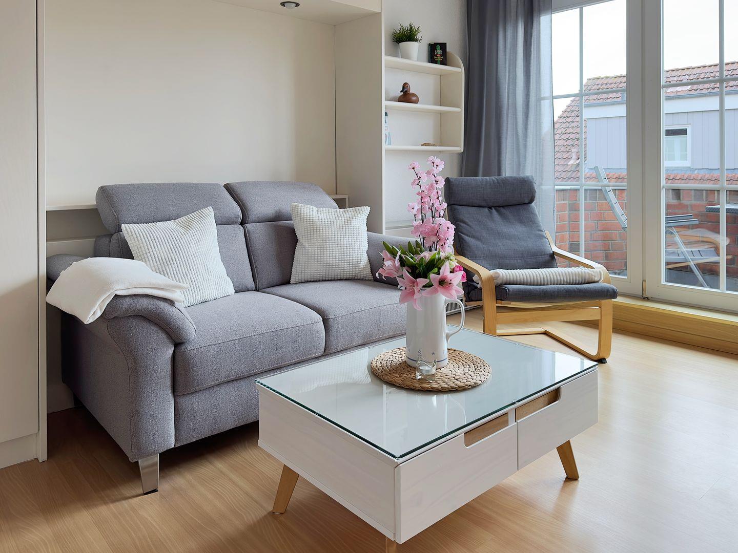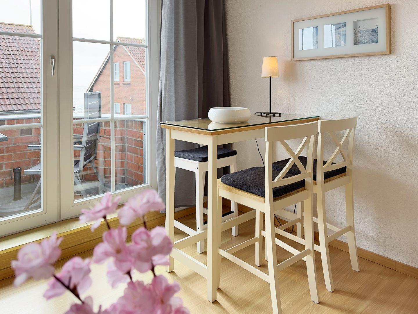 Die Ferienwohnung 18/6 Meerblick im 1. Obergeschoss des Hauses „Südspitze 18" in Wittdün auf Amrum ist eine 2-Zimmer-Ferienwohnung (ca. 30 qm Grundfläche) mit Schlafmöglichkeiten für 3 Personen.