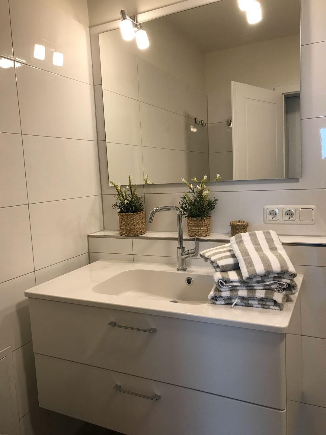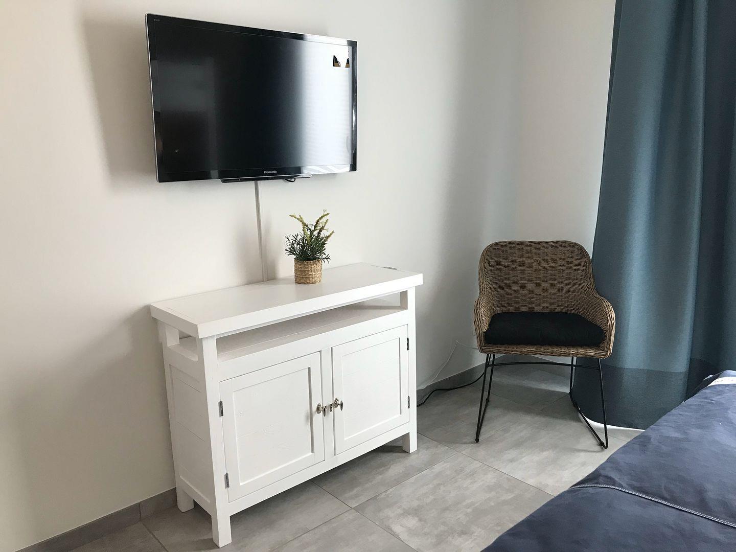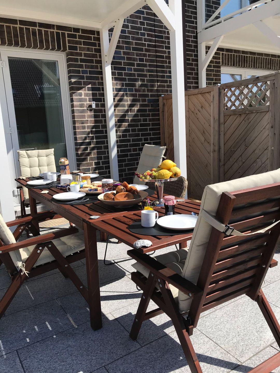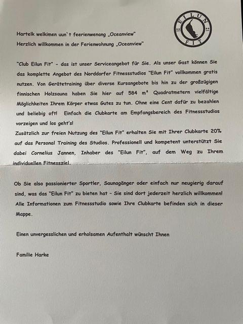 Die Wohnung verfügt über 1 Wohnraum mit WLAN, Sat-TV und offener Küche, 2 Schlafzimmer mit Sat-TV, 1 Badezimmer mit Dusche und WC, 1 Gäste-WC; Sonnenschutz an allen Fenstern, 1 Süd-Terrasse vom Wohnzimmer, 1 Nord-Balkon mit Meerblick vom Esszimmer, Balkonmöbel (April – Oktober). Im Keller befinden sich eine Münz-Waschmaschine und ein Münz-Trockner zur Gemeinschaftsnutzung. Eigener PKW-Stellplatz in der Nähe des Hauses, Unterstellmöglichkeit für Fahrräder. Nur wenige Meter vom Meer entfernt.