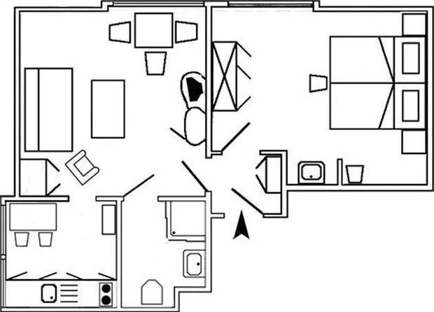 Diese ungefähr 42m² große Nichtraucher-Ferienwohnung für zwei Personen befindet sich im Obergeschoss des Hauses "Heißer Sand". Sie besteht aus einem Schlafraum mit feststehendem Bett und Radiowecker, einem Wohnzimmer mit Radio und TV, einer separaten Küche, sowie Dusche und WC mit Fön.