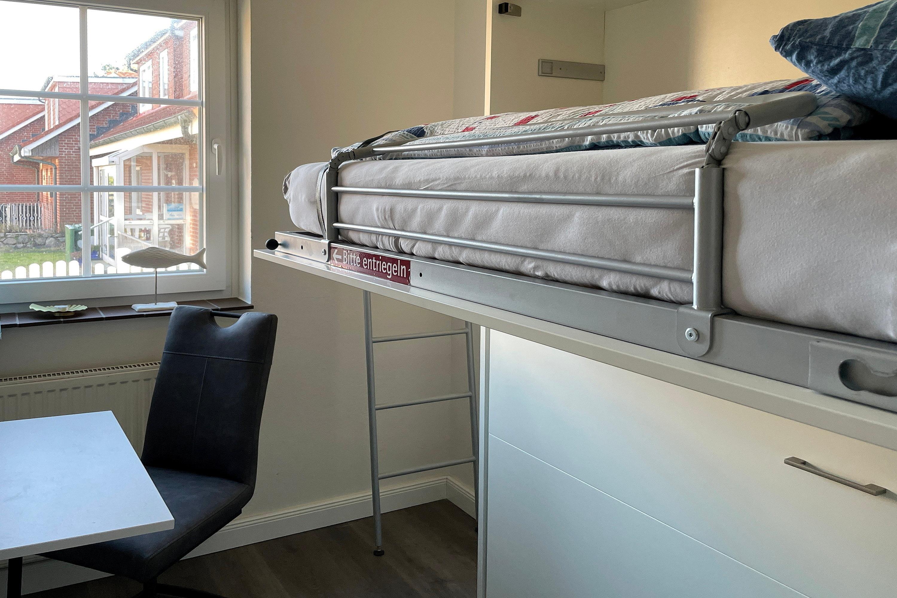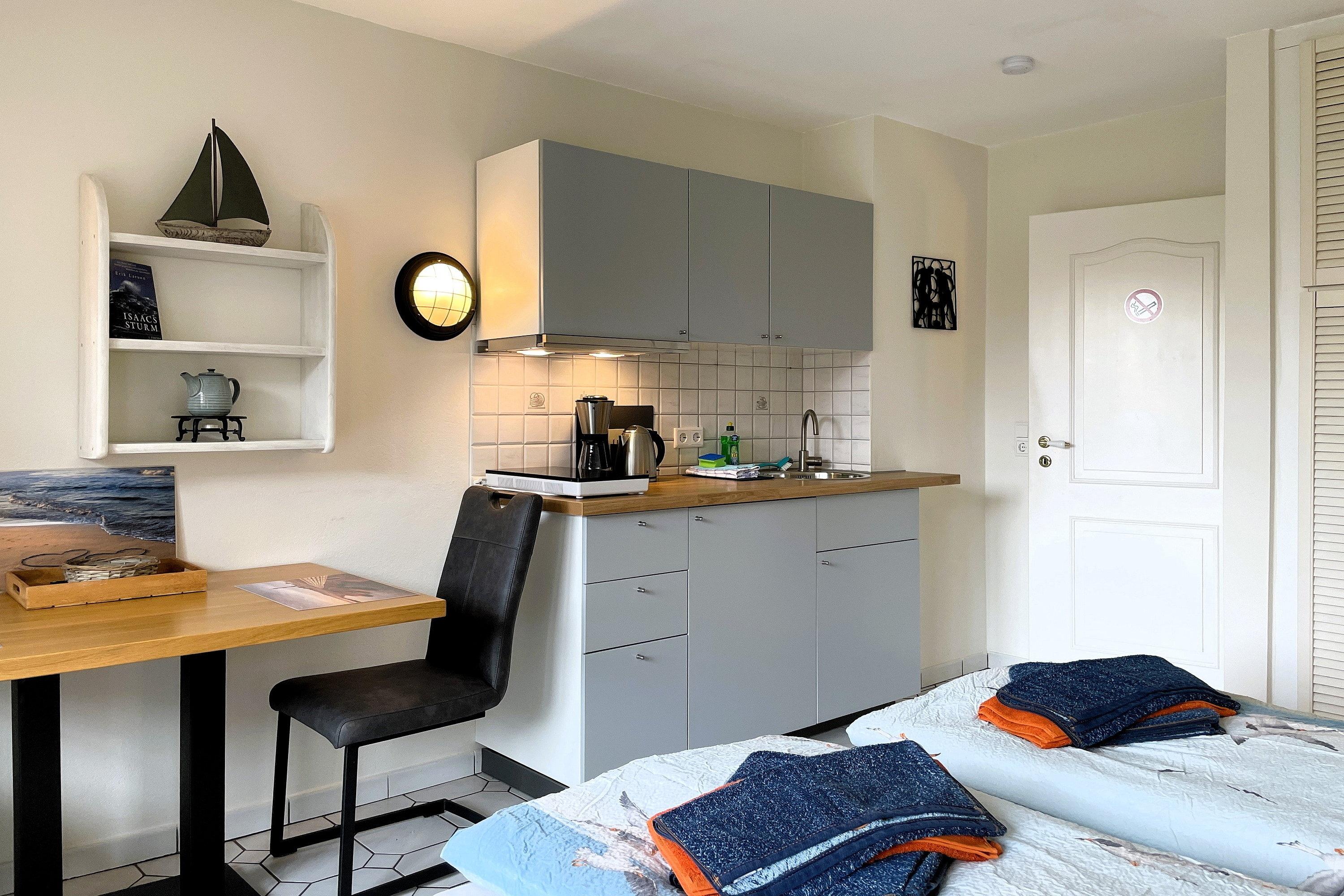 Herzlich willkommen in der Ferienwohnung Huus Waterkant 01 - Ihr gemütliches Zuhause auf Zeit an der Nordsee! Diese Ferienwohnung bietet Ihnen einen perfekten Rückzugsort für einen entspannten Urlaub. Die Wohnung verfügt über zwei Zimmer, die optimal für 2-4 Personen geeignet sind. Das geräumige Wohn- und Schlafzimmer lädt mit seinem bequemen Doppelbett zum Ausruhen ein. Ein praktischer Schrank bietet ausreichend Stauraum, und die integrierte Küchenzeile mit Esstisch und Stühlen ermöglicht gemeinsame Mahlzeiten. Ein weiteres Schlafzimmer mit einem Etagenbett, das auch für Erwachsene geeignet ist, sorgt für zusätzlichen Schlafkomfort. Das helle Bad mit Dusche und WC grenzt an den kleinen Eingangsbereich und verfügt über ein Fenster zur natürlichen Belüftung. Die sonnige Süd-West-Terrasse bietet einen wunderbaren Blick auf Amrum. Hier können Sie die Seele baumeln lassen und die Ruhe genießen. Zusätzliche Annehmlichkeiten wie ein Gefrierfach im Untergeschoss sowie die kostenfreie Nutzung von Waschmaschine und Trockner runden das Urlaubsvergnügen ab. SAT-TV und Radio sorgen für Unterhaltung, wenn Sie nach einem Tag voller Erlebnisse gemütlich zu Hause sind.