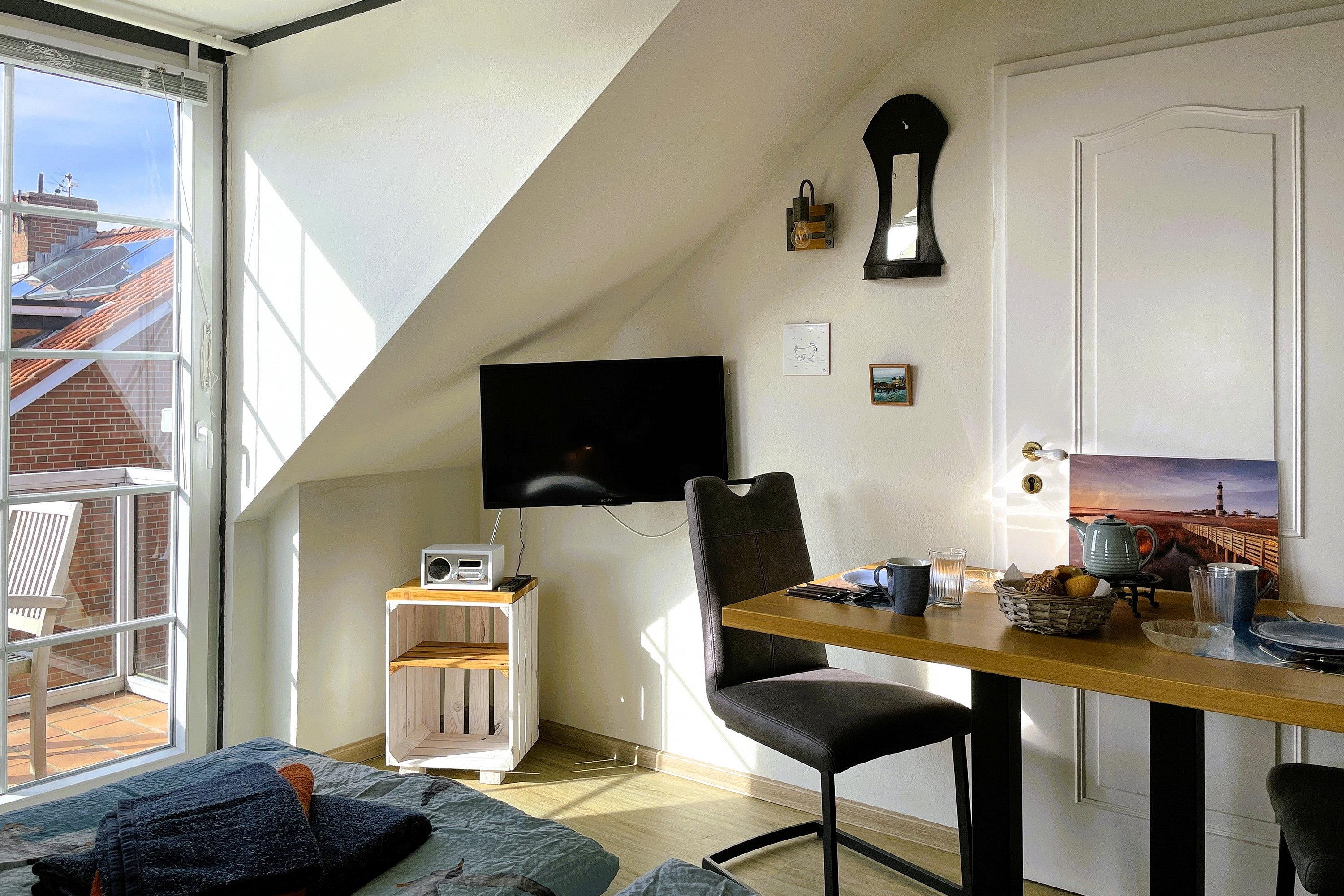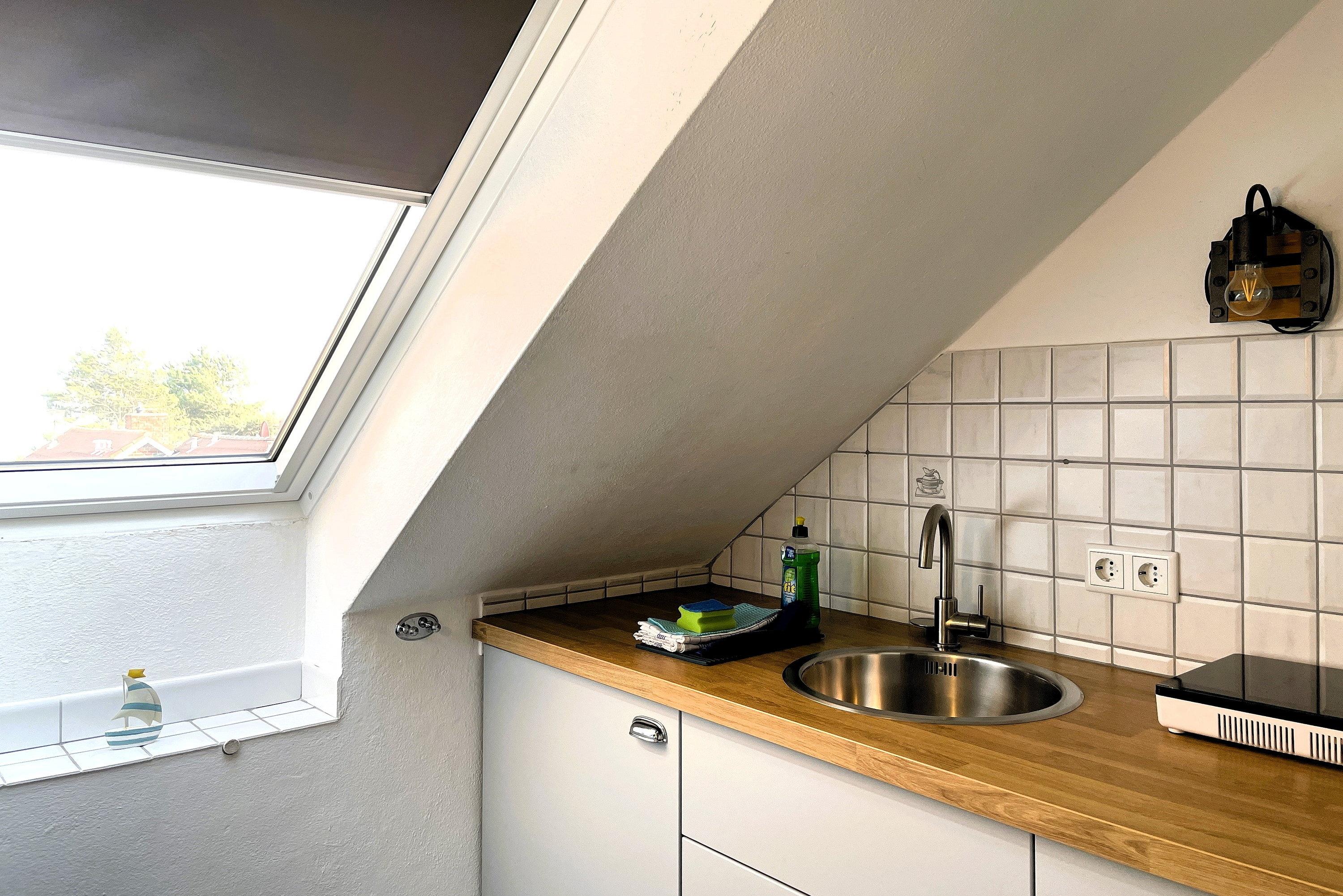 Unsere liebevoll eingerichtete Ferienwohnung bietet Ihnen alles, was Sie für einen entspannten Urlaub benötigen. Mit zwei einladenden Zimmern sorgt sie für Komfort und Behaglichkeit. Das kombinierte Wohn- und Schlafzimmer ist mit einem bequemen Doppelbett ausgestattet, ideal für zwei Personen. Ein geräumiger Schrank bietet ausreichend Stauraum für Ihre Kleidung, während ein Tisch mit Stühlen zum Verweilen einlädt. Das separate Schlafzimmer verfügt über ein Einzelbett. Das helle Badezimmer, ausgestattet mit Dusche und WC, grenzt an den kleinen Flur bzw. Eingangsbereich und verfügt über ein Fenster für natürliches Licht und frische Luft. Die kompakte Küche unter der Dachschräge ist praktisch und funktional eingerichtet, sodass Sie sich bei Bedarf selbst versorgen können. Ein besonderes Highlight ist der Balkon, der vom Wohn-/Schlafzimmer aus zugänglich ist. Hier können Sie auf bequemen Sitzgelegenheiten den Tag ausklingen lassen und den atemberaubenden Blick auf die Wohnanlage und aufs Meer genießen. Die südwestliche Ausrichtung verspricht herrliche Sonnenuntergänge und eine angenehme Atmosphäre.