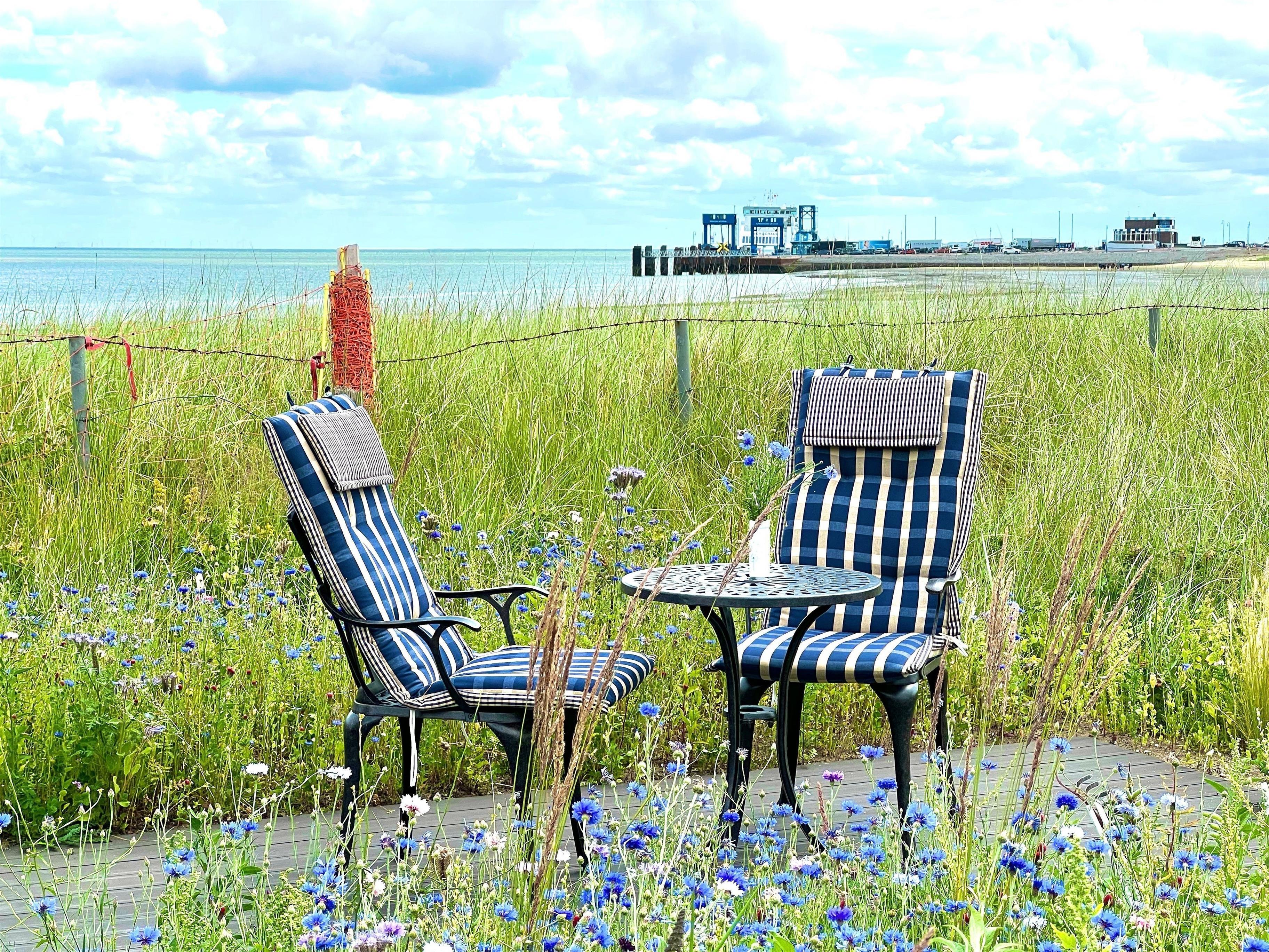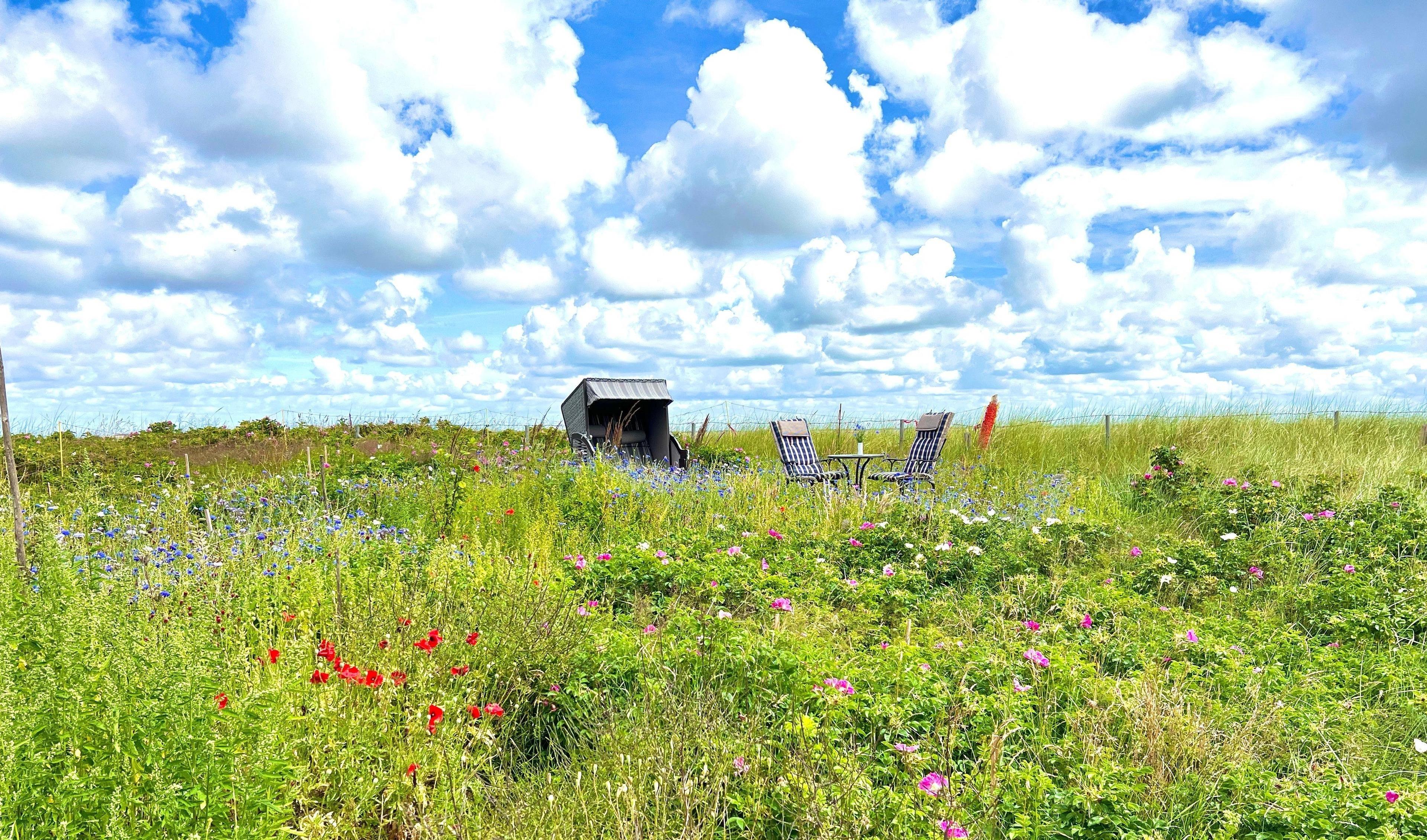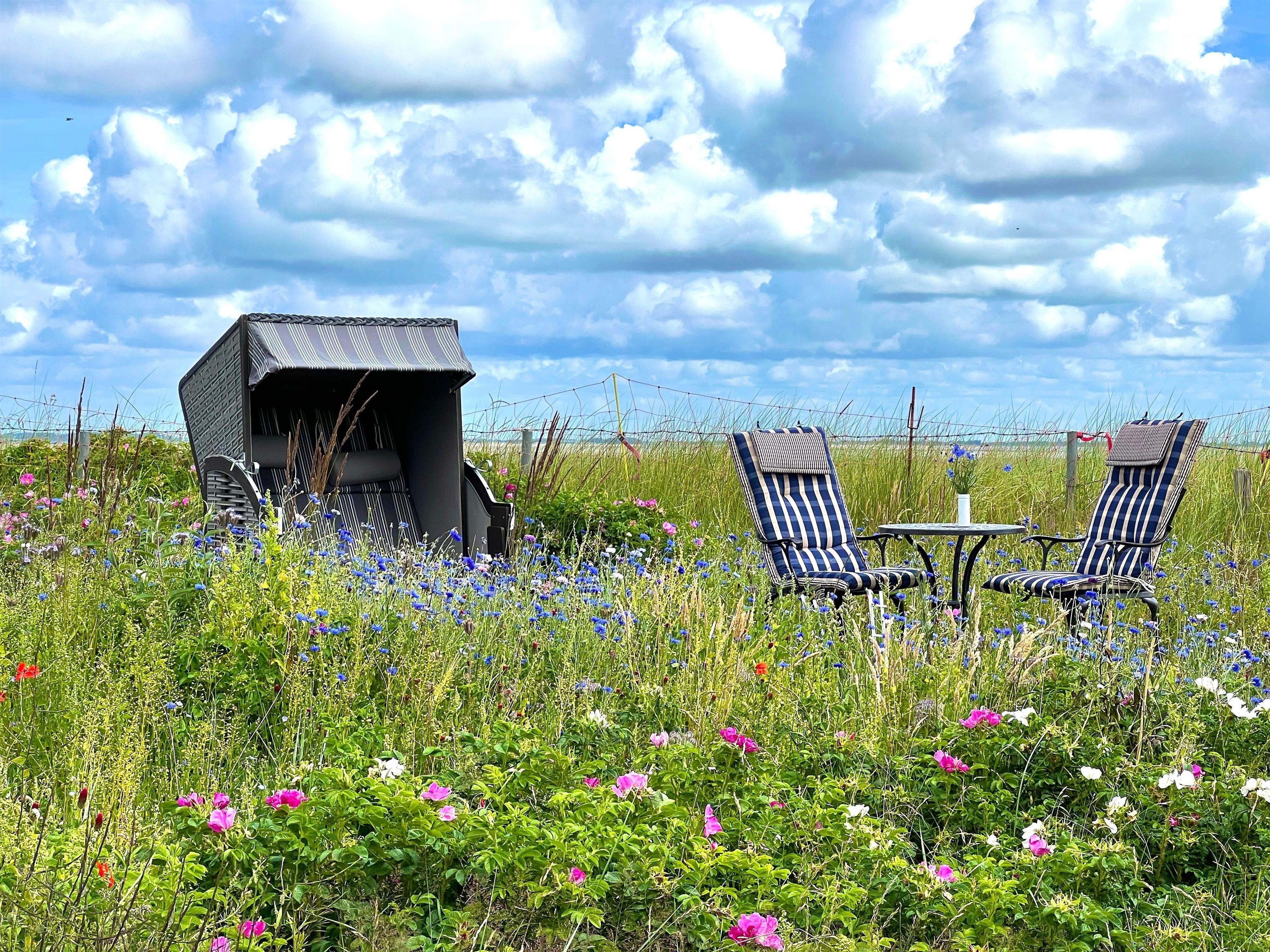 Auf der großen Terrasse befinden sich Gartenmöbel. Ebenfalls gibt es einen Garten mit Blumenwiese, Syltrosen, Strandhafer und traumhaften Meer- und Wattblick, in dem sich noch eine Terrasse mit einem ,Strandkorb befindet. 1 Stellplatz für den PKW ist vorhanden