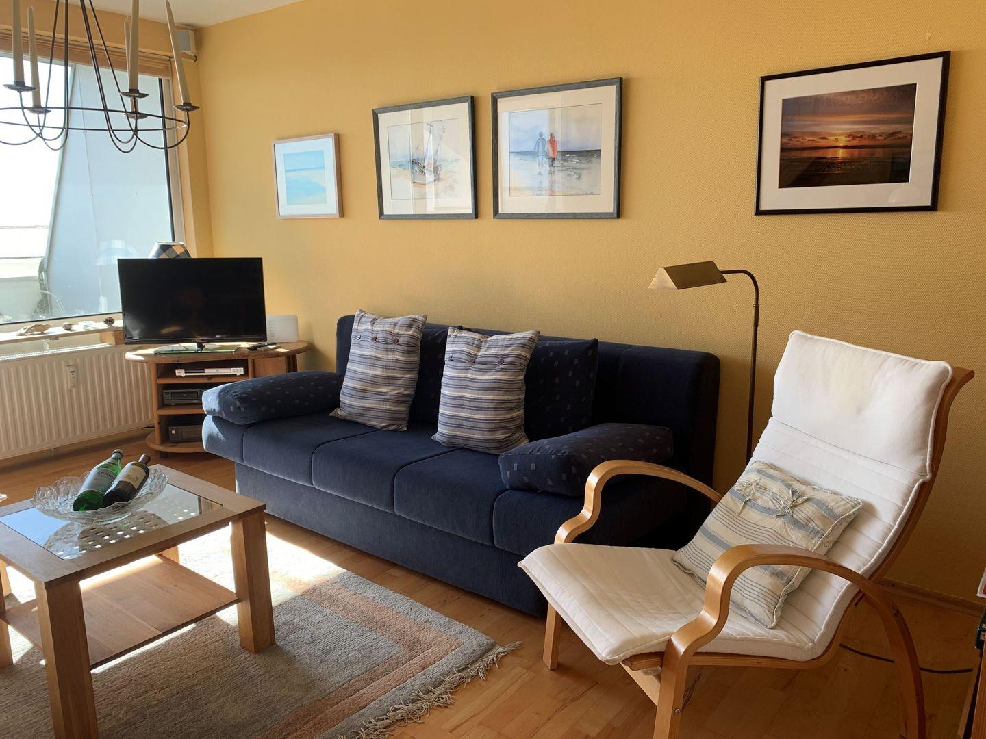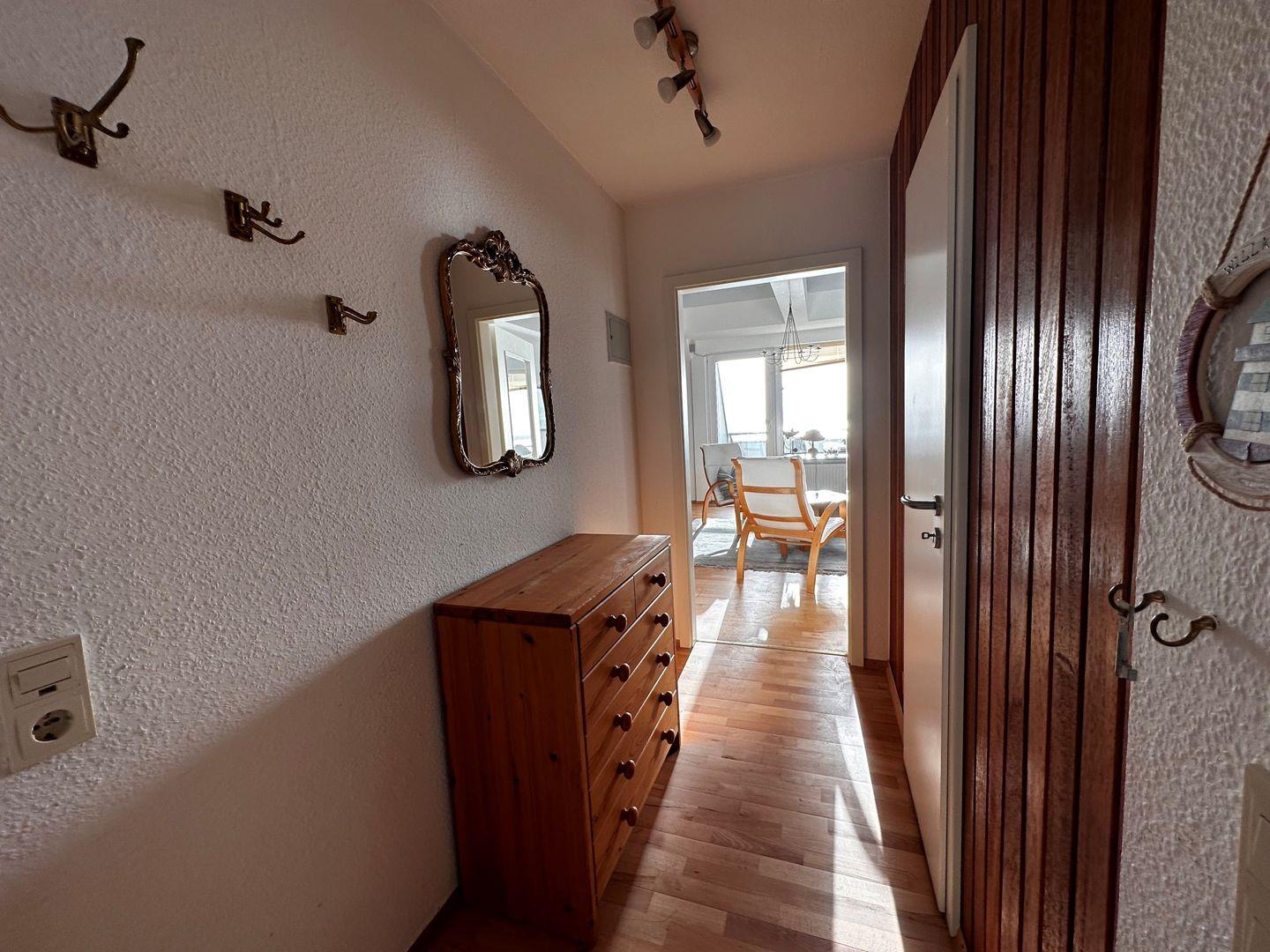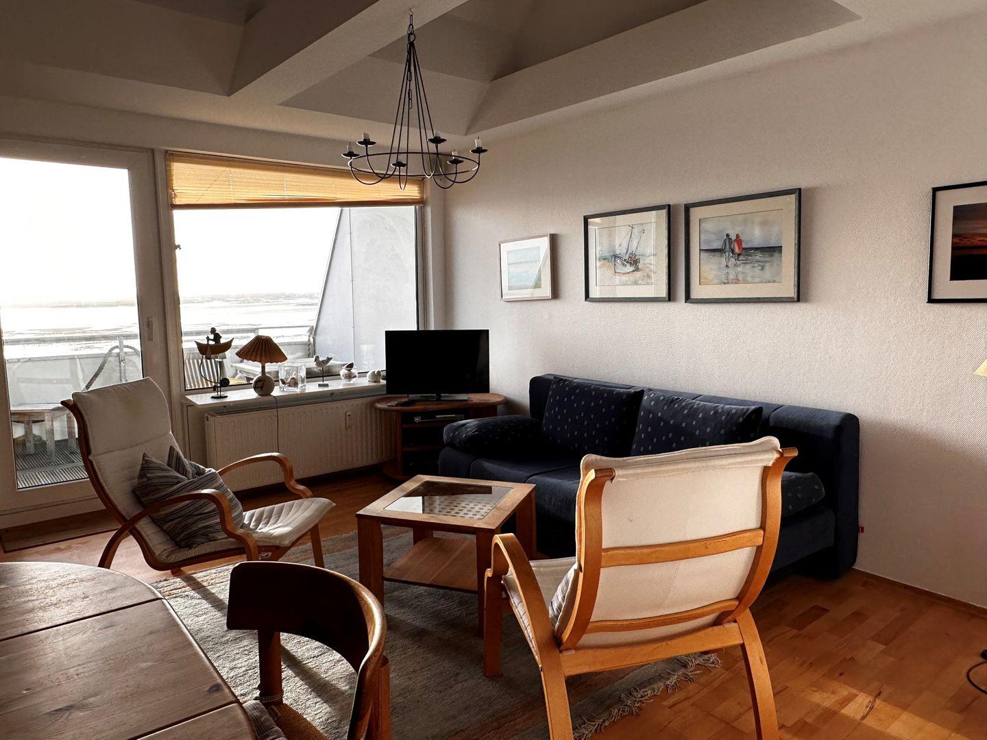 Das geschmackvoll eingerichtete Wohn-/Esszimmer hat einen Ausgang zum Balkon mit Meerblick in Richtung Hallig Hooge und der Insel Pellworm. In der komplett ausgestatteten Küche können sie ihre Mahlzeiten zubereiten. Bei der Zubereitung ihres Kaffees können sie zwischen normaler Maschine und Nespressomaschine entscheiden. Das Schlafzimmer auf der Empore ist mit einem Doppelbett und einem Kleiderschrank sowie stilvollen Accesoires ausgestattet..Das zweite Schlafzimmer ist ebenfalls mit einem Doppelbett ausgestattet.