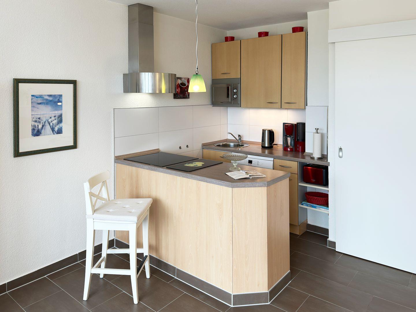 Die Wohnung verfügt über 1 Wohnraum mit Sat-TV und offener Küche, 1 Schlafzimmer, 1 Badezimmer mit Dusche und WC, seitlicher Blick zum Wattenmeer und dem Yachthafen.