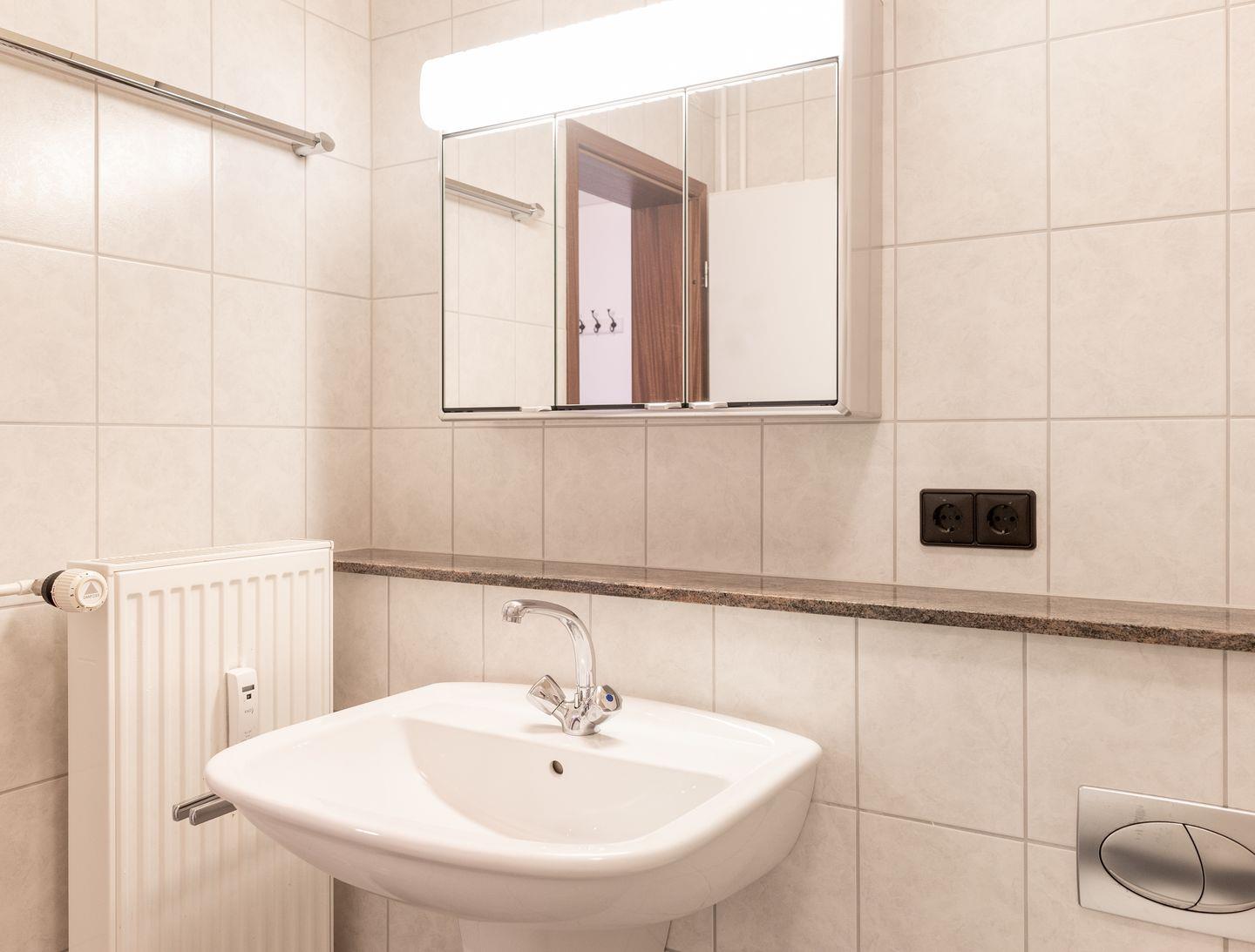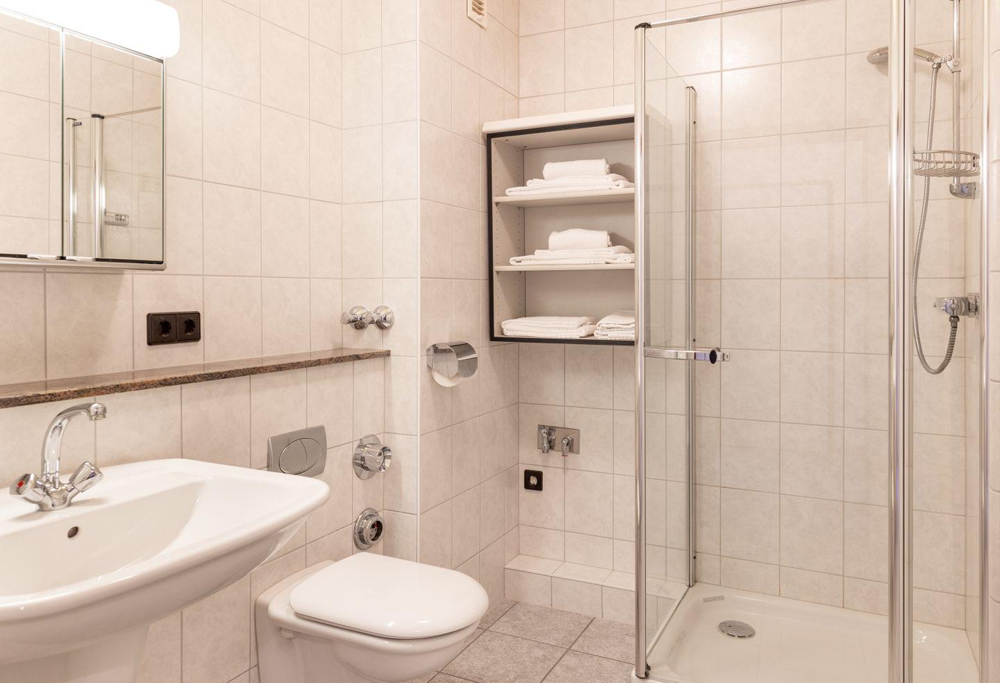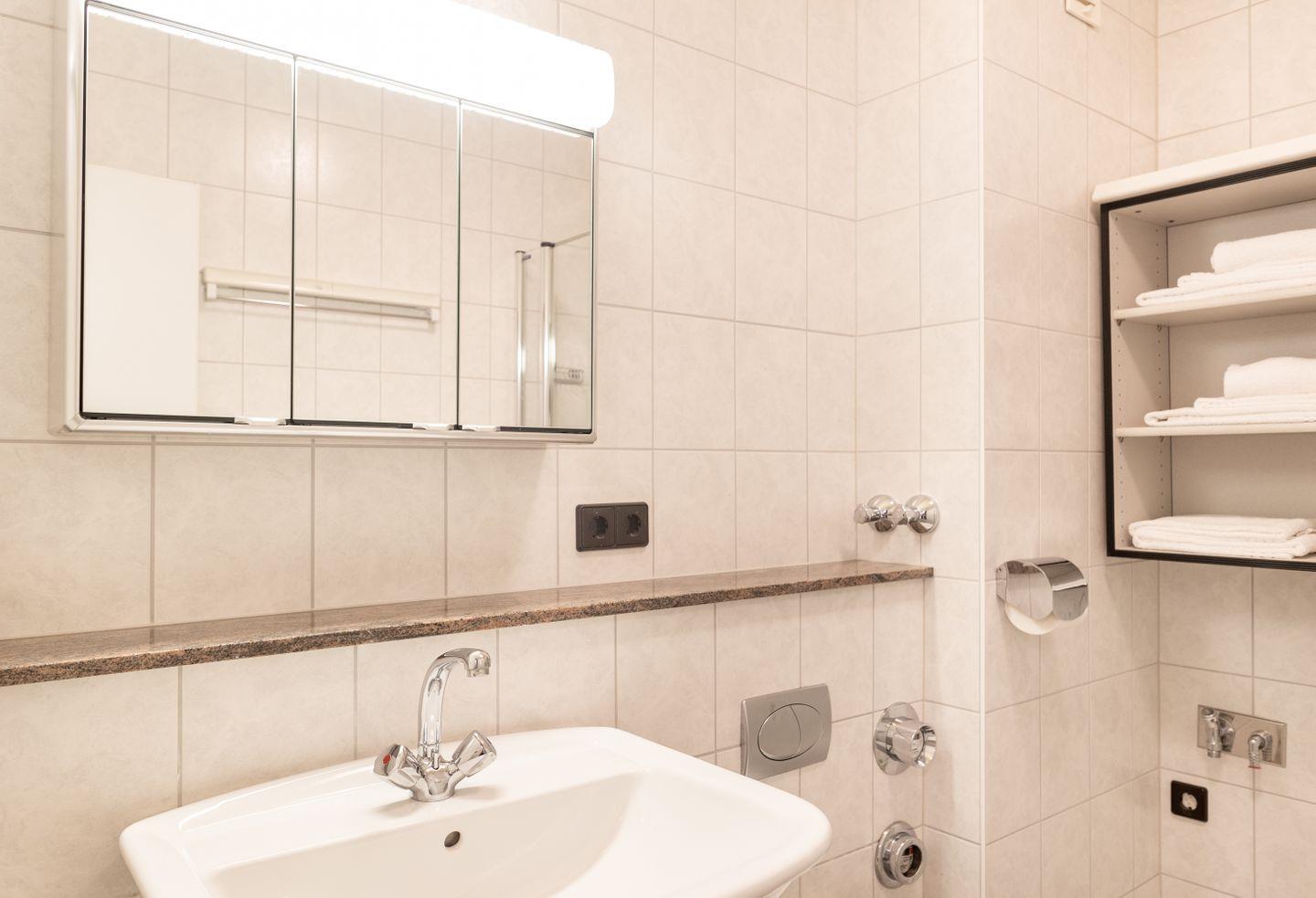 Die Wohnung verfügt über ein modernes Badezimmer mit bodengleicher Dusche, Waschbecken und WC. Handtücher und Haartrockner sind für Ihren Komfort bereits vorhanden.