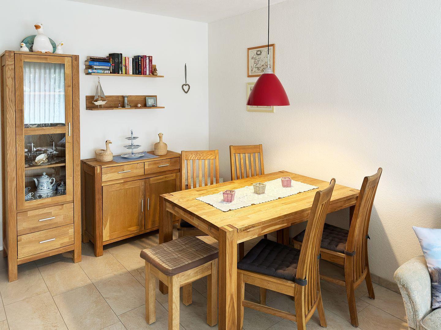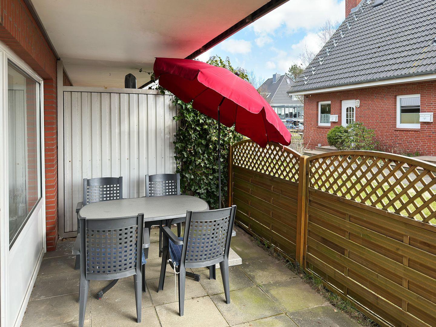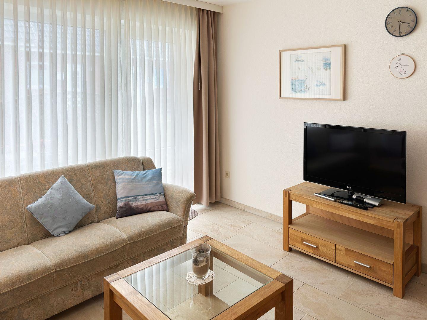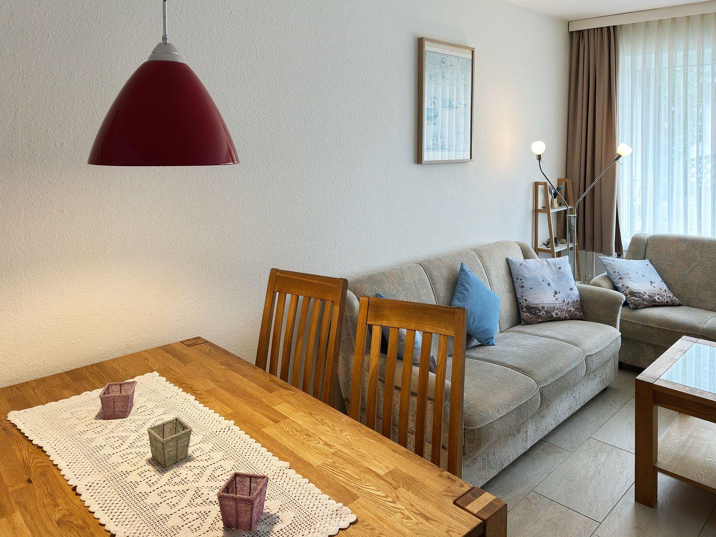 Die Wohnung verfügt über einen Wohnraum mit WLAN, Sat-TV, Küche, ein Schlafzimmer, ein Badezimmer mit Dusche und WC; eine offene Süd-Terrasse mit 4 Gartenstühlen und Tisch (April bis Oktober) sowie Blick über die Straße auf die Dünen. Eine Münz-Waschmaschine und ein Münz-Trockner stehen zur Gemeinschaftsnutzung im Keller des Hauses 1c zur Verfügung.