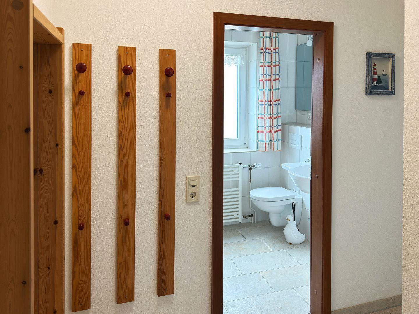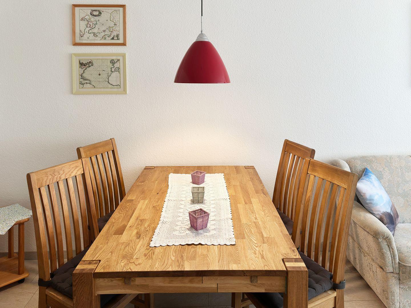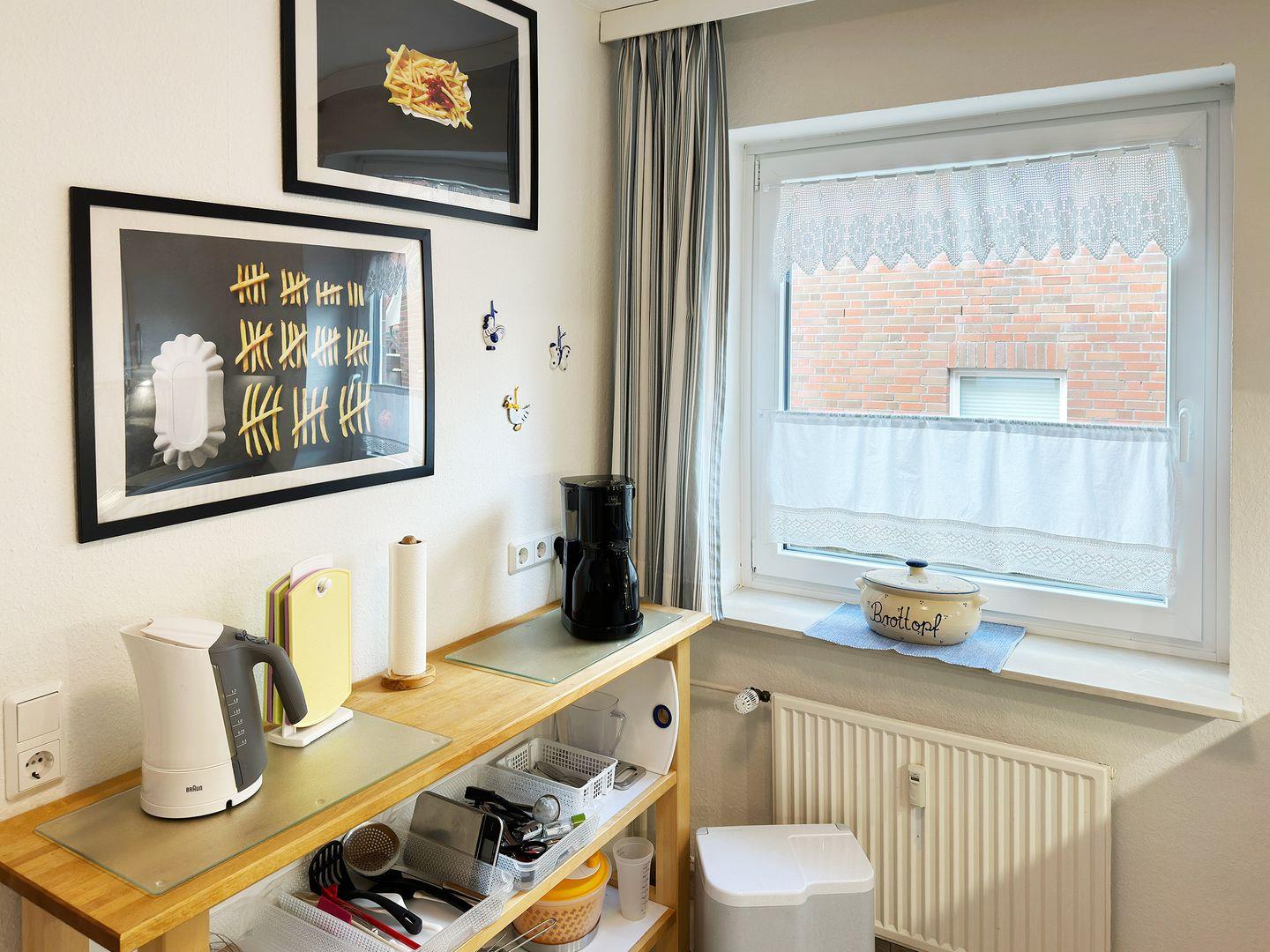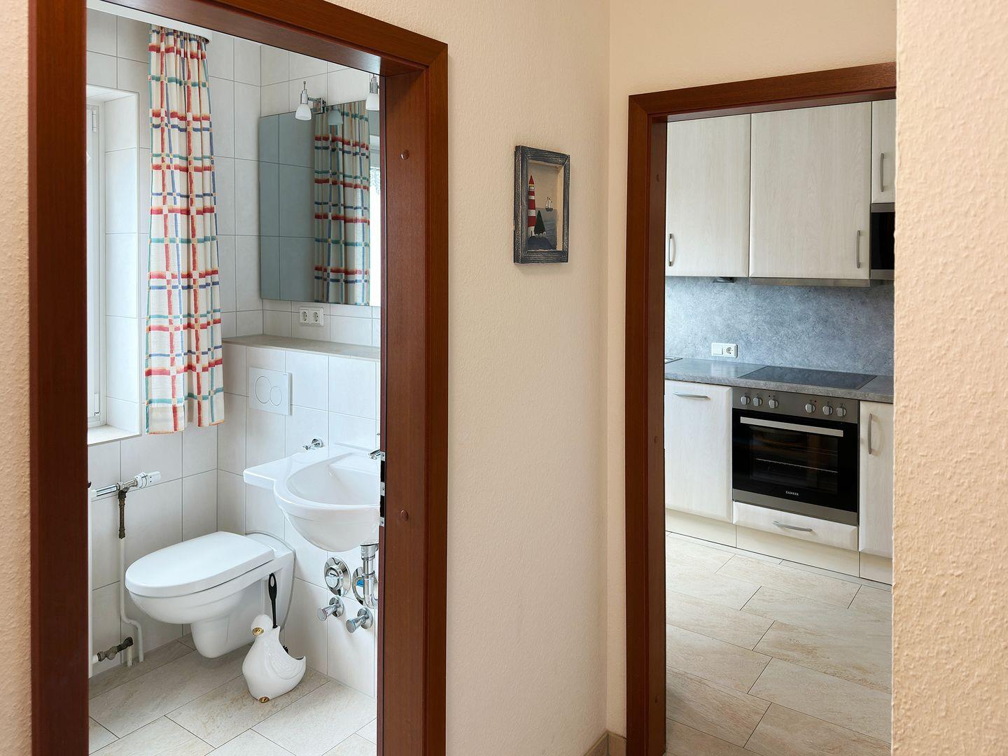 Die Wohnung verfügt über einen Wohnraum mit WLAN, Sat-TV, Küche, ein Schlafzimmer, ein Badezimmer mit Dusche und WC; eine offene Süd-Terrasse mit 4 Gartenstühlen und Tisch (April bis Oktober) sowie Blick über die Straße auf die Dünen. Eine Münz-Waschmaschine und ein Münz-Trockner stehen zur Gemeinschaftsnutzung im Keller des Hauses 1c zur Verfügung.