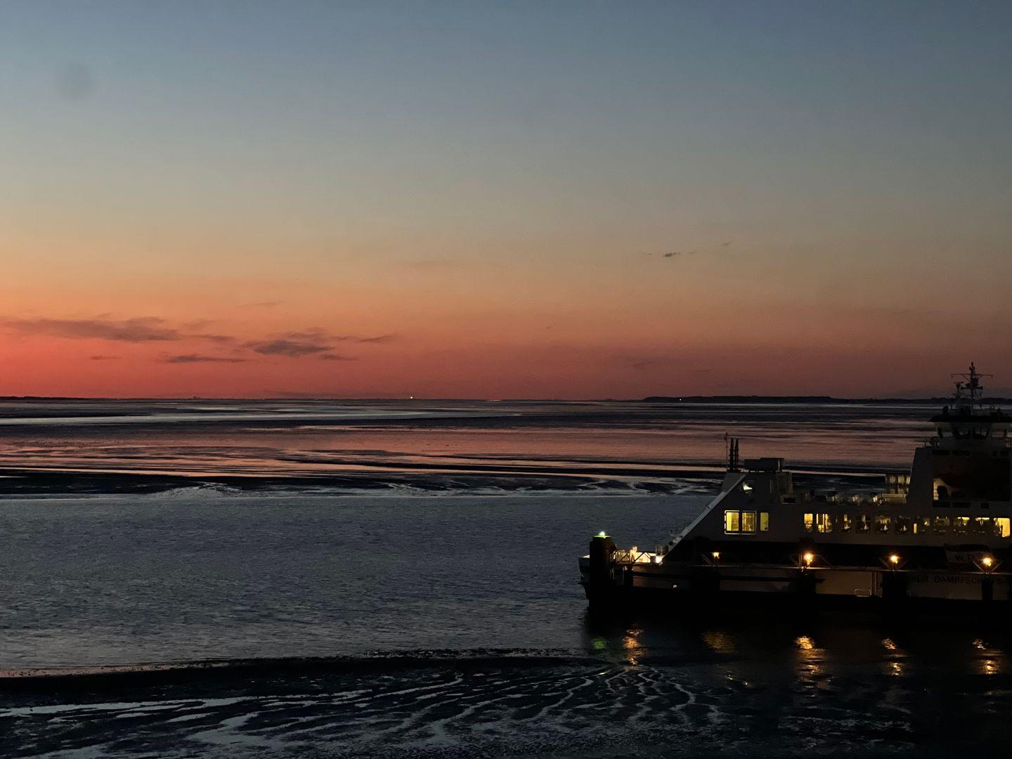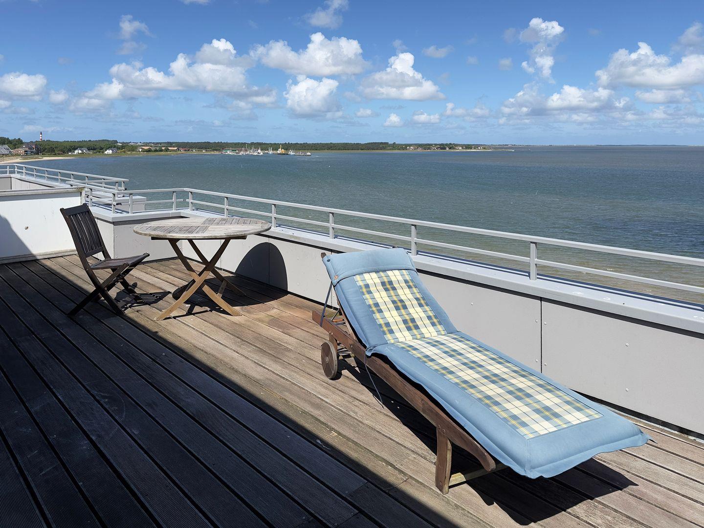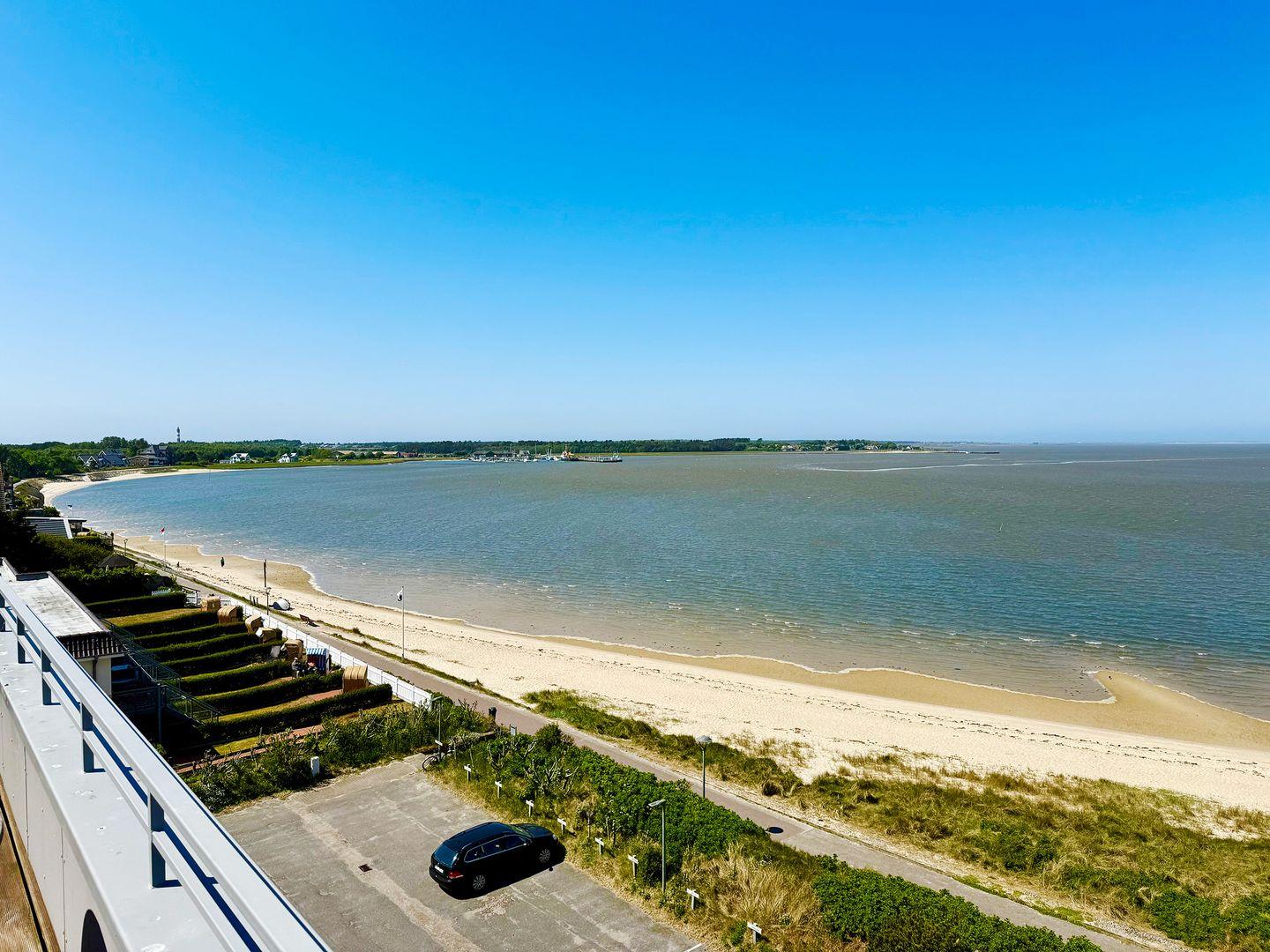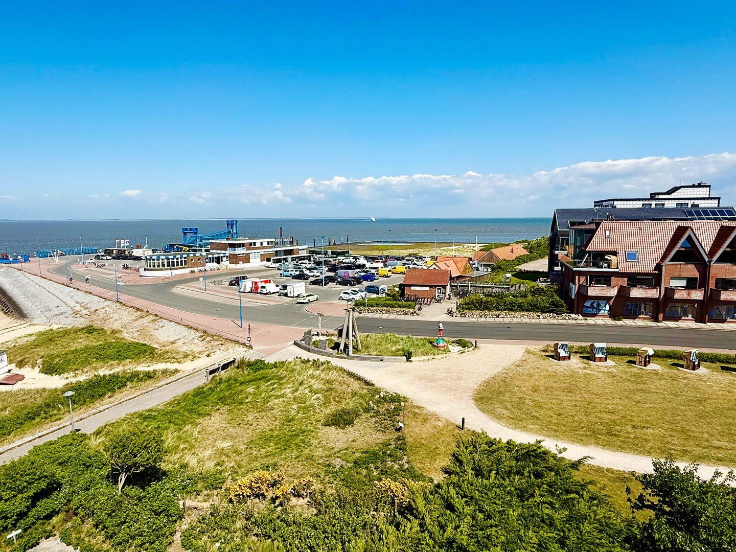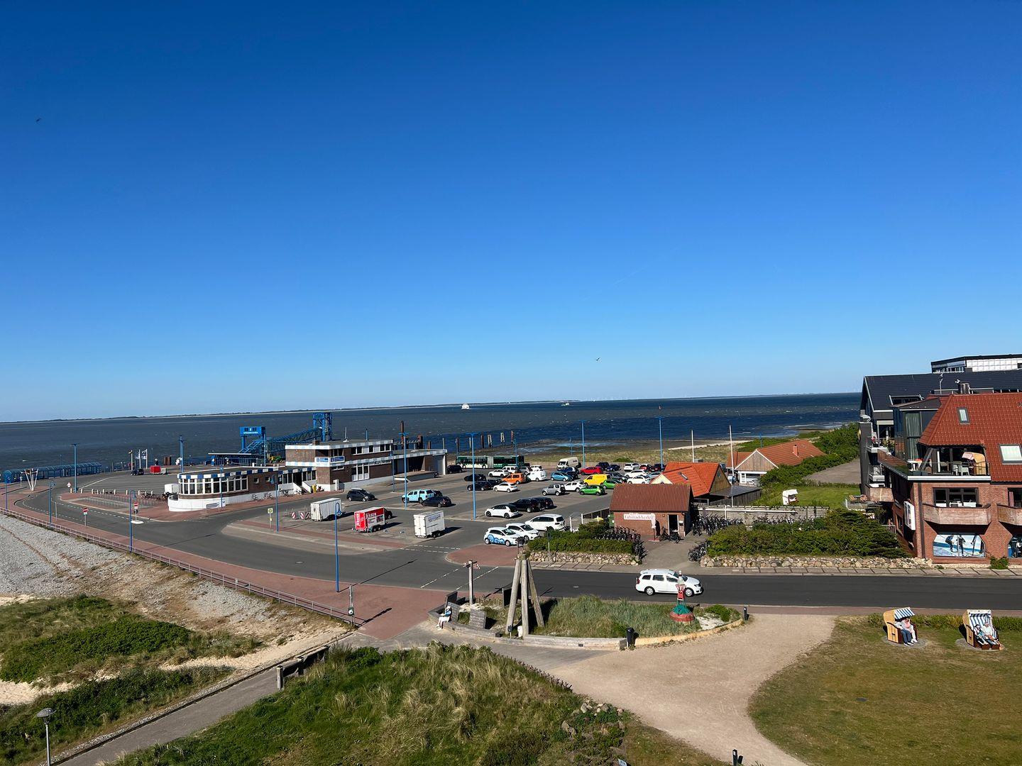 Die Wohnung verfügt über 1 Wohnraum mit Sat-TV und offener Küche, 1 Badezimmer mit Dusche und WC, Blick zum Wattenmeer zum Fähranleger und zum Yachthafen sowie nach Föhr, nach Sylt und zu den Halligen. Die Wohnung verfügt über einen 42qm großen Eckbalkon Richtung Osten und Norden. Sonnenaufgänge und Sonnenuntergänge sind inklusive.