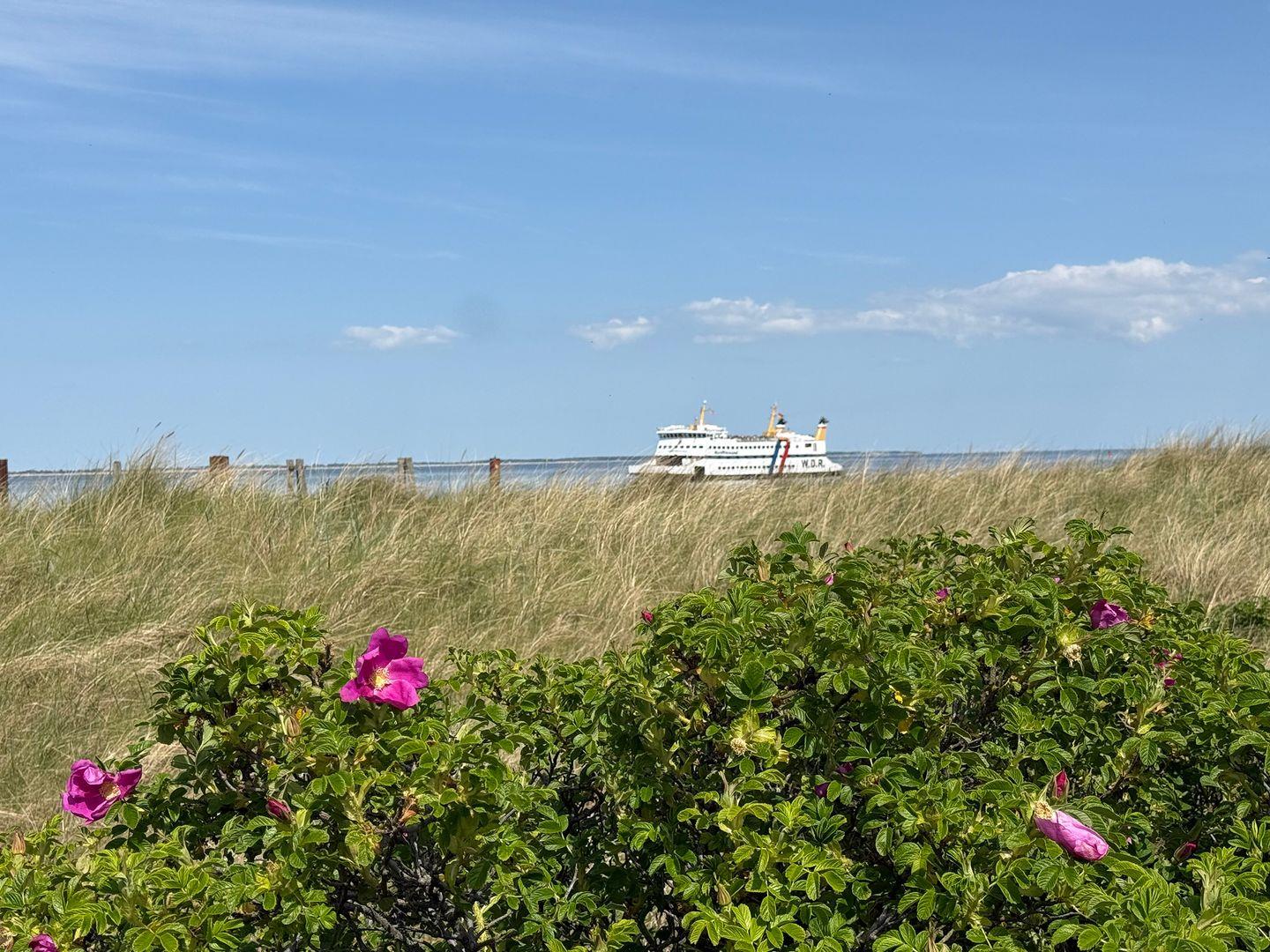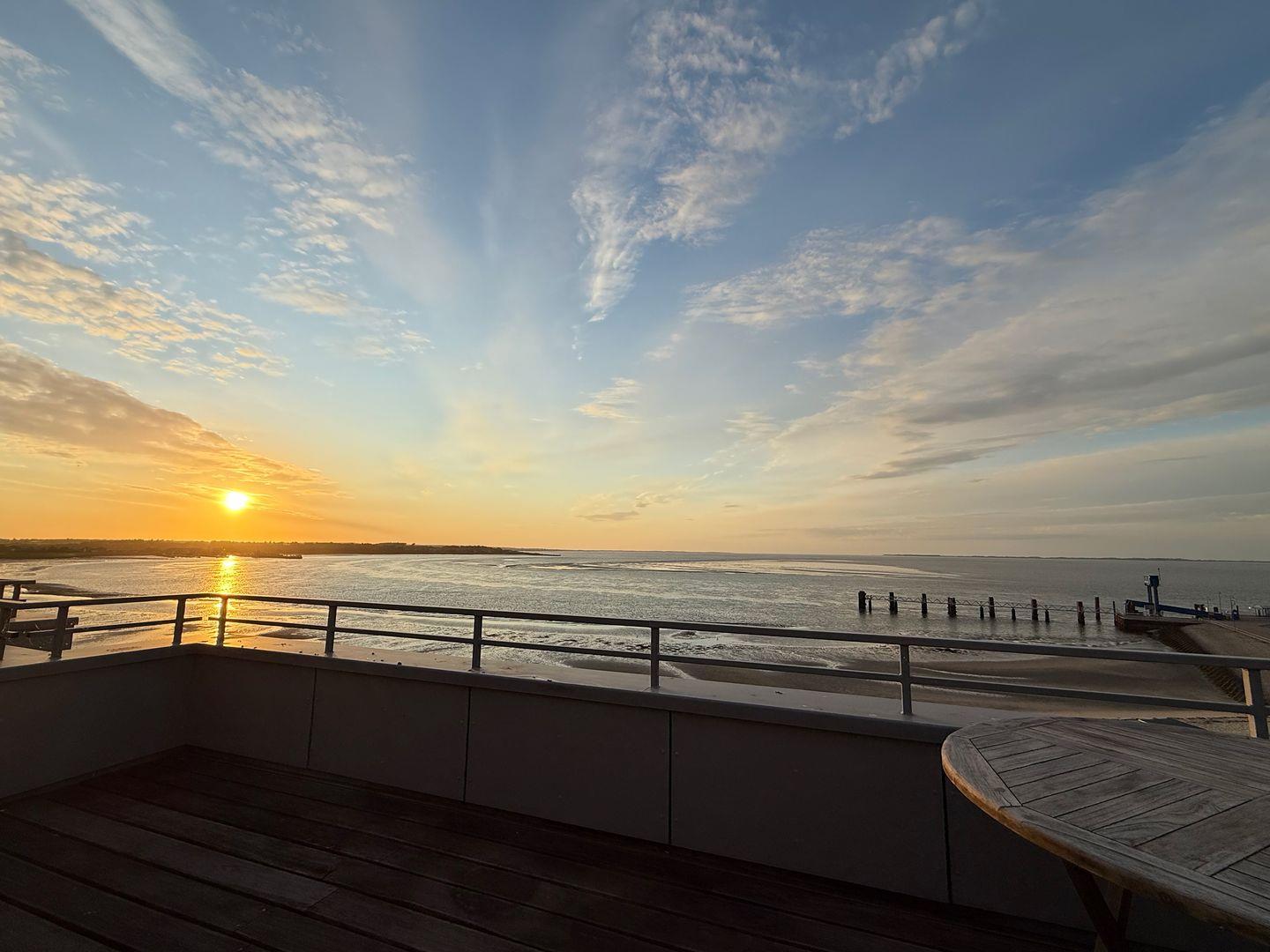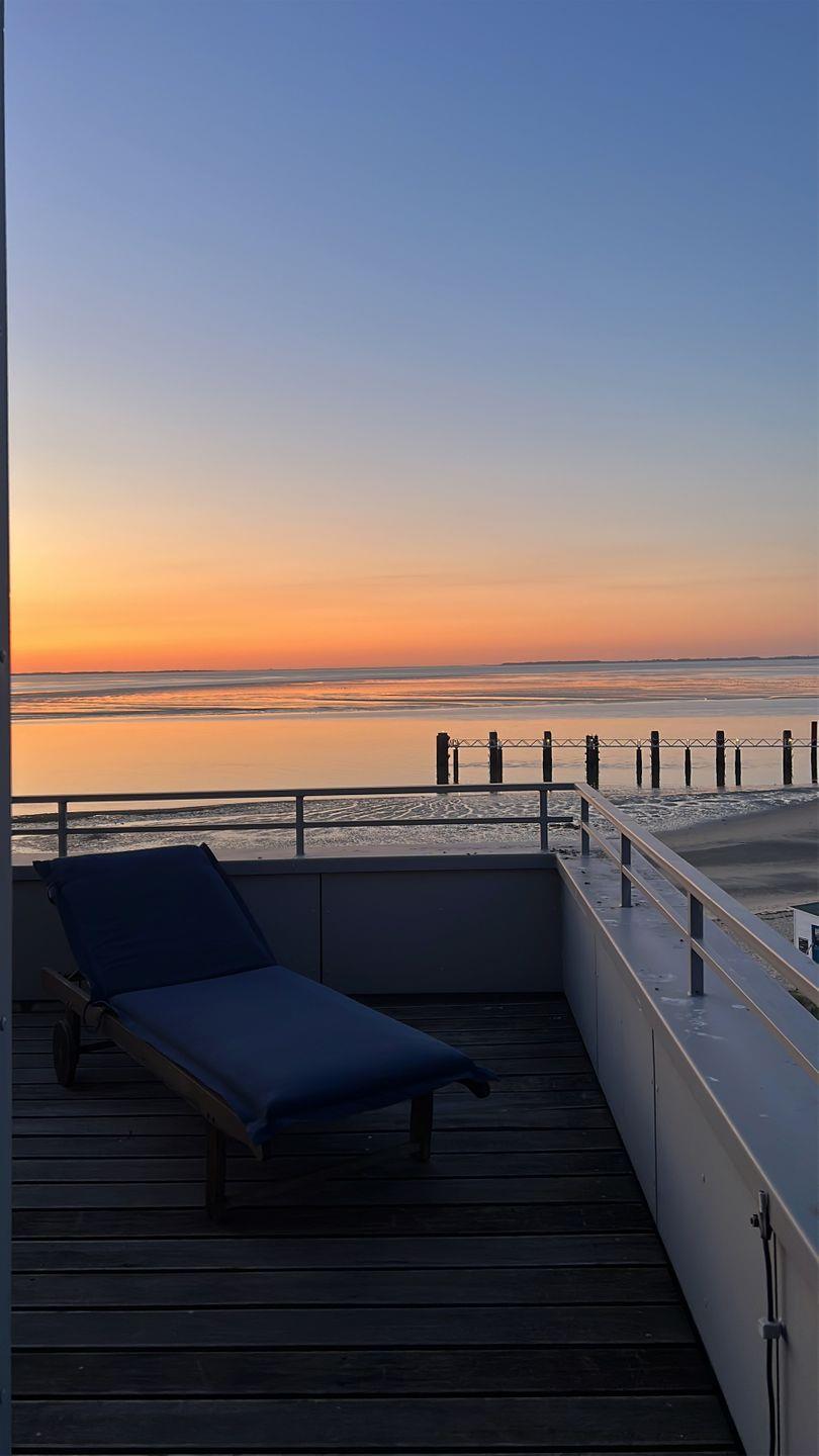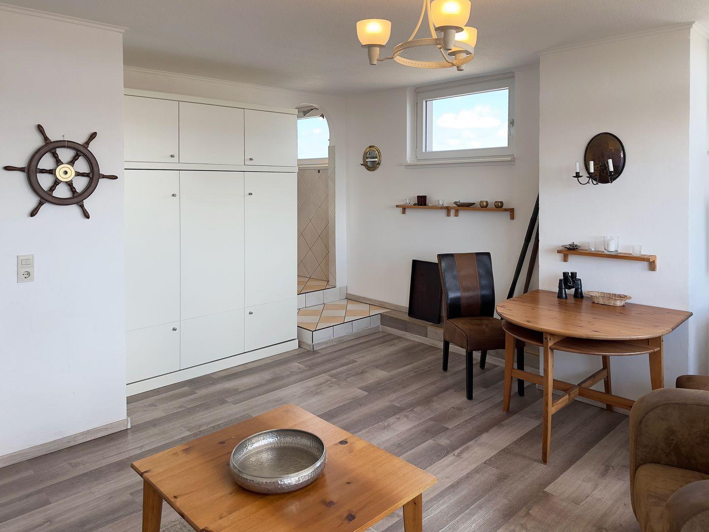 Die Wohnung verfügt über 1 Wohnraum mit Sat-TV und offener Küche, 1 Badezimmer mit Dusche und WC, Blick zum Wattenmeer zum Fähranleger und zum Yachthafen sowie nach Föhr, nach Sylt und zu den Halligen. Die Wohnung verfügt über einen 42qm großen Eckbalkon Richtung Osten und Norden. Sonnenaufgänge und Sonnenuntergänge sind inklusive.