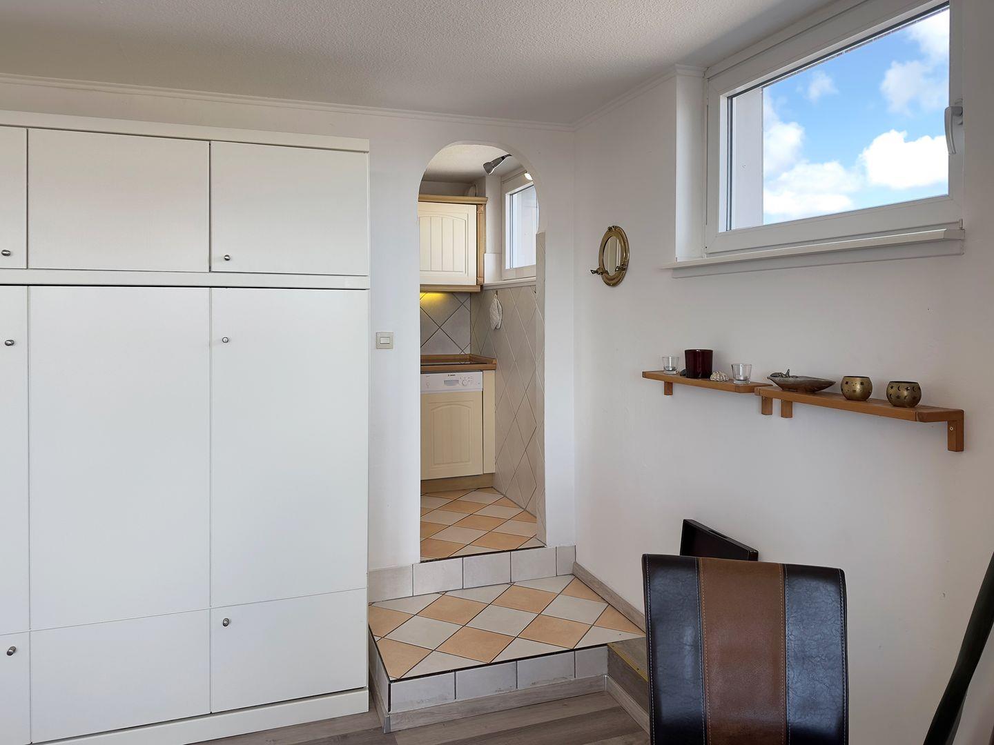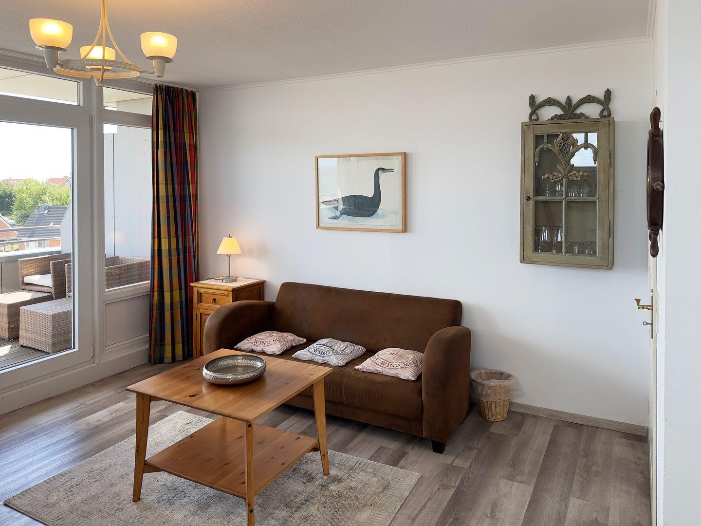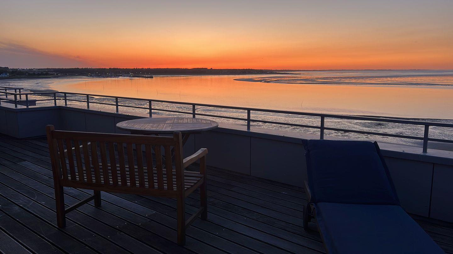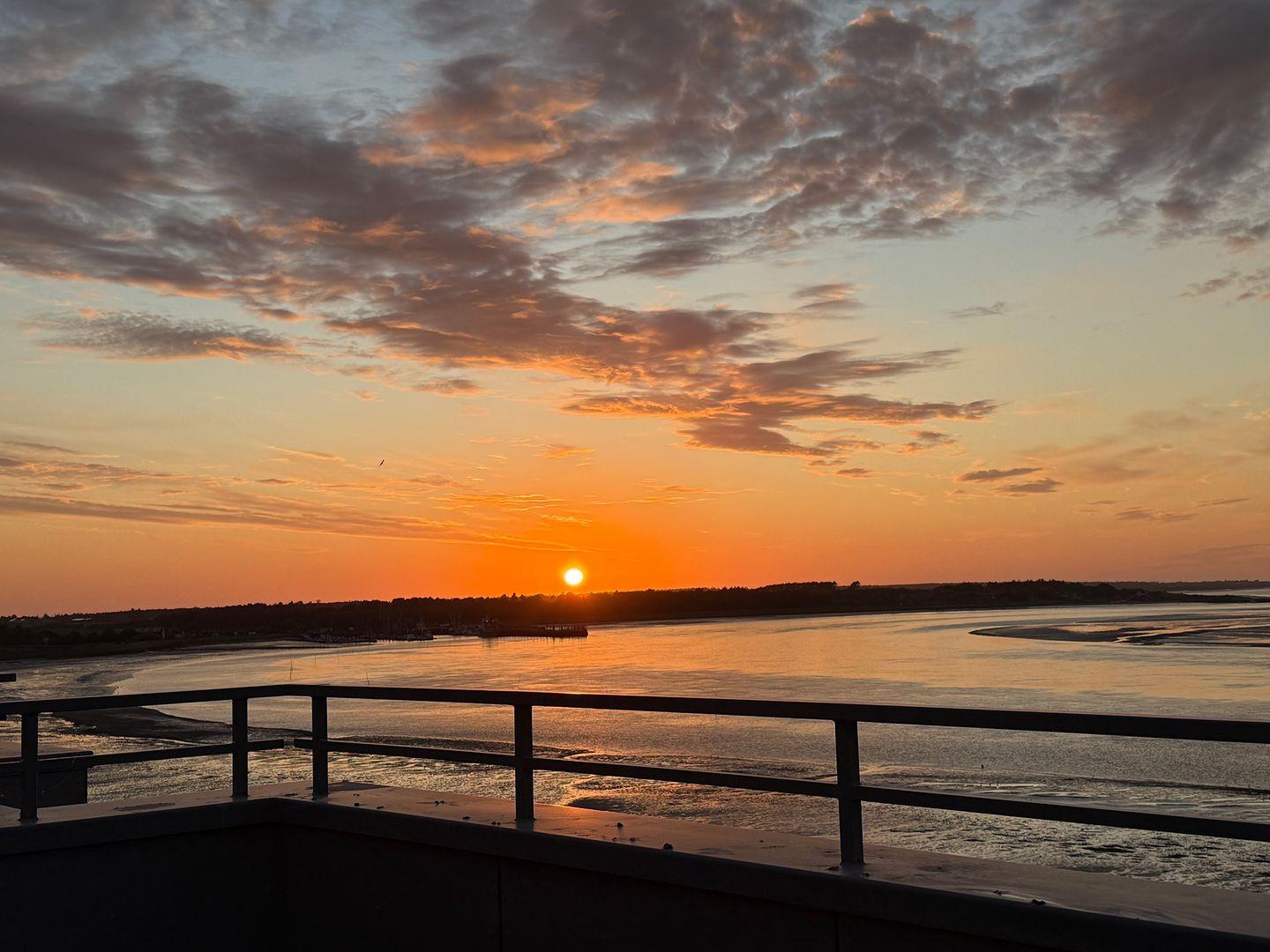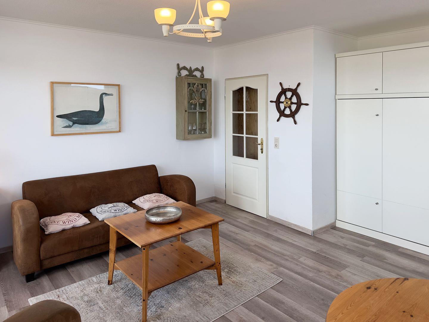 Die Wohnung verfügt über 1 Wohnraum mit Sat-TV und offener Küche, 1 Badezimmer mit Dusche und WC, Blick zum Wattenmeer zum Fähranleger und zum Yachthafen sowie nach Föhr, nach Sylt und zu den Halligen. Die Wohnung verfügt über einen 42qm großen Eckbalkon Richtung Osten und Norden. Sonnenaufgänge und Sonnenuntergänge sind inklusive.