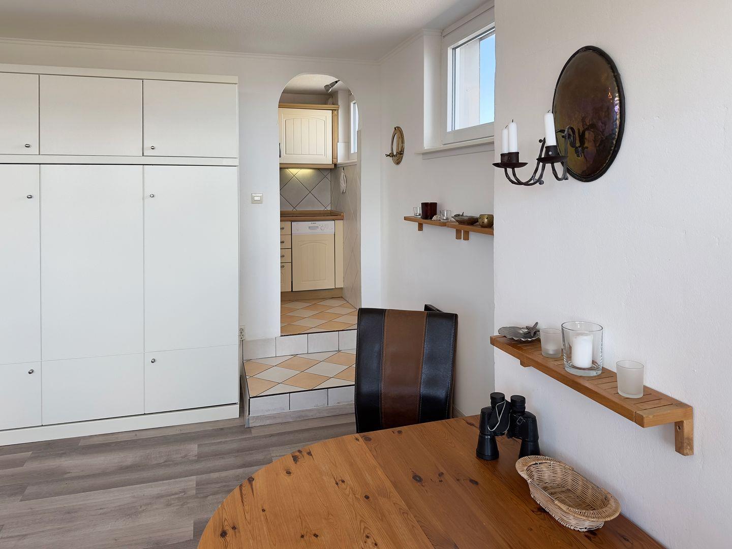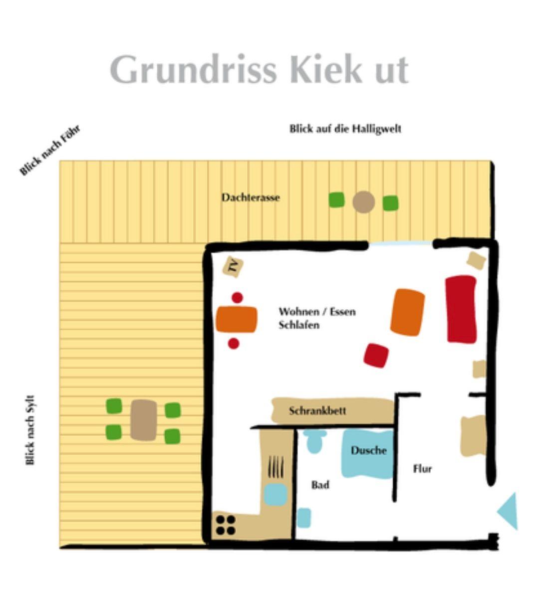 Die Ferienwohnung „Kiek-ut" im 3. Obergeschoss des Hauses „Nordenlicht" in Wittdün auf Amrum ist eine 1-Zimmer-Ferienwohnung (ca. 36 qm Grundfläche) mit Schlafmöglichkeiten für 1 bis 2 Personen.