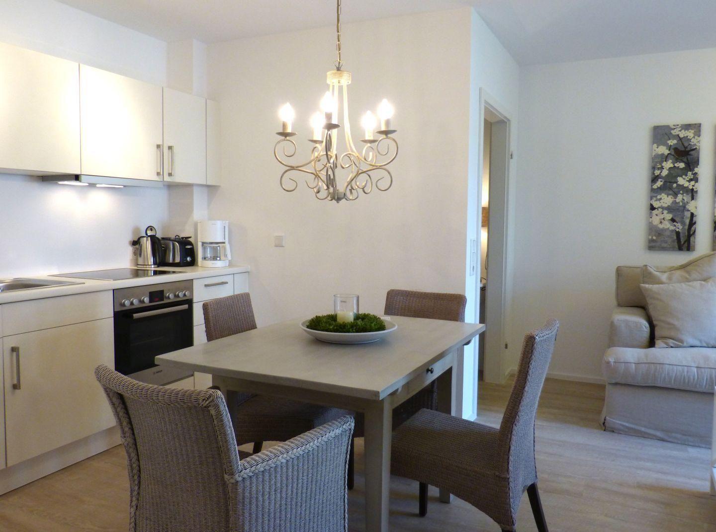 Die Wohnung verfügt über 1 Wohnraum mit WLAN, Sat-TV und offener Küche, 1 Schlafzimmer, 1 Badezimmer mit Dusche und WC; ein Ost-Balkon mit Gartenmöbeln (April bis Oktober) und Blick auf das Wattenmeer.