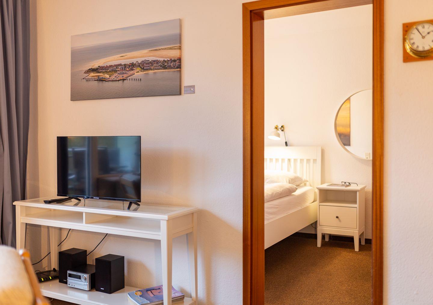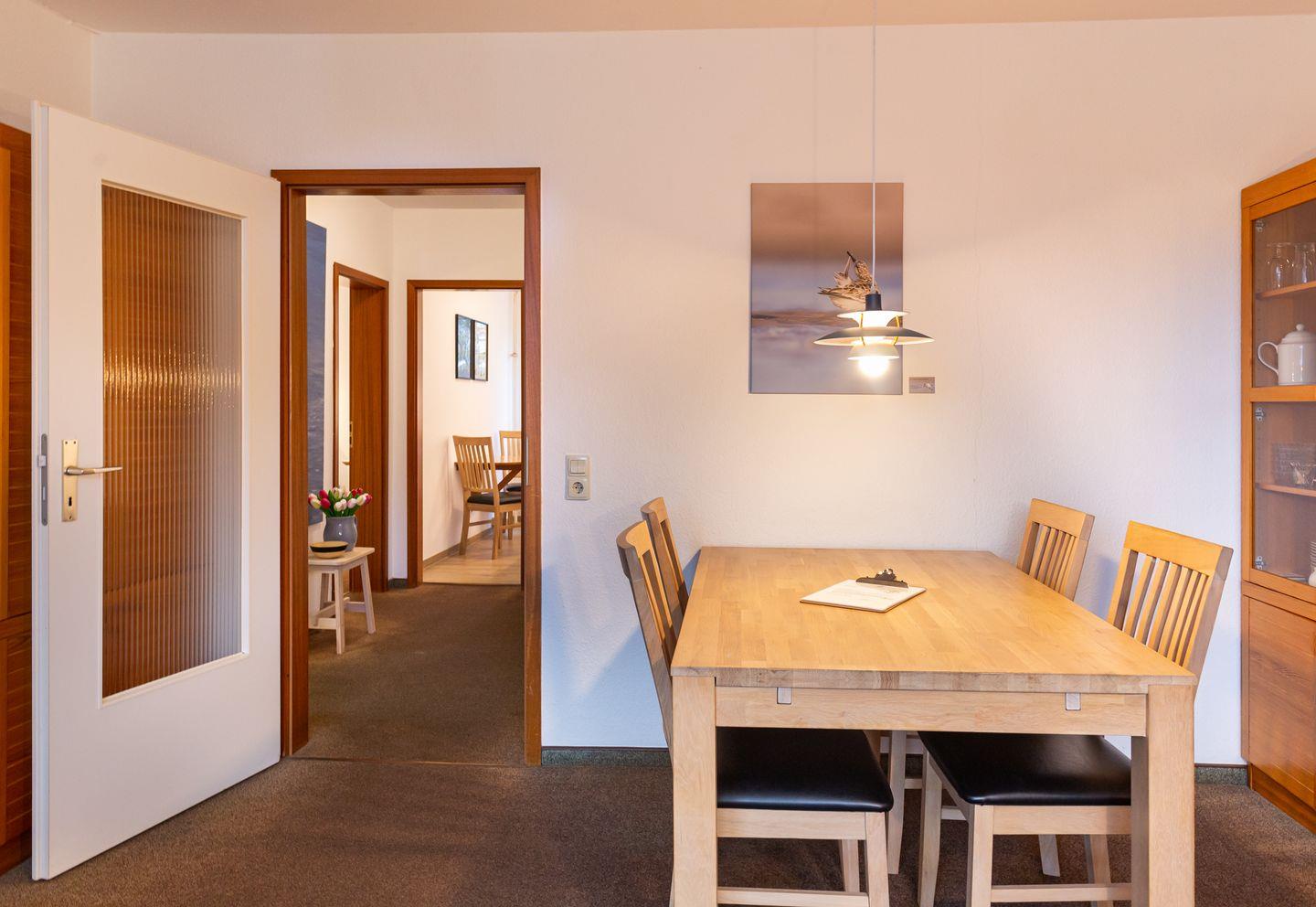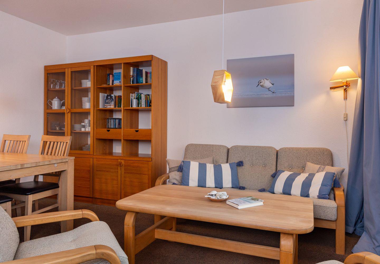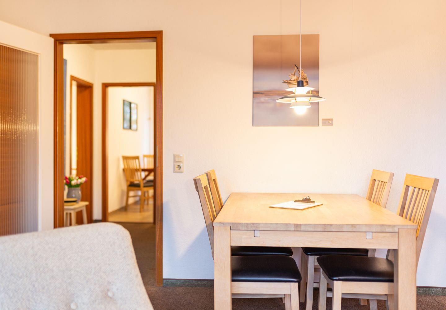 Die Ferienwohnung "Lürßen" im Haus am Seezeichen befindet sich in ruhiger Lage in der Mittelstraße in Wittdün. Vom Balkon haben Sie einen schönen Blick in den Kurpark. Die Wohnung bietet Platz für 4 Personen. Ihr Hund darf in dieser Wohnung gerne mitreisen. Es gibt zwei helle Schlafzimmer. Ein Schlafzimmer ist mit einem Doppelbett ausgestattet. In dem zweiten Schlafzimmer stehen zwei Einzelbetten. Die Küche ist separat und hat einen kleinen eigenen Essplatz.