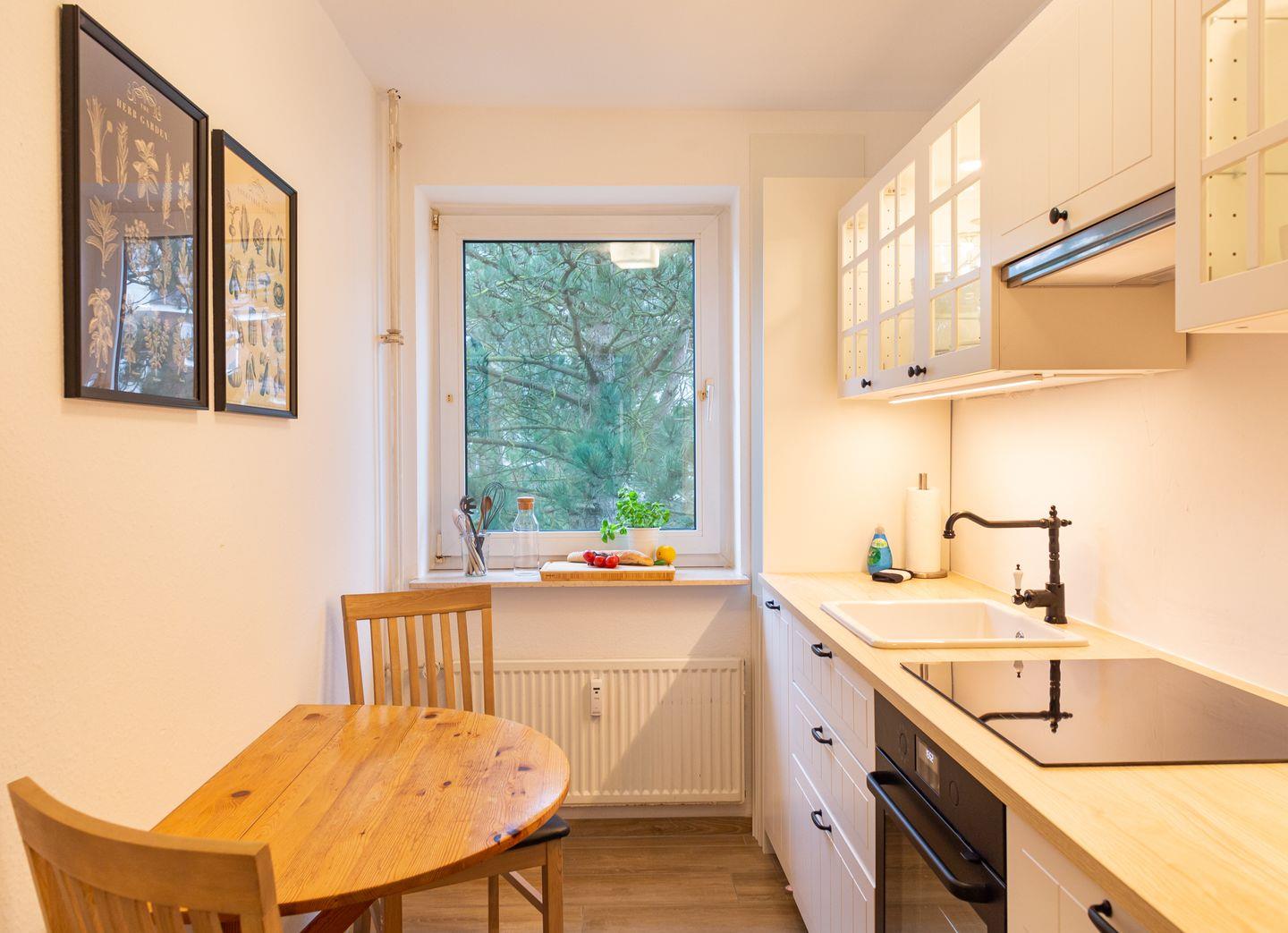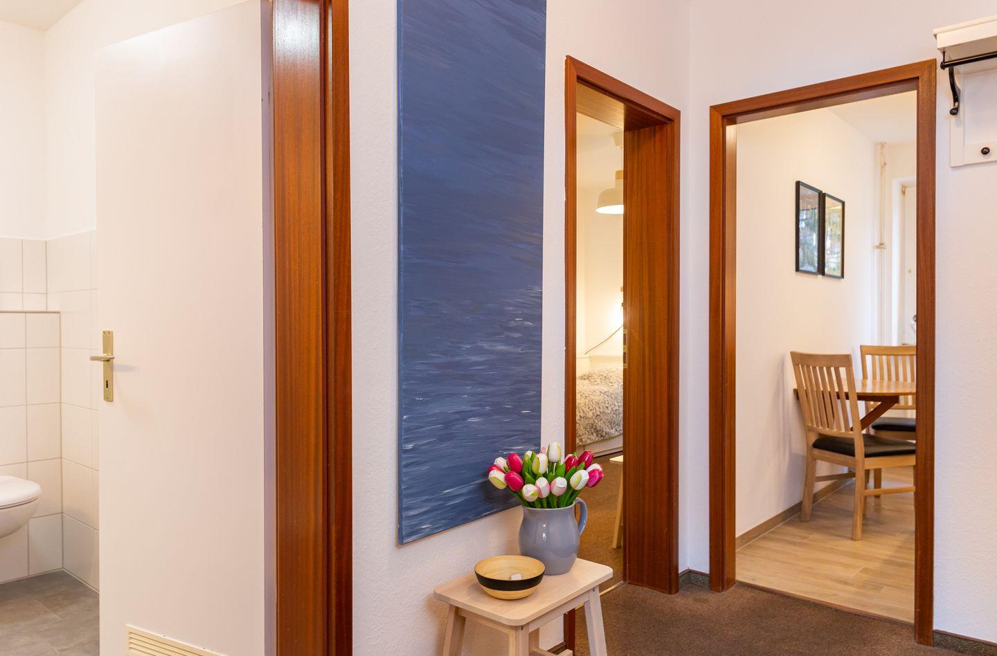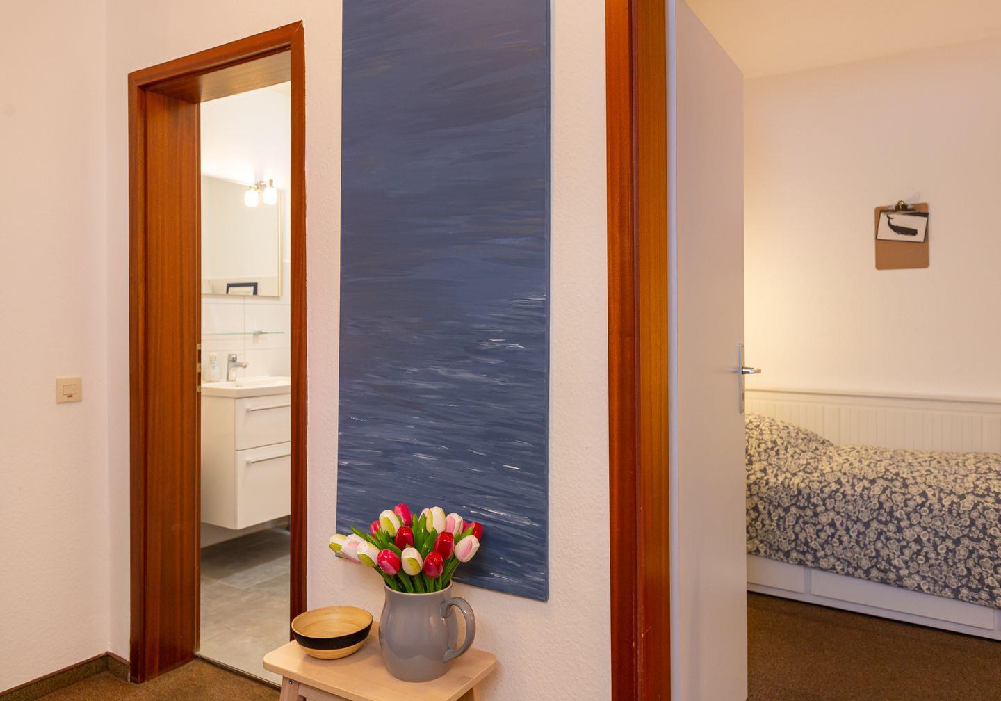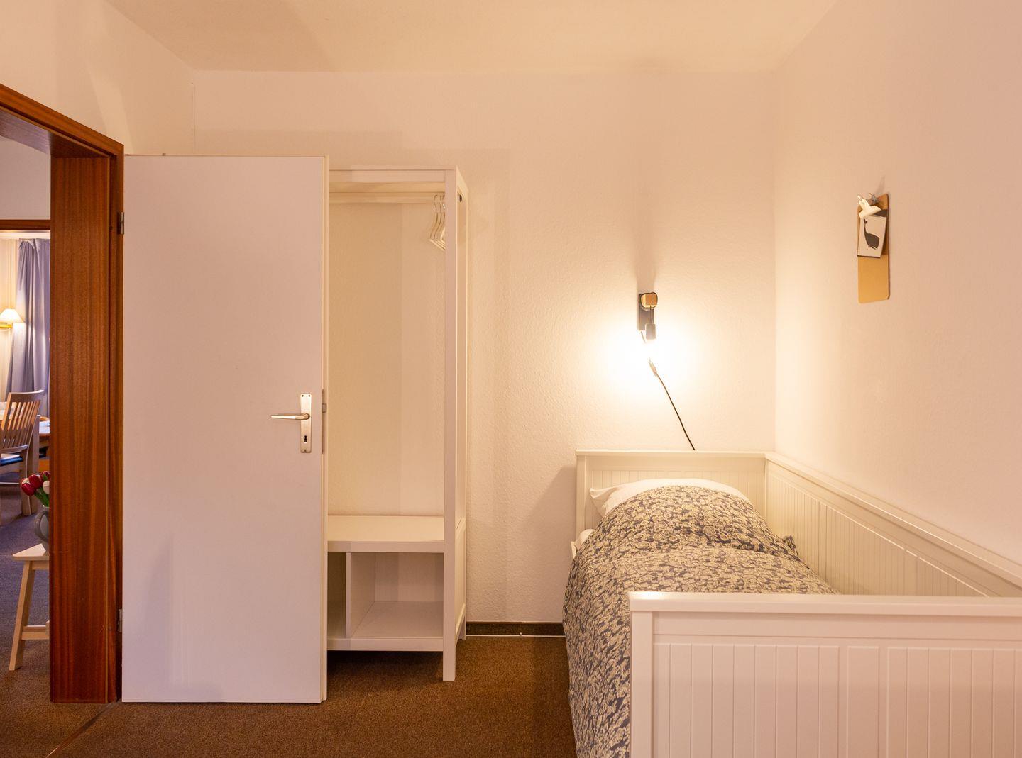 Die Ferienwohnung "Lürßen" im Haus am Seezeichen befindet sich in ruhiger Lage in der Mittelstraße in Wittdün. Vom Balkon haben Sie einen schönen Blick in den Kurpark. Die Wohnung bietet Platz für 4 Personen. Ihr Hund darf in dieser Wohnung gerne mitreisen. Es gibt zwei helle Schlafzimmer. Ein Schlafzimmer ist mit einem Doppelbett ausgestattet. In dem zweiten Schlafzimmer stehen zwei Einzelbetten. Die Küche ist separat und hat einen kleinen eigenen Essplatz.
