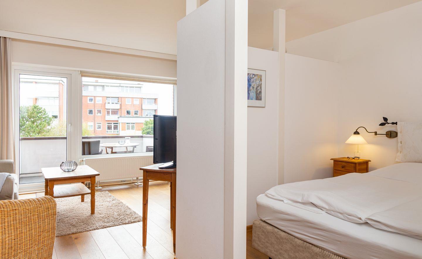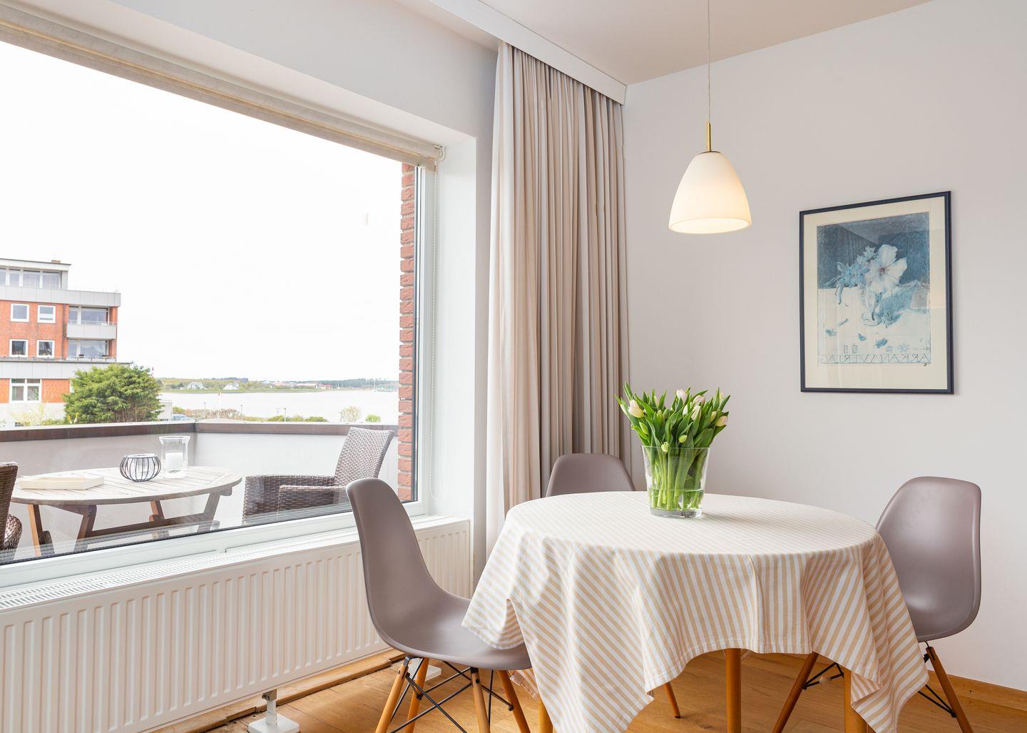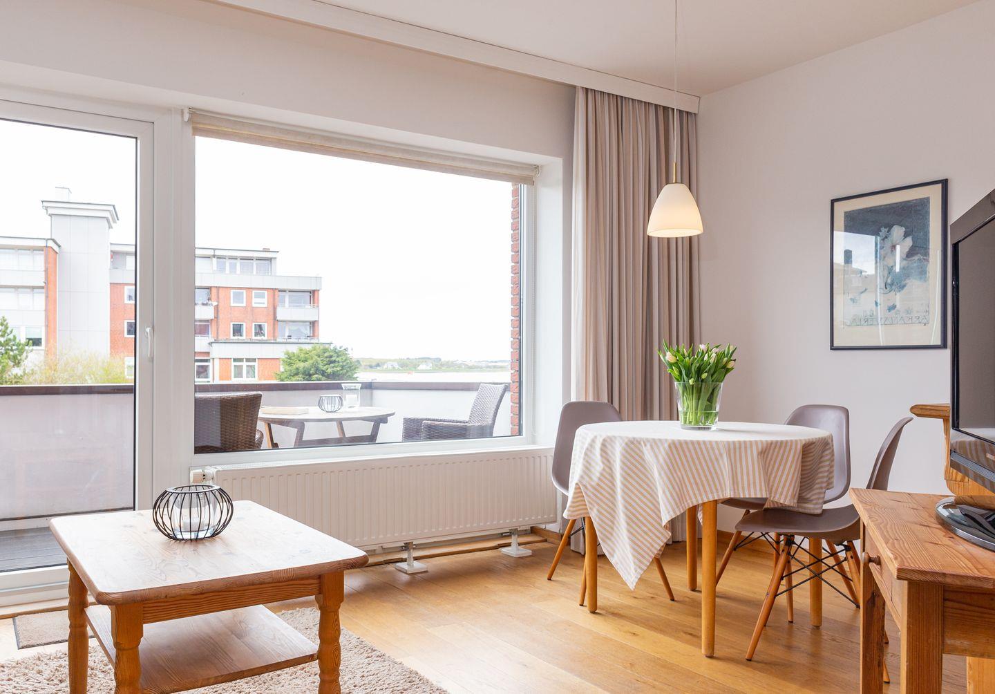 Die Wohnung 4 liegt in der ersten Etage im Ferienhaus Jungnamen Sand und zeigt Richtung Westen. Es finden 2 Personen auf 43 qm geschmackvoll eingerichteter Wohnfläche genügend Platz. Die Wohnung hat einen wunderschönen Meerblick.