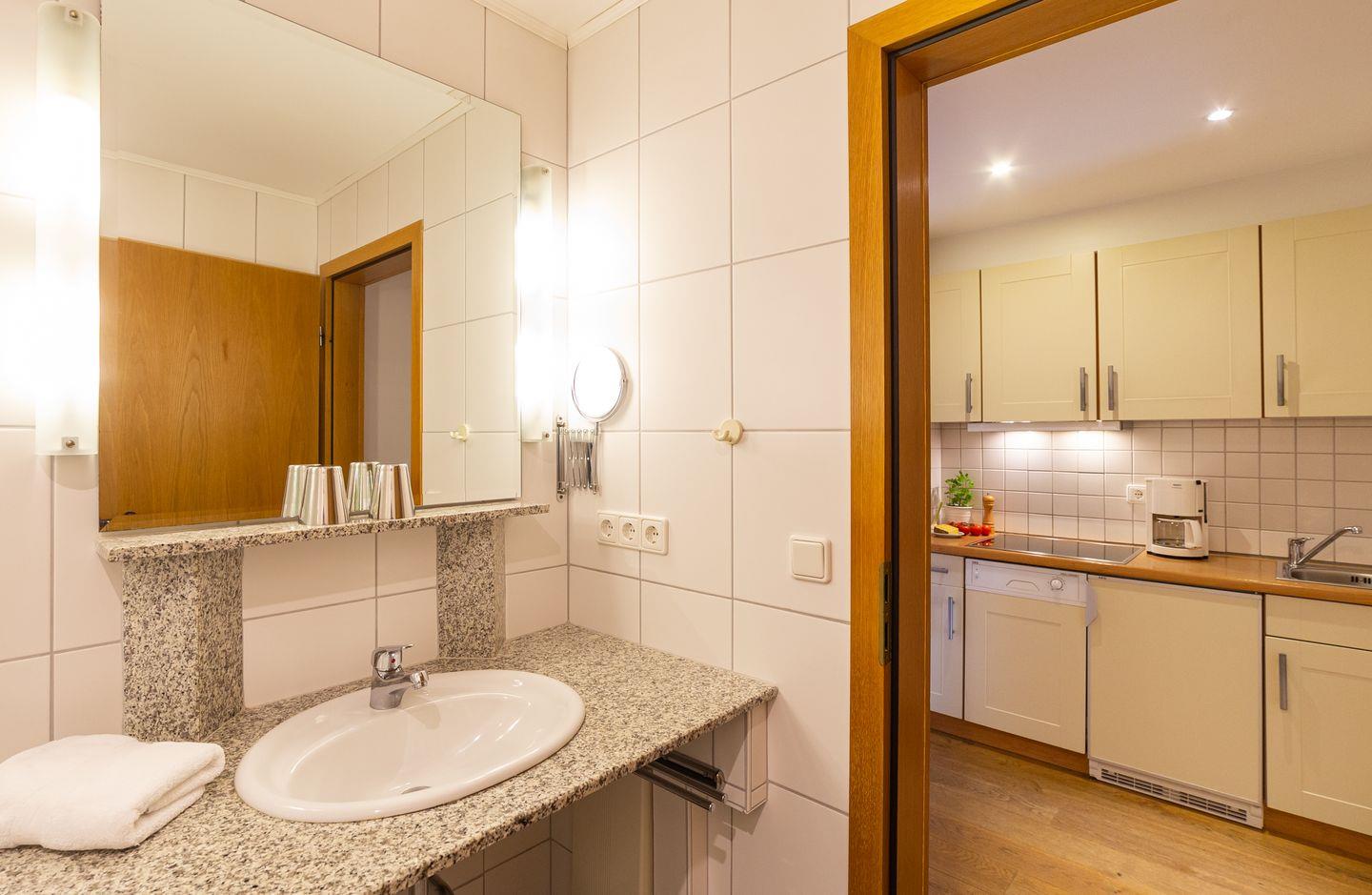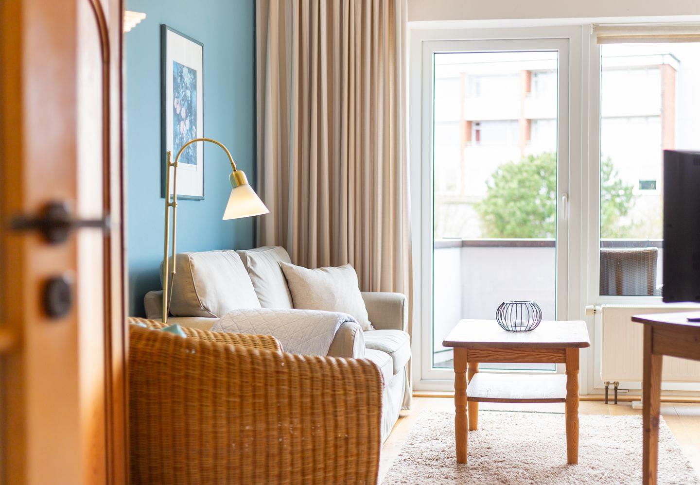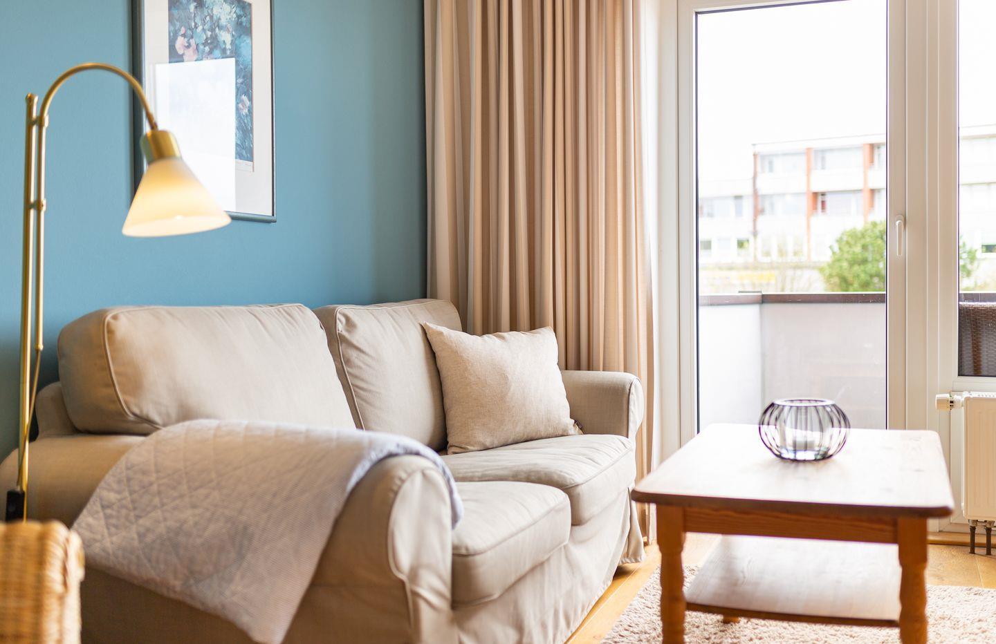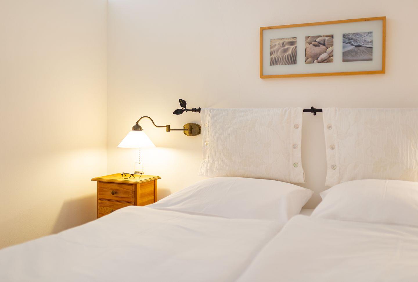 Die Wohnung verfügt über ein Wohnzimmer mit separatem Schlafzimmer mit Boxspringbett, eine voll ausgestattete Küche mit Geschirrspüler, ein Duschbad, einen Balkon mit Meerblick, Satelliten TV und WLAN.