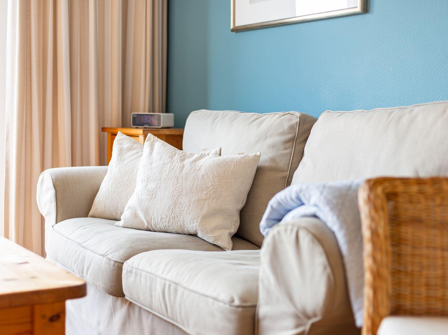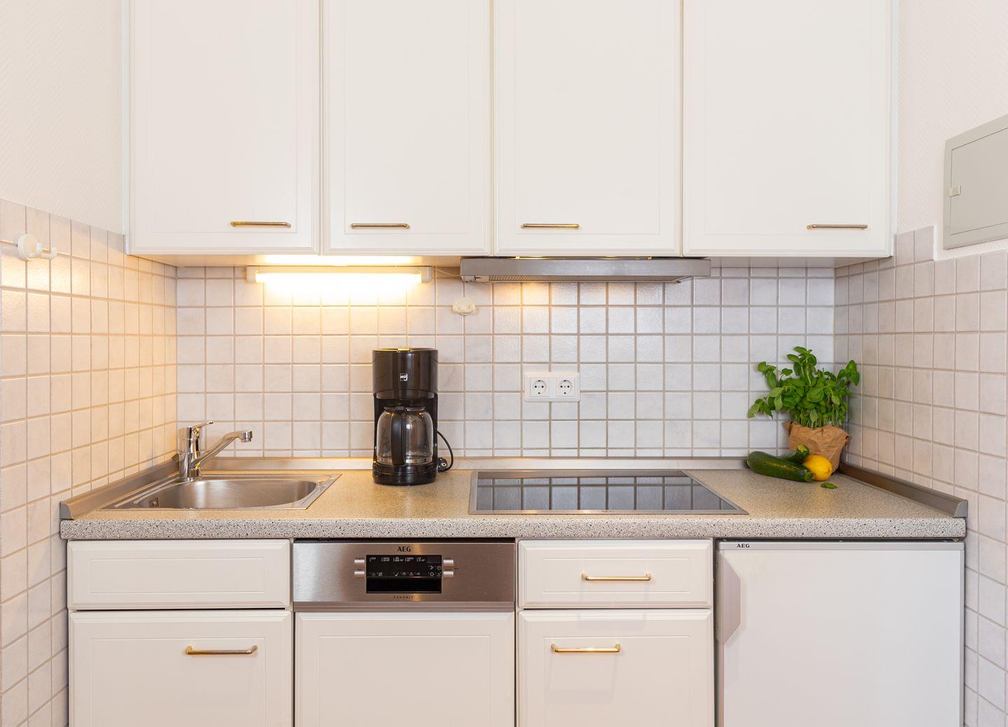 Die Wohnung verfügt über ein Wohnzimmer mit separatem Schlafzimmer mit Boxspringbett, eine voll ausgestattete Küche mit Geschirrspüler, ein Duschbad, einen Balkon mit Meerblick, Satelliten TV und WLAN.