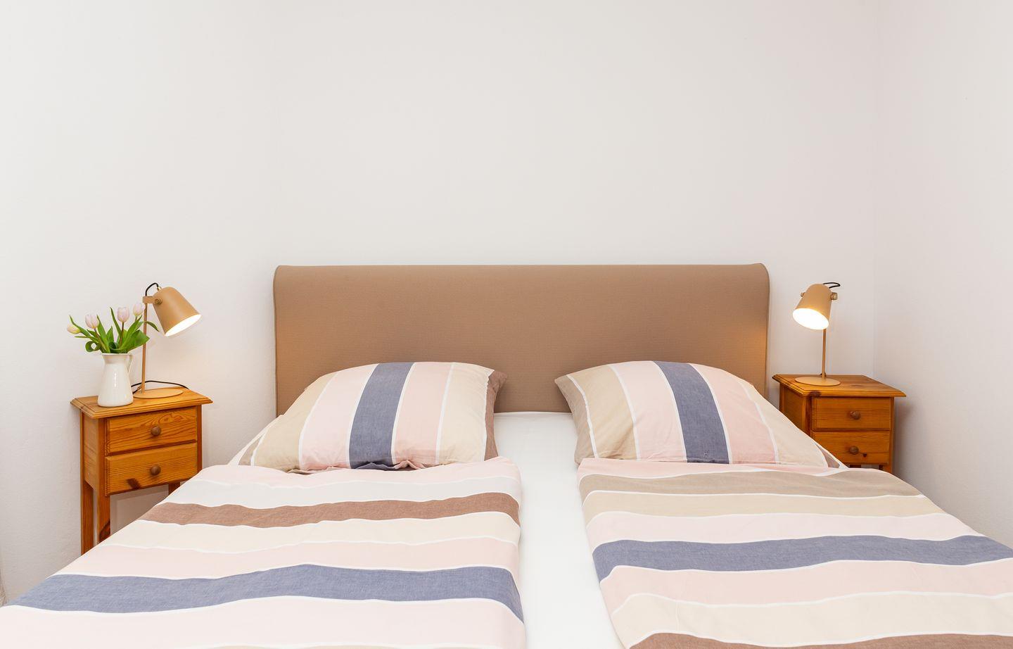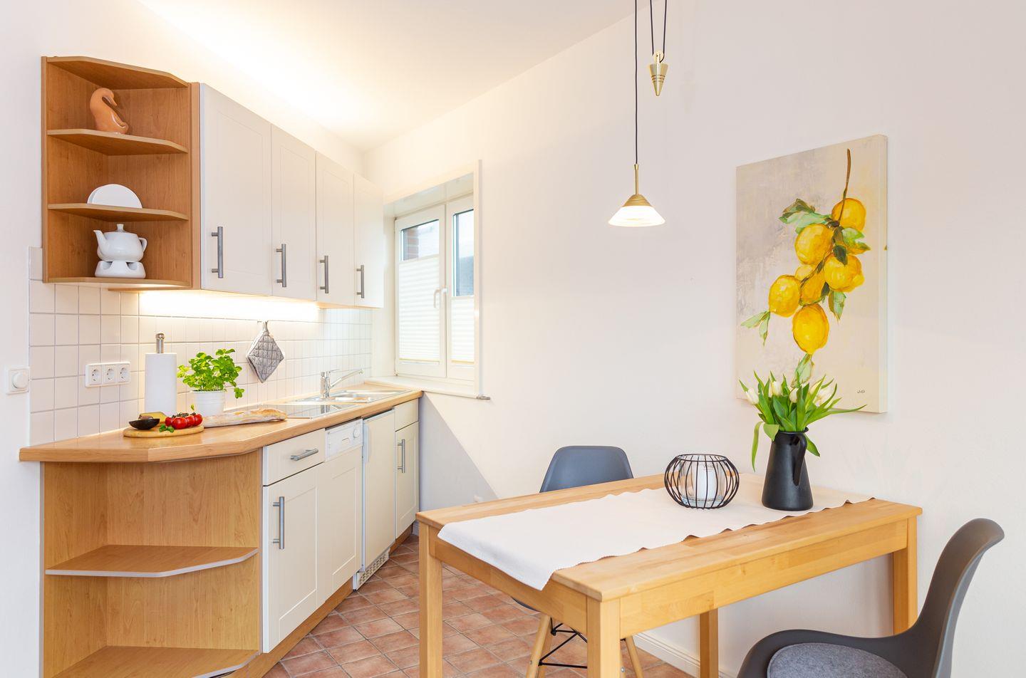 Die Wohnung verfügt über ein Wohnzimmer mit separatem Schlafzimmer mit Boxspringbett, eine voll ausgestattete Küche mit Geschirrspüler, ein Duschbad, einen Balkon, Satelliten TV und WLAN.