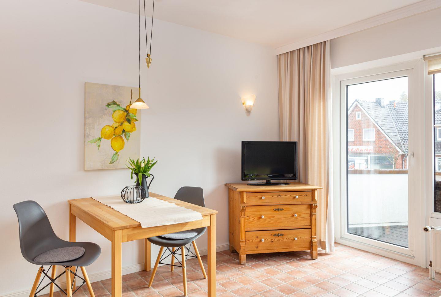 Die Wohnung 8 liegt in der ersten Etage im Ferienhaus Jungnamen Sand und zeigt Richtung Süosten. Es finden 2 Personen auf 55 qm geschmackvoll eingerichteter Wohnfläche genügend Platz.